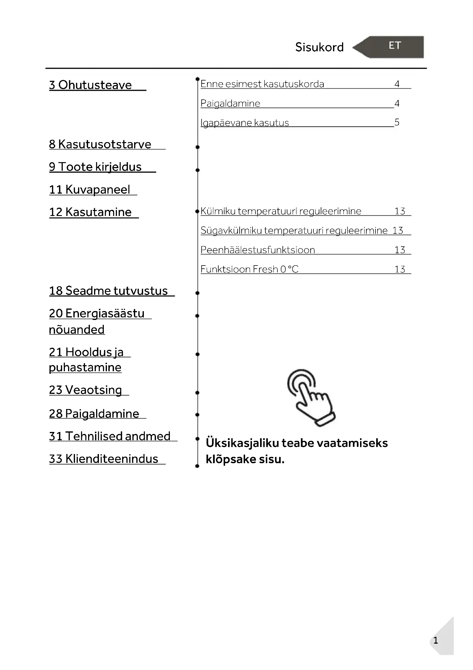 18 Seadme tutvustus Üksikasjaliku teabe vaatamiseks klõpsake sisu. 20 Energiasäästu nõuanded 21 Hooldus ja puhastamine 23 Veaotsing 28 Paigaldamine 31 Tehnilised andmed 33 KlienditeenindusAitäh!
