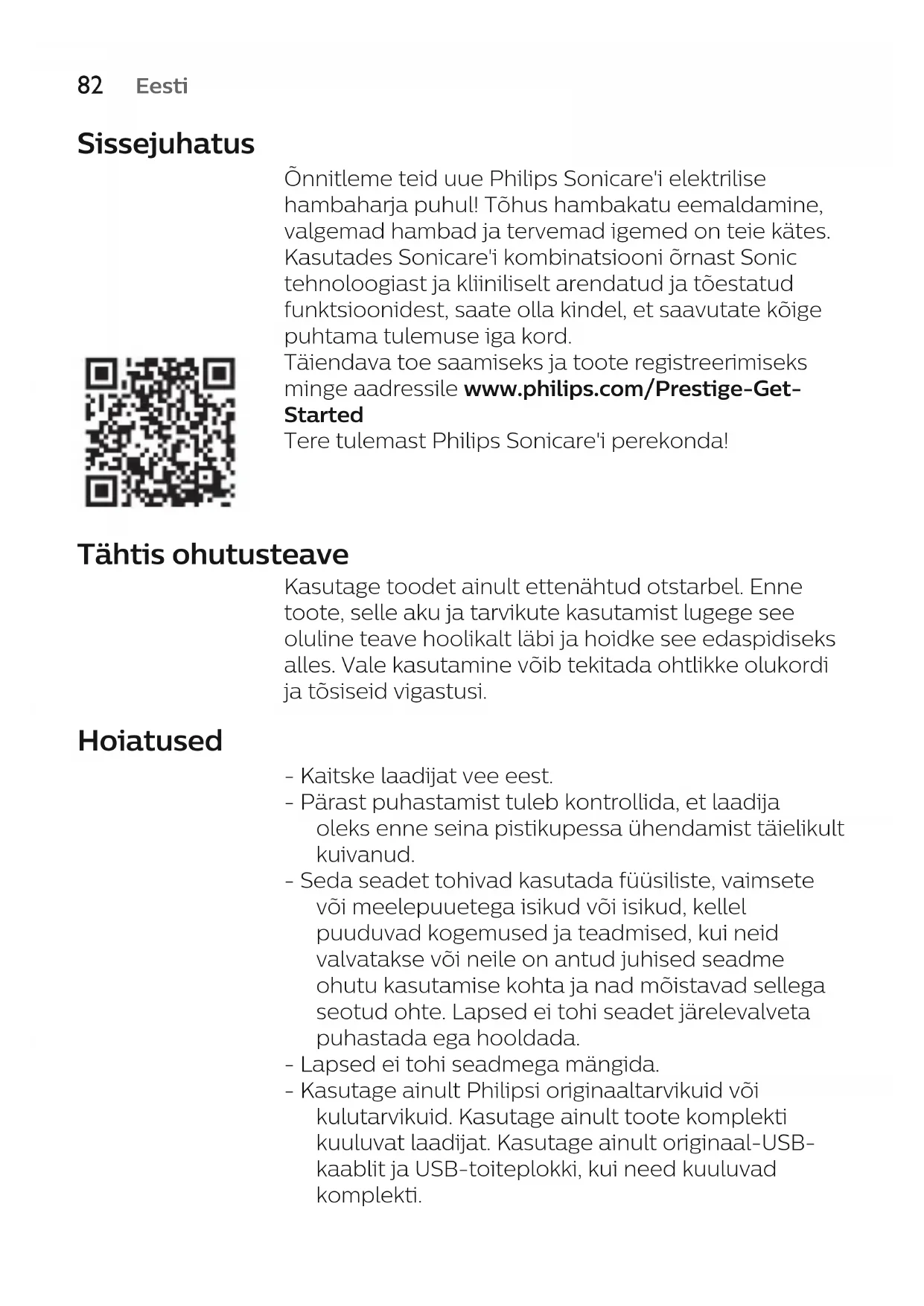 Eesti Sissejuhatus Õnnitleme teid uue Philips Sonicare'i elektrilise hambaharja puhul! Tõhus hambakatu eemaldamine, valgemad hambad ja tervemad igemed on teie kätes. Kasutades Sonicare'i kombinatsiooni õrnast Sonic tehnoloogiast ja kliiniliselt arendatud ja tõestatud funktsioonidest, saate olla kindel, et saavutate kõige puhtama tulemuse iga kord. Täiendava toe saamiseks ja toote registreerimiseks minge aadressile www.philips.com/Prestige-Get- Started Tere tulemast Philips Sonicare'i perekonda! Tähtis ohutusteave Kasutage toodet ainult ettenähtud otstarbel. Enne toote, selle aku ja tarvikute kasutamist lugege see oluline teave hoolikalt läbi ja hoidke see edaspidiseks alles. Vale kasutamine võib tekitada ohtlikke olukordi ja tõsiseid vigastusi. Hoiatused - Kaitske laadijat vee eest. - Pärast puhastamist tuleb kontrollida, et laadija oleks enne seina pistikupessa ühendamist täielikult kuivanud. - Seda seadet tohivad kasutada füüsiliste, vaimsete või meelepuuetega isikud või isikud, kellel puuduvad kogemused ja teadmised, kui neid valvatakse või neile on antud juhised seadme ohutu kasutamise kohta ja nad mõistavad sellega seotud ohte. Lapsed ei tohi seadet järelevalveta puhastada ega hooldada. - Lapsed ei tohi seadmega mängida. - Kasutage ainult Philipsi originaaltarvikuid või kulutarvikuid. Kasutage ainult toote komplekti kuuluvat laadijat. Kasutage ainult originaal-USB- kaablit ja USB-toiteplokki, kui need kuuluvad komplekti.83 Eesti - Sellel seadmel ei ole ühtki hooldatavat osa. Kui seade on kahjustunud, lõpetage selle kasutamine ja võtke ühendust kohaliku klienditeeninduskeskusega (vaadake 'Garantii ja tootetugi'). Kui juhe on kahjustunud, vahetage laadija uue vastu. - Laadijat ei tohi kasutada välistingimustes ega kuumade pindade läheduses. - Ärge peske toote osasid nõudepesumasinas. - See seade on ette nähtud vaid hammaste, igemete ja keele puhastamiseks. - Lõpetage seadme kasutamine ja pidage nõu hambaarsti/arstiga, kui pärast kasutamist esineb liigset veritsemist, kui veritsemine jätkub pärast 1. kasutusnädalat või kui tunnete ebamugavust või valu. - Kui teil on olnud viimase 2 kuu jooksul suuõõne või igemete operatsioon, pidage enne seadme kasutamist nõu hambaarstiga. - Kui kasutate südamestimulaatorit või muud implantaatseadet, võtke enne hambaharja kasutamist ühendust arsti või implantaadi tootjaga. - Kui teil on meditsiinilisi küsimusi, võtke enne seadme kasutamist ühendust oma arstiga. - See seade on personaalne hügieeniseade ega ole mõeldud üldiseks kasutamiseks hambaravikabinetis või -asutuses. - Lõpetage harjapea kasutamine, kui selle harjased on muljutud või paindunud. Vahetage harjapead iga 3 kuu tagant (kulumisjälgede korral varem). - Kui teie hambapasta sisaldab peroksiidi, söögisoodat või vesinikkarbonaati (levinud komponendid valgendavates hambapastades), peske harjapead pärast iga kasutamist põhjalikult seebi ja veega. Nii väldite plasti võimalikku pragunemist. - Vältige kokkupuudet eeterlike õlide või kookosõliga. Kokkupuute tagajärjel võivad harjased paigalt nihkuda.84 Eesti - Aku laadimiseks kasutage ainult USB- seinaadapterit, laadimisalust ja laadijaga reisivutlarit, mis on kaasas tootega: WAA1001, WAA2001, HX9200 või HX9200/B ja TCC1001, TCC2001, TCC3001, CBB1001 või CBB2001. Ärge kasutage pikendusjuhet. - Laadige, kasutage ja hoiustage toodet temperatuuril 0–40°C. - Hoidke toode ja akud eemal tulest ja ärge jätke neid otsese päikesevalguse või kõrge temperatuuri kätte. - Kui toode läheb ebatavaliselt kuumaks või eritab ebatavalist lõhna, muudab värvi või kui laadimine võtab tavapärasest kauem aega, lõpetage toote kasutamine ja laadimine ning võtke ühendust Philipsiga. - Ärge pange tooteid ja nende akusid mikrolaineahju või induktsioonpliitidele. - Akude kuumenemise või mürgiste või ohtlike ainete vabanemise vältimiseks ärge toodet ega akusid avage, muutke, augustage, kahjustage ega võtke osadeks lahti. Ärge akusid lühistage, üle laadige ega laadige pööratud polaarsusega. - Kahjustunud või lekkivate akude korral vältige nende kokkupuudet naha või silmadega. Kui see peaks juhtuma, siis loputage viivitamata rohke veega ja pöörduge arsti poole. Elektromagnetväljad (EMF) Käesolev Philips seade on vastavuses kõigi elektromagnetvälja mõju alla sattumist käsitlevate standardite ja määrustega. Raadiosideseadmete direktiiv Philips kinnitab käesolevaga, et raadiosagedusliku liidesega (Bluetooth või BrushSync) elektrilised hambaharjad vastavad direktiivi 2014/53/EL nõuetele. - Bluetoothi raadiosagedus: 2,4GHz - Bluetoothi maksimaalne raadiosageduslik võimsus: 3dBm - NFC raadiosagedus: 13,56MHz85 Eesti - NFC maksimaalne raadiosageduslik võimsus: 30,16dBm ELi vastavusdeklaratsiooni täielik tekst on veebilehel: www.philips.com/support Ettenähtud kasutamine Sonicare Prestige'i elektrilised hambaharjad on ette nähtud hammastelt hambakatu ja toidujääkide eemaldamiseks, et vähendada hammaste lagunemist ning parandada ja hoida suuõõne tervist. Prestige'i elektrilised hambaharjad on ette nähtud koduseks kasutamiseks. Lapsed tohivad neid kasutada täiskasvanute järelevalve all. Philips Sonicare 1 Hügieeniline reisikork 2 Esmaklassiline kõik-ühes-harjapea (A3) 3 BrushSynci sümbol 4 Käepide 5 Toitenupp 6 Intensiivsuse näidik ja varjatud nupp 7 SenseIQ näidik 8 Harjapea väljavahetamise meeldetuletuse näidik 9 Aku näidik 10 Harjamise tagasiside märgutuli 11 Laadimisalus 12 Laadimisalus 13 USB-A-seinaadapter 14 USB-C-juhe 15 Laadijaga reisivutlar 16 USB-C-pesa Märkus. Karbi sisu võib varieeruda vastavalt ostetud mudelile. Tootel võivad olla järgmised sümbolid: Lugege kasutusjuhendit.86 Eesti Eemaldatava toiteploki osa:„xxxxxx” tähistab kasutamiseks sobivat laadija mudeli numbrit. Rakendus Sonicare – alustamine Sonicare´i rakendus ühildub teie hambaharjaga, et pakkuda ühendatud kogemust. Sidudes hambaharja oma Sonicare´i rakend