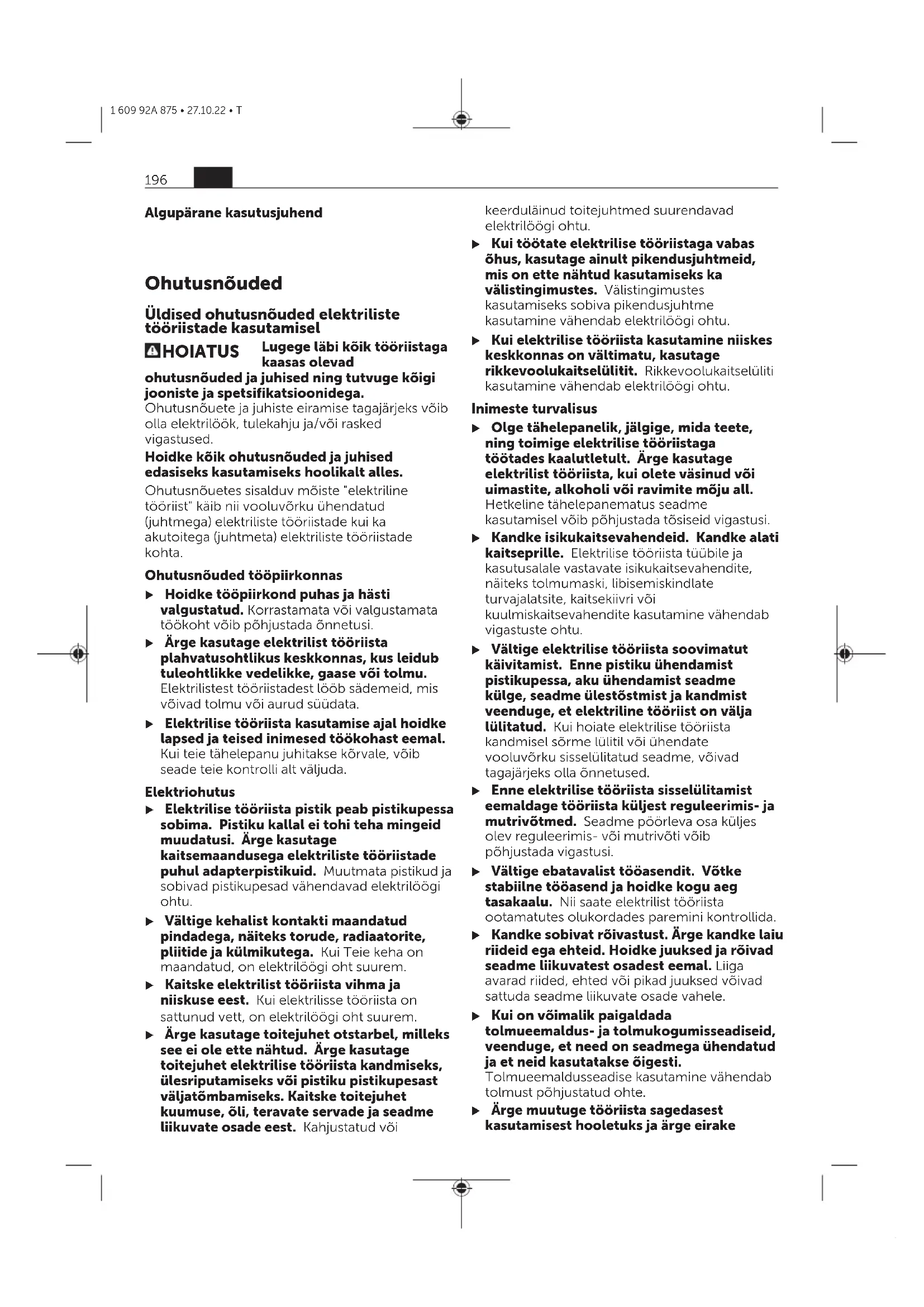 След въвеждането на продукта на британския пазар СЕ знакът губи своята валидност. Фирма FEIN декларира на своя отговорност, че този продукт отговаря на посочените реле- вантни разпоредби на последните страници от настоящата инструкция за експлоатация. Технически документи при: 194 bg 1 609 92A 875 • 27.10.22 • TC.&E.FeinGmbH, 73529 Schwäbisch Gmünd, Germany ТранспортиранеБългарски Препоръчителните литиево-йонни акумула- торни батерии трябва да изпълняват изисква- ния за транспортиране на опасни товари. Аку- мулаторните батерии могат да бъдат транс- портирани от потребителя на публични места без допълнителни разрешителни. При транспортиране от трети страни (напр. при въздушен транспорт или ползване на ку- риерски услуги) има специални изисквания към опаковането и обозначаването им. За цел- та при подготовката на пакетирането се кон- султирайте с експерт в съответната област. Изпращайте акумулаторни батерии само ако корпусът им не е повреден. Изолирайте отк- рити контактни клеми с лепящи ленти и опа- ковайте акумулаторните батерии така, че да не могат да се изместват в опаковката си. Мо- ля, спазвайте също и допълнителни национал- ни предписания. БракуванеБългарски Електроинструментите, акумулаторните бате- рии и допълнителните приспособления тряб- ва да бъдат предавани за оползотворяване на съдържащите се в тях суровини. Не изхвърляйте електроинструмен- ти и акумулаторни или обикновени батерии при битовите отпадъци! Само за страни отЕС:Български Съгласно европейска директива 2012/19/EС за старите електрически и електронни уреди и нейното транспортиране в националното право електроинструменти, които не могат да се ползват повече, а съгласно европейска ди- ректива 2006/66/EО повредени или изхабени обикновени или акумулаторни батерии, тряб- ва да се събират и предават за оползотворява- не на съдържащите се в тях суровини. При неправилно изхвърляне старите електри- чески и електронни уреди поради възможното наличие на опасни вещества могат да окажат вредни влияния върху околната среда и чо- вешкото здраве. Акумулаторни или обикновени батерии:Български Литиево-йонни: Моля, спазвайте указанията в раздела Транс- портиране (вж. „Транспортиране“, Страни- ца195). bg 195 1 609 92A 875 • 27.10.22 • TAlgupärane kasutusjuhend OhutusnõudedEesti Üldised ohutusnõuded elektriliste tööriistade kasutamiselEesti HOIATUS Lugege läbi kõik tööriistaga kaasas olevad ohutusnõuded ja juhised ning tutvuge kõigi jooniste ja spetsifikatsioonidega. Ohutusnõuete ja juhiste eiramise tagajärjeks võib olla elektrilöök, tulekahju ja/või rasked vigastused. Hoidke kõik ohutusnõuded ja juhised edasiseks kasutamiseks hoolikalt alles. Ohutusnõuetes sisalduv mõiste "elektriline tööriist" käib nii vooluvõrku ühendatud (juhtmega) elektriliste tööriistade kui ka akutoitega (juhtmeta) elektriliste tööriistade kohta. Ohutusnõuded tööpiirkonnasEesti u Hoidke tööpiirkond puhas ja hästi valgustatud. Korrastamata või valgustamata töökoht võib põhjustada õnnetusi. u Ärge kasutage elektrilist tööriista plahvatusohtlikus keskkonnas, kus leidub tuleohtlikke vedelikke, gaase või tolmu. Elektrilistest tööriistadest lööb sädemeid, mis võivad tolmu või aurud süüdata. u Elektrilise tööriista kasutamise ajal hoidke lapsed ja teised inimesed töökohast eemal. Kui teie tähelepanu juhitakse kõrvale, võib seade teie kontrolli alt väljuda. ElektriohutusEesti u Elektrilise tööriista pistik peab pistikupessa sobima. Pistiku kallal ei tohi teha mingeid muudatusi. Ärge kasutage kaitsemaandusega elektriliste tööriistade puhul adapterpistikuid. Muutmata pistikud ja sobivad pistikupesad vähendavad elektrilöögi ohtu. u Vältige kehalist kontakti maandatud pindadega, näiteks torude, radiaatorite, pliitide ja külmikutega. Kui Teie keha on maandatud, on elektrilöögi oht suurem. u Kaitske elektrilist tööriista vihma ja niiskuse eest. Kuielektrilisse tööriista on sattunud vett, on elektrilöögi oht suurem. u Ärge kasutage toitejuhet otstarbel, milleks see ei ole ette nähtud. Ärge kasutage toitejuhet elektrilise tööriista kandmiseks, ülesriputamiseks või pistiku pistikupesast väljatõmbamiseks. Kaitske toitejuhet kuumuse, õli, teravate servade ja seadme liiku