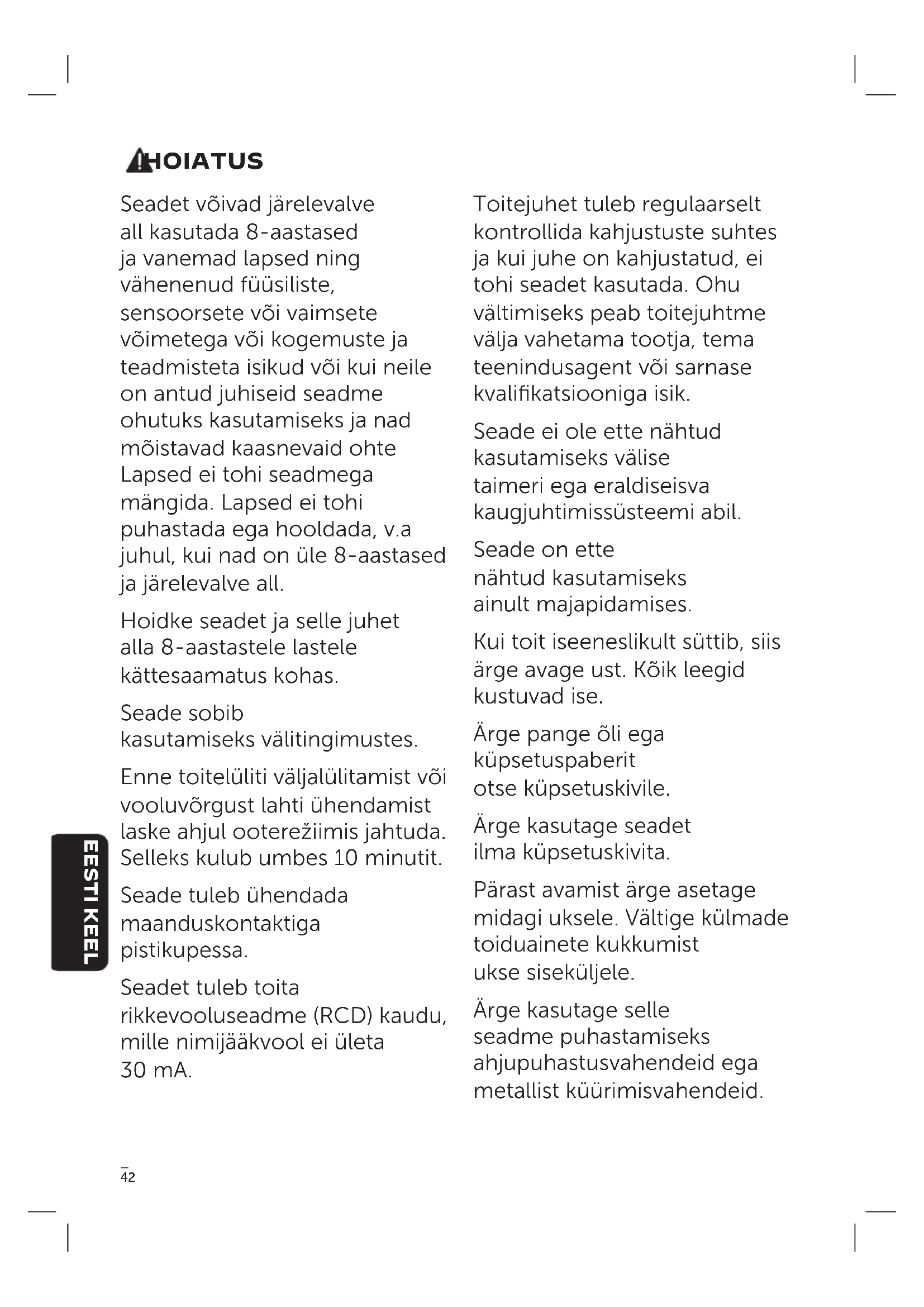 HOIATUS Seadet võivad järelevalve all kasutada 8-aastased ja vanemad lapsed ning vähenenud füüsiliste, sensoorsete või vaimsete võimetega või kogemuste ja teadmisteta isikud või kui neile on antud juhiseid seadme ohutuks kasutamiseks ja nad mõistavad kaasnevaid ohte Lapsed ei tohi seadmega mängida. Lapsed ei tohi puhastada ega hooldada, v.a juhul, kui nad on üle 8-aastased ja järelevalve all. Hoidke seadet ja selle juhet alla 8-aastastele lastele kättesaamatus kohas. Seade sobib kasutamiseks välitingimustes. Enne toitelüliti väljalülitamist või vooluvõrgust lahti ühendamist laske ahjul ooterežiimis jahtuda. Selleks kulub umbes 10 minutit. Seade tuleb ühendada maanduskontaktiga pistikupessa. Seadet tuleb toita rikkevooluseadme (RCD) kaudu, mille nimijääkvool ei ületa 30 mA. Toitejuhet tuleb regulaarselt kontrollida kahjustuste suhtes ja kui juhe on kahjustatud, ei tohi seadet kasutada. Ohu vältimiseks peab toitejuhtme välja vahetama tootja, tema teenindusagent või sarnase kvalifikatsiooniga isik. Seade ei ole ette nähtud kasutamiseks välise taimeri ega eraldiseisva kaugjuhtimissüsteemi abil. Seade on ette nähtud kasutamiseks ainult majapidamises. Kui toit iseeneslikult süttib, siis ärge avage ust. Kõik leegid kustuvad ise. Ärge pange õli ega küpsetuspaberit otse küpsetuskivile. Ärge kasutage seadet ilma küpsetuskivita. Pärast avamist ärge asetage midagi uksele. Vältige külmade toiduainete kukkumist ukse siseküljele. Ärge kasutage selle seadme puhastamiseks ahjupuhastusvahendeid ega metallist küürimisvahendeid. EESTI KEEL43 Ärge kasutage selle seadme puhastamiseks voolikut ega survepesurit Hoidke ahju sees ainult küpsetuskivi. Ärge toetuge ahjule ega asetage esemeid selle peale. See seade on ette nähtud kasutamiseks kuni 3000 m kõrgusel merepinnast. See seade muutub kasutamise ajal kuumaks. Ärge puudutage kuumi pindu. Kasutage käepidemeid või nuppe. Kaitske oma käsi alati libisemiskindlate ahjukinnastega vms. EESTI KEEL44