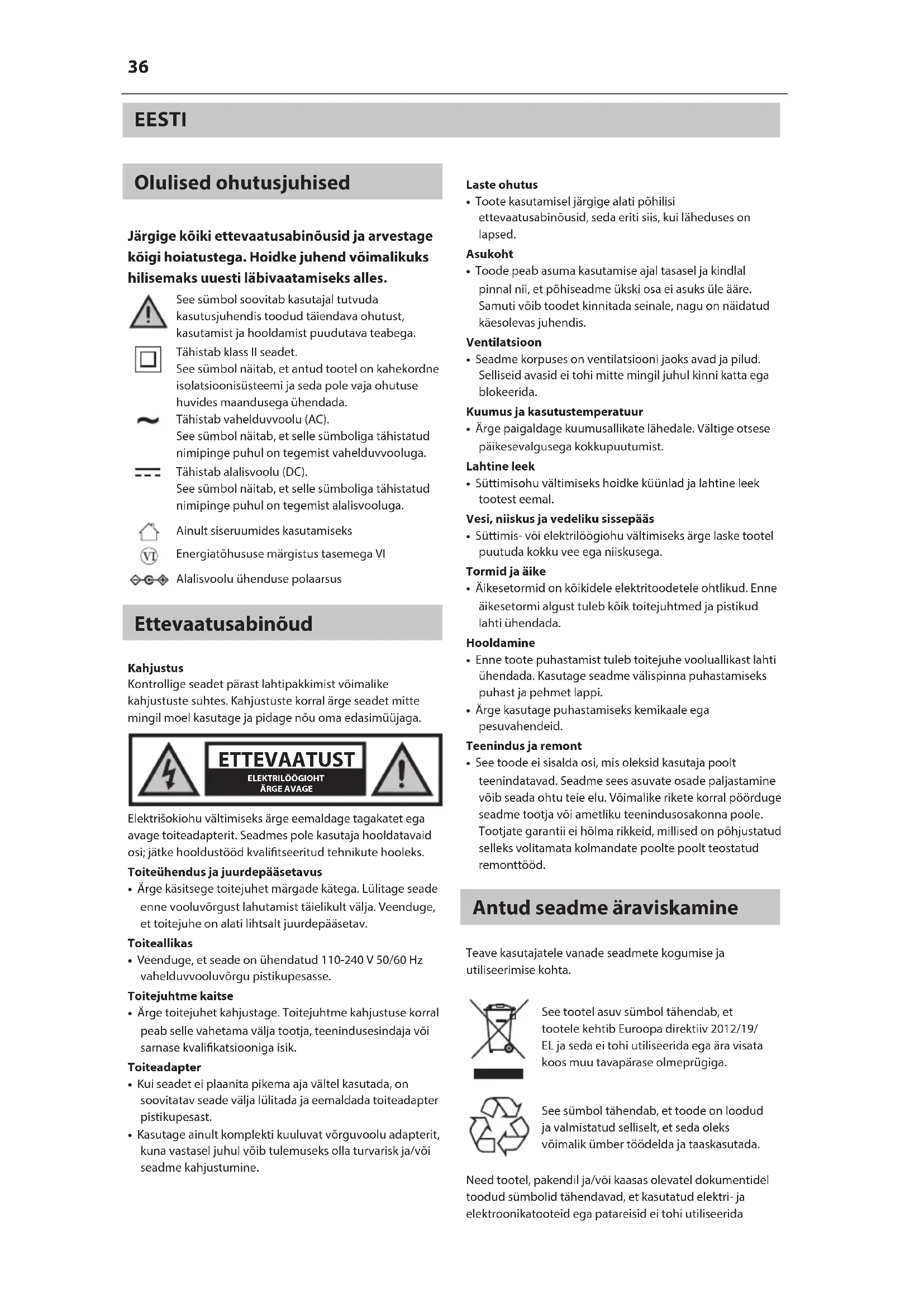 See sümbol soovitab kasutajal tutvuda kasutusjuhendis toodud täiendava ohutust, kasutamist ja hooldamist puudutava teabega.Tähistab klass II seadet.See sümbol näitab, et antud tootel on kahekordne isolatsioonisüsteemi ja seda pole vaja ohutuse huvides maandusega ühendada.Tähistab vahelduvvoolu (AC).See sümbol näitab, et selle sümboliga tähistatud nimipinge puhul on tegemist vahelduvvooluga.Tähistab alalisvoolu (DC). See sümbol näitab, et selle sümboliga tähistatud nimipinge puhul on tegemist alalisvooluga.Ainult siseruumides kasutamiseksEnergiatõhususe märgistus tasemega VIAlalisvoolu ühenduse polaarsus Ettevaatusabinõud KahjustusKontrollige seadet pärast lahtipakkimist võimalike kahjustuste suhtes. Kahjustuste korral ärge seadet mitte mingil moel kasutage ja pidage nõu oma edasimüüjaga. ETTEVAATUST ELEKTRILÖÖGIOHTÄRGE AVAGEElektrišokiohu vältimiseks ärge eemaldage tagakatet ega avage toiteadapterit. Seadmes pole kasutaja hooldatavaid osi; jätke hooldustööd kvalitseeritud tehnikute hooleks.Toiteühendus ja juurdepääsetavus• Ärge käsitsege toitejuhet märgade kätega. Lülitage seade enne vooluvõrgust lahutamist täielikult välja. Veenduge, et toitejuhe on alati lihtsalt juurdepääsetav.Toiteallikas• Veenduge, et seade on ühendatud 110-240V 50/60Hz vahelduvvooluvõrgu pistikupesasse.Toitejuhtme kaitse• Ärge toitejuhet kahjustage. Toitejuhtme kahjustuse korral peab selle vahetama välja tootja, teenindusesindaja või sarnase kvalikatsiooniga isik.Toiteadapter• Kui seadet ei plaanita pikema aja vältel kasutada, on soovitatav seade välja lülitada ja eemaldada toiteadapter pistikupesast.• Kasutage ainult komplekti kuuluvat võrguvoolu adapterit, kuna vastasel juhul võib tulemuseks olla turvarisk ja/või seadme kahjustumine.Laste ohutus• Toote kasutamisel järgige alati põhilisi ettevaatusabinõusid, seda eriti siis, kui läheduses on lapsed.Asukoht• Toode peab asuma kasutamise ajal tasasel ja kindlal pinnal nii, et põhiseadme ükski osa ei asuks üle ääre. Samuti võib toodet kinnitada seinale, nagu on näidatud käesolevas juhendis.Ventilatsioon• Seadme korpuses on ventilatsiooni jaoks avad ja pilud. Selliseid avasid ei tohi mitte mingil juhul kinni katta ega blokeerida.Kuumus ja kasutustemperatuur• Ärge paigaldage kuumusallikate lähedale. Vältige otsese päikesevalgusega kokkupuutumist.Lahtine leek• Süttimisohu vältimiseks hoidke küünlad ja lahtine leek tootest eemal.Vesi, niiskus ja vedeliku sissepääs• Süttimis- või elektrilöögiohu vältimiseks ärge laske tootel puutuda kokku vee ega niiskusega.Tormid ja äike• Äikesetormid on kõikidele elektritoodetele ohtlikud. Enne äikesetormi algust tuleb kõik toitejuhtmed ja pistikud lahti ühendada.Hooldamine• Enne toote puhastamist tuleb toitejuhe vooluallikast lahti ühendada. Kasutage seadme välispinna puhastamiseks puhast ja pehmet lappi.• Ärge kasutage puhastamiseks kemikaale ega pesuvahendeid.Teenindus ja remont• See toode ei sisalda osi, mis oleksid kasutaja poolt teenindatavad. Seadme sees asuvate osade paljastamine võib seada ohtu teie elu. Võimalike rikete korral pöörduge seadme tootja või ametliku teenindusosakonna poole. Tootjate garantii ei hõlma rikkeid, millised on põhjustatud selleks volitamata kolmandate poolte poolt teostatud remonttööd. Antud seadme äraviskamine Teave kasutajatele vanade seadmete kogumise ja utiliseerimise kohta.See tootel asuv sümbol tähendab, et tootele kehtib Euroopa direktiiv 2012/19/EL ja seda ei tohi utiliseerida ega ära visata koos muu tavapärase olmeprügiga.See sümbol tähendab, et toode on loodud ja valmistatud selliselt, et seda oleks võimalik ümber töödelda ja taaskasutada.Need tootel, pakendil ja/või kaasas olevatel dokumentidel toodud sümbolid tähendavad, et kasutatud elektri- ja elektroonikatooteid ega patareisid ei tohi utiliseeridaET koos tavalise olmeprügiga. Kodused kasutajad peaksid toote keskkonnasõbraliku utiliseerimise võimaluste teada saamiseks pöörduma kas kaupluse poole, kust nad toote ostsid, või kohaliku omavalitsuse poole. CE ja UKCA avaldus