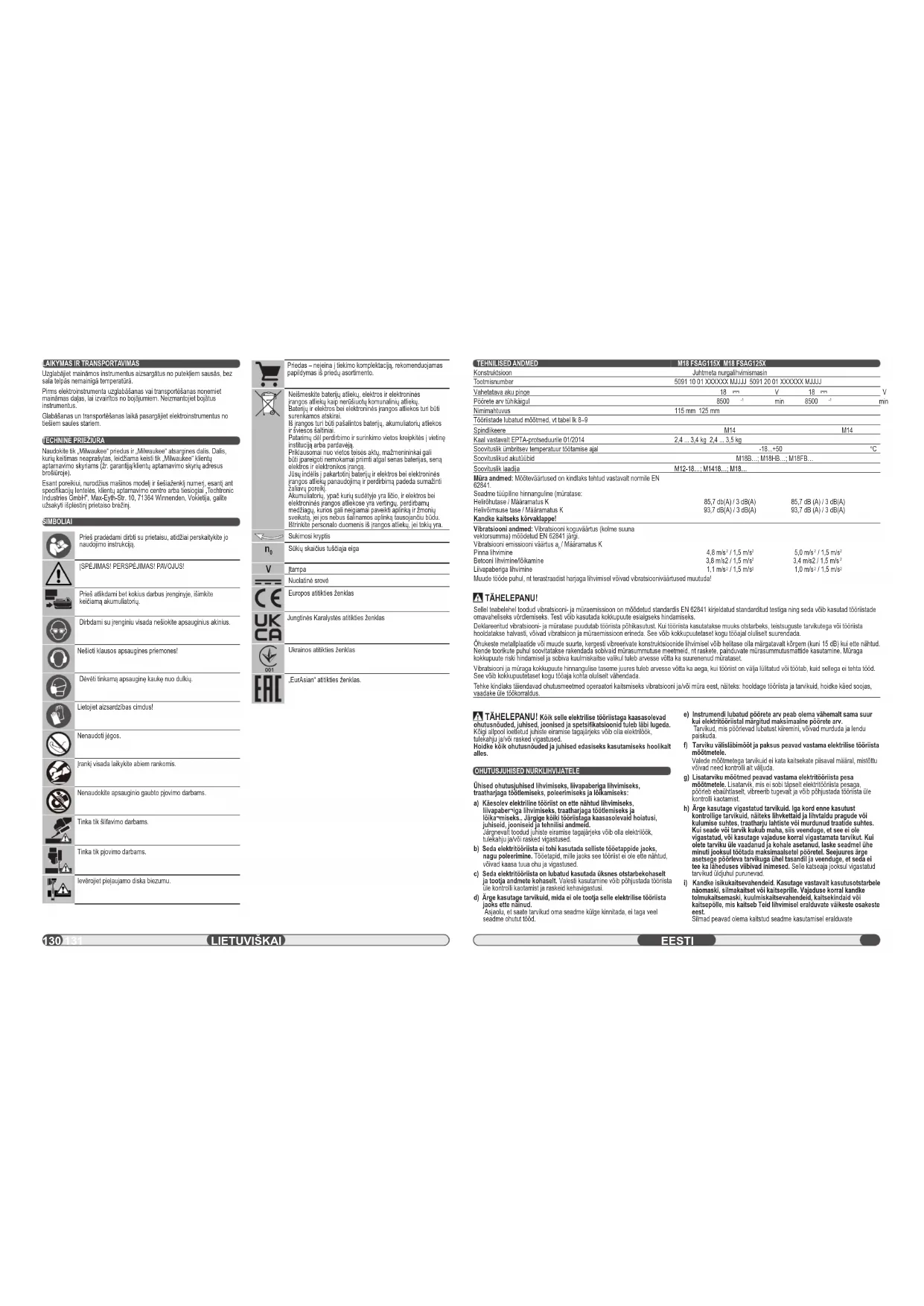 Hoiustage kasutatavaid tööriistu tolmu eest kaitstult kuivas ja roostet mittetekitavas ruumis ühtlase temperatuuri juures. Enne elektritööriista hoiule panemist või transportimist eemaldage kahjustuste vältimiseks tarvikud. Ärge kasutage kahjustatud tööriistu. Kaitske elektritööriistu hoiustamisel ja transpordil otsese päikesekiirguse eest. HOOLDUS Kasutage ainult Milwaukee tarvikuid ja Milwaukee tagavaraosi. Detailid, mille väljavahetamist pole kirjeldatud, laske välja vahetada Milwaukee klienditeeninduspunktis (vaadake brošüüri garantii / klienditeeninduste aadressid). Vajadusel saab nõuda seadme plahvatusjoonise võimsussildil oleva masinatüübi ja kuuekohalise numbri alusel klienditeeninduspunktist või vahetult fi rmalt Techtronic Industries GmbH, Max-Eyth-Straße 10, 71364 Winnenden, Germany. SÜMBOLID Palun lugege enne käikulaskmist kasutamisjuhend hoolikalt läbi. TÄHELEPANU! HOIATUS! OHT! Enne kõiki töid masina kallal võtke vahetatav aku välja. Masinaga töötades kandke alati kaitseprille. Kandke kaitseks kõrvaklappe! Kanda sobivat kaitsemaski. Kanda kaitsekindaid! Ärge kasutage jõudu. Liigutage tööriista alati mõlema käega. Ärge kasutage kettakaitset lõikamistöödeks. Ainult lihvimistöödeks. Ainult lõikamistöödeks. Pidage silmas lubatud kettapaksust. Tarvikud - ei kuulu tarne komplekti, soovitatav täiendus on saadaval tarvikute programmis. Ärge kõrvaldage patareide, elektri- ja elektroonikaseadmete jäätmeid sorteerimata olmejäätmetena. Akude, elektri- ja elektroonikaseadmete jäätmed tuleb koguda eraldi. Akude, akumulaatorite ja valgusallikate jäätmed tuleb seadmetest eemaldada. Küsige oma kohalikust omavalitsusest või jaemüüjalt nõuandeid ringlussevõtu ja kogumispunkti kohta. Olenevalt kohalikest määrustest võib jaemüüjal lasuda kohustus võtta akude, elektri- ja elektroonikaseadmeid vastu tasuta. Teie panus akude, elektri- ja elektroonikaseadmete jäätmete korduskasutusse ja ringlussevõttu aitab vähendada nõudlust toorainete järele. Akud, eriti liitiumakud ning elektri- ja elektroonikaseadmete jäätmed, sisaldavad väärtuslikke taaskasutatavaid materjale, mis võivad kahjustada keskkonda ja inimeste tervist, kui neid ei kõrvaldata keskkonnasõbralikul viisil. Kustutage kõrvaldatavatest seadmetest isiklikud andmed, kui neid seal on. Pöörlemissuund