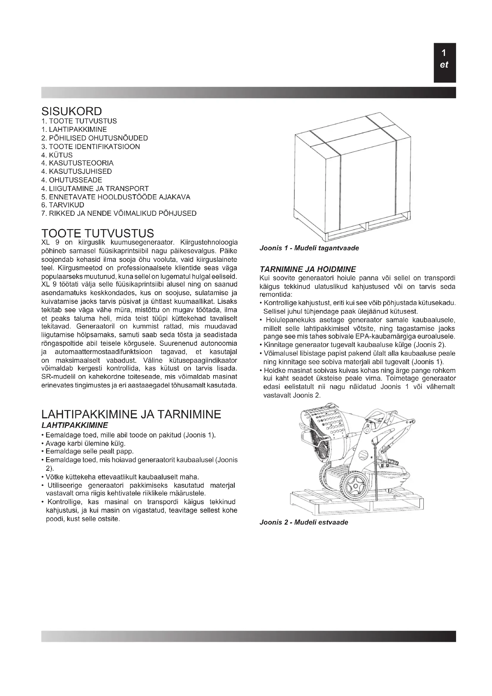 TOOTE TUTVUSTUS XL 9 on kiirguslik kuumusegeneraator. Kiirgustehnoloogia põhineb sarnasel füüsikaprintsiibil nagu päikesevalgus. Päike soojendab kehasid ilma sooja õhu vooluta, vaid kiirguslainete teel. Kiirgusmeetod on professionaalsete klientide seas väga populaarseks muutunud, kuna sellel on lugematul hulgal eeliseid. XL 9 töötati välja selle füüsikaprintsiibi alusel ning on saanud asendamatuks keskkondades, kus on soojuse, sulatamise ja kuivatamise jaoks tarvis püsivat ja ühtlast kuumaallikat. Lisaks tekitab see väga vähe müra, mistõttu on mugav töötada, ilma et peaks taluma heli, mida teist tüüpi küttekehad tavaliselt tekitavad. Generaatoril on kummist rattad, mis muudavad liigutamise hõlpsamaks, samuti saab seda tõsta ja seadistada rõngaspoltide abil teisele kõrgusele. Suurenenud autonoomia ja automaattermostaadifunktsioon tagavad, et kasutajal on maksimaalselt vabadust. Väline kütusepaagiindikaator võimaldab kergesti kontrollida, kas kütust on tarvis lisada. SR-mudelil on kahekordne toiteseade, mis võimaldab masinat erinevates tingimustes ja eri aastaaegadel tõhusamalt kasutada.