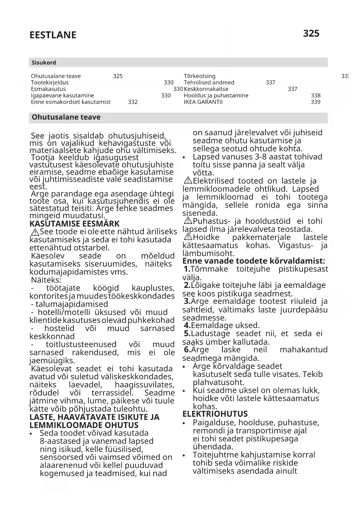 Ohutusalane teave 325 Tootekirjeldus 330 Esmakasutus 330 Igapäevane kasutamine 330 Enne esmakordset kasutamist 332 Sisukord Tõrkeotsing 333 Tehnilised andmed 337 Keskkonnakaitse 337 Hooldus ja puhastamine 338 IKEA GARANTII 339 Ohutusalane teave See jaotis sisaldab ohutusjuhiseid, mis on vajalikud kehavigastuste või materiaalsete kahjude ohu vältimiseks. Tootja keeldub igasugusest vastutusest käesolevate ohutusjuhiste eiramise, seadme ebaõige kasutamise või juhtimisseadiste vale seadistamise eest. Ärge parandage ega asendage ühtegi toote osa, kui kasutusjuhendis ei ole sätestatud teisiti. Ärge tehke seadmes mingeid muudatusi.