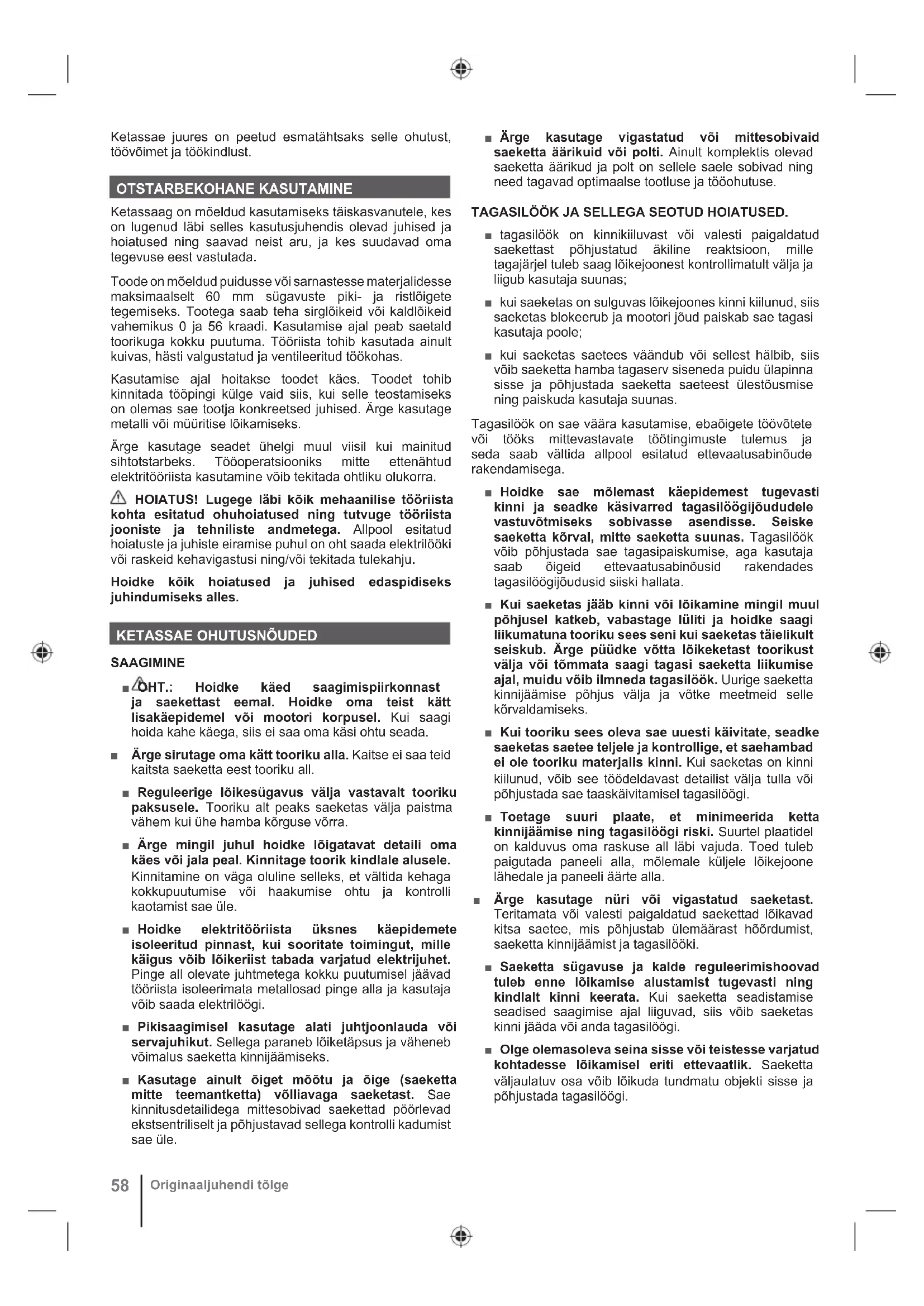 HOOLDUS ■ Seade ei tohi mingil juhul olla toitepinge all sel ajal kui kinnitate selle osi, teete reguleerimistoiminguid, puhastate või hooldate seadet ning siis kui seda ei kasutata. Toote eemaldamine toitevõrgust hoiab ära ootamatu käivitumise, mis võib põhjustada raskeid vigastusi. ■ Kasutage teenindamisel ainult tootja originaalvaruosi, tarvikuid ja tööorganeid. Muude osade kasutamine võib tekitada ohuolukorra ja põhjustada seadme EESTI