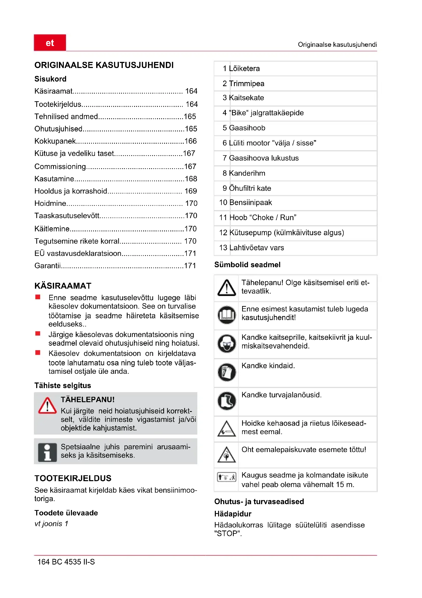 Lisatarvik lõiketera Lisatarvik trimmipea Lisatarvik kanderihm Art. nr. 112405 Art. nr. 112406 Art. nr. 411705 OHUTUSJUHISED Seadet tohib kasutada ainult laitmatus tehni- lises seisukorras Ärge muutke ohutus- ja kaitseseadmeid ka- sutuskõlbmatuks Seadet ei tohi käitada teiste lõikeriistade ega lisaseadmetega. Kandke otstarbekohast tööriietust: pikki pükse, tugevaid jalanõusid, kindaid. kaitsekiivrit, kaitseprille, kuulmis- kaitsevahendeid. Seiske töötamisel kindlas asendis. Ärge käsitsege seadet, kui olete alkoholi, nar- kootikumide või ravimite mõju all. Käsitsege seadet alati mõlema käega. Hoidke käepidemed kuivad ja puhtad. Hoidke kehaosad ja riietus lõikeseadmest ee- mal. Hoidke kõrvalised isikud ohualast eemal. Eemaldage võõrkehad tööpiirkonnast. Hoidke kaitseplaat, trimmipea ja mootor alati niitmisjääkidest puhas.et Ohutusjuhised 166 BC 4535 II-S Seadme juurest lahkumisel: Lülitage mootor välja Oodake kuni lõikurid on seiskunud Ärge jätke seadet kunagi järelevalveta. Lapsed või teised inimesed, kes ei tunne ka- sutusjuhendit, ei või seadet kasutada Enne kasutamist kontrollige kõigi kruvide, mutrite ja poltide kindlat kinnitatust seadmel. Enne seadme või lõiketera transportimist või hoiule asetamist pange terakaitse alati peale. KOKKUPANEK TÄHELEPANU! Seadet võib käitada alles pärast täielikult kokkupanekut. „Bike“ jalgratta käepide paigaldamine vt joonis 2