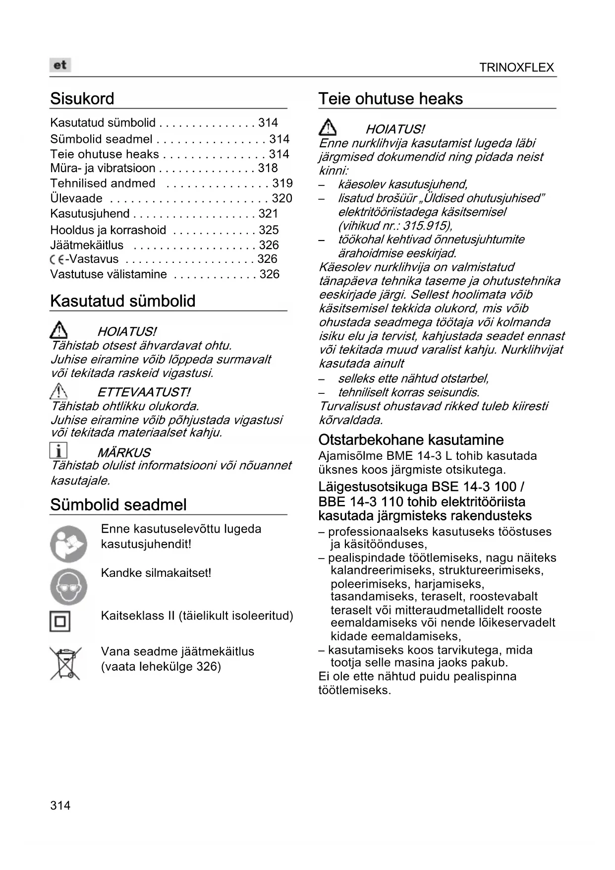 - Vastutuse välistamine Kasutatud sümbolid HOIATUS! Tähistab otsest ähvardavat ohtu. Juhise eiramine võib lõppeda surmavalt või tekitada raskeid vigastusi. ETTEVAATUST! Tähistab ohtlikku olukorda. Juhise eiramine võib põhjustada vigastusi või tekitada materiaalset kahju. MÄRKUS Tähistab olulist informatsiooni või nõuannet kasutajale. Sümbolid seadmel Enne kasutuselevõttu lugeda kasutusjuhendit!Kandke silmakaitset!Kaitseklass II (täielikult isoleeritud)Vana seadme jäätmekäitlus (vaata lehekülge 326) Teie ohutuse heaks HOIATUS! Enne nurklihvija kasutamist lugeda läbi järgmised dokumendid ning pidada neist kinni: p. 326