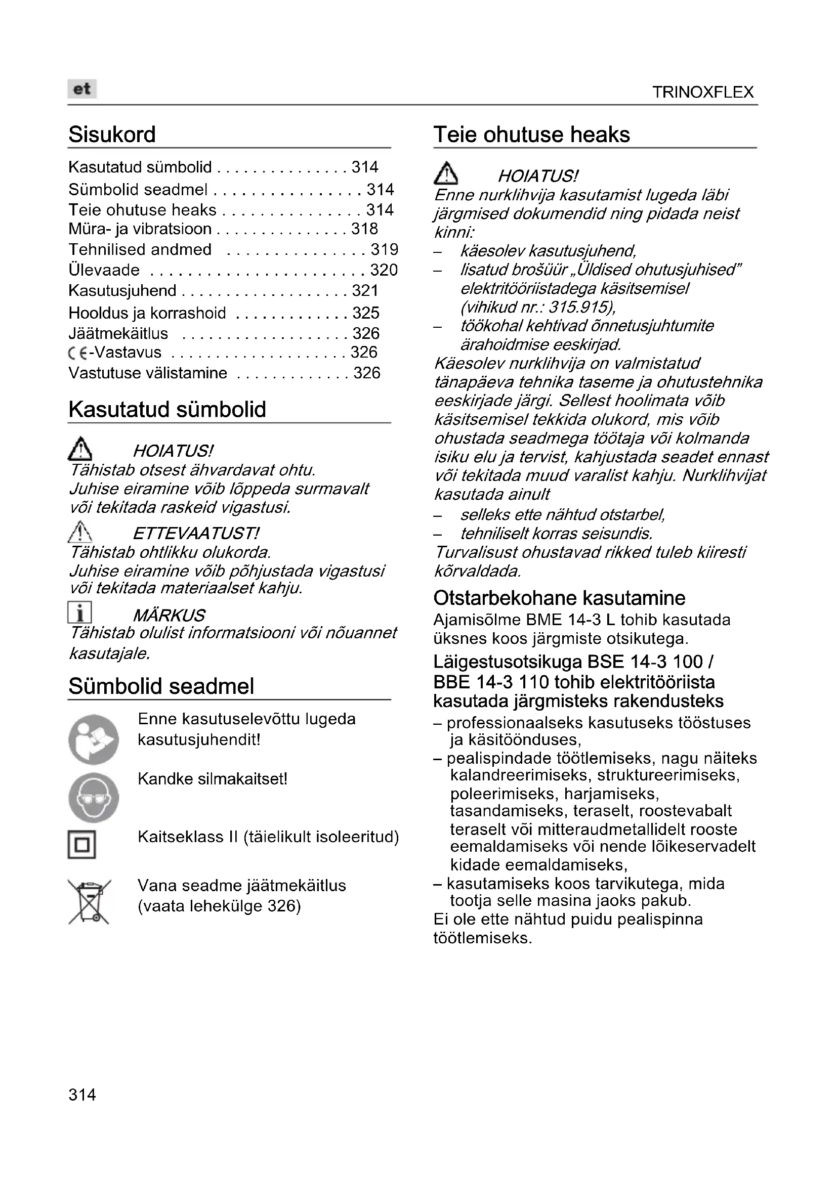 Mitte töödelda materjali, mis eraldab tervistkahjustavaid aineid (nt asbesti). Kunagi ei tohi lihvida ega lõigata kerg- metalle, mille magneesiumi sisaldus on suurem kui 80%. Tuleoht! Välistingimustes või tugeva metalltolmu käes töötamisel ühendada seade rikke- voolukaitselülitiga, mille käivitusvool on maksimaalselt 30 mA. Mitte kasutada kulunud ja rebenenud lihvlinte või lihvlinte, mis on lihvimistolmu täis. Kahjustunud lihvlindid võivad rebeneda, õhku paiskuda ja kedagi vigastada. Enne kasutamist kontrollida, et lihvimis- tarvikud on õigesti paigaldatud ja kinni- tatud. Lülitada seade 30 sekundiks ilma koormuseta sisse! Katkestada proovikäivitus kohe, kui tarvik vibreerib tugevalt või ilmnevad muud puudused. Põhjuse kindlakstegemiseks kontrollida masin üle. Elektritööriista ei tohi üle koormata nii, et see seisma jääb või lihvlint hakkab läbi libisema. Enne elektritööriista käest ära panemist lülitada see välja ja oodata, kuni see on täielikult seiskunud. Elektritööriista ei tohi kinnitada kruu- stangide vahele. Võrgukaabel peab jääma elektritööriistast alati tahapoole. Kui töödeldav detail on kinnitamata või see ei seisa ise oma raskuse tõttu paigal, tuleb see kinnitada. Lihvimisseadmeid hoiustada ja käsitseda tootjafirma juhiste kohaselt. Ohutusalane lisateave Kasutada ainult välitingimuste jaoks ettenähtud pikendusjuhet. Seadme tähistamiseks kasutada ainult kleebiseid. Mitte puurida korpusesse auke. Andmeplaadile märgitud pinge peab vastama kohalikule võrgupingele. Müra- ja vibratsioon MÄRKUS A-sageduskorrektsiooniga mürataseme väärtused ja vibratsiooni koguväärtused on antud tabelis „Tehnilised andmed“. Müra- ja vibratsiooni näitajad on saadud EN 62841 kohaselt. ETTEVAATUST! Antud mõõteväärtused kehtivad uute sead- mete kohta. Igapäevases töös müra- ja vibratsiooni näitajad muutuvad. MÄRKUS Käesolevas õpetuses antud vibratsiooni tase on mõõdetud juhendi EN 62841 standarditud mõõtmismeetodi järgi ning seda võib kasutada elektriliste tööriistade omavaheliseks võrdlemiseks. Sobib ka vibratsiooni koormuse esialgseks hindamiseks. Antud vibratsiooni tase kehtib elektrilise tööriista jaoks ette nähtud kasutuste kohta. Kui elektrilist tööriista kasutatakse muuks otstarbeks, muude tarvikutega või ei hooldata nõuetele vastavalt, võivad tekkida kõrvalekalded nimetatud vibratsiooni tasemest. Vibratsiooni koormus võib kogu tööaja lõikes tunduvalt suureneda. Vibratsiooni koormuse täpsel hindamisel tuleks arvestada ka aegu, mil tööriist on välja lülitatud või küll käib, ent sellega ei töötata. See võib vibratsiooni koormust kogu tööaja lõikes tunduvat vähendada. Määrake kindlaks täiendavad kaitsemeet- med kasutaja kaitsmiseks vibratsiooni mõju eest, nt elektrilise tööriista ja tarvikute hool- damine, organiseeritud tööprotsesside korraldamine, püüda alati hoida käed soojad. ETTEVAATUST! Kui helirõhk on üle 85 dB(A), tuleb kanda kuulmiskaitset.TRINOXFLEX