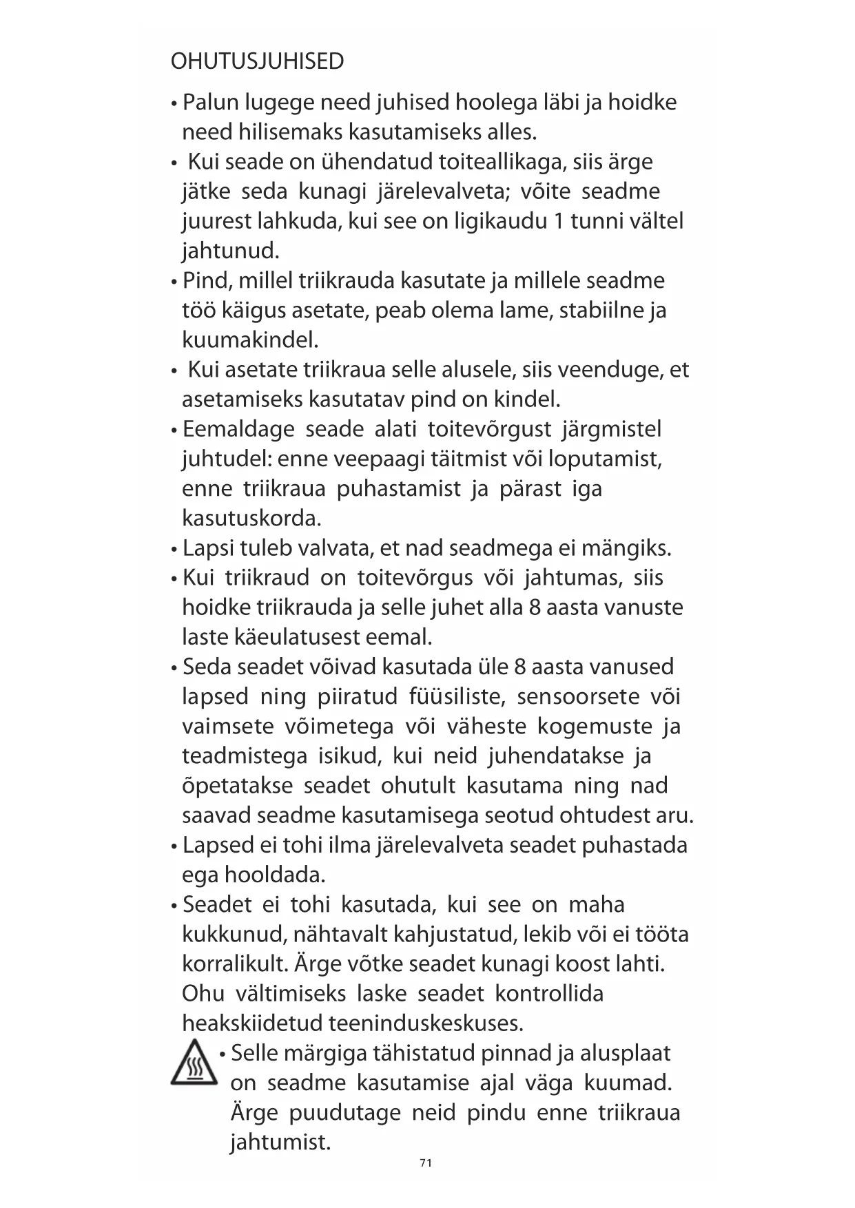 - Kui triikraud on toitevõrgus või jahtumas, siis hoidke triikrauda ja selle juhet alla 8 aasta vanuste laste käeulatusest eemal.