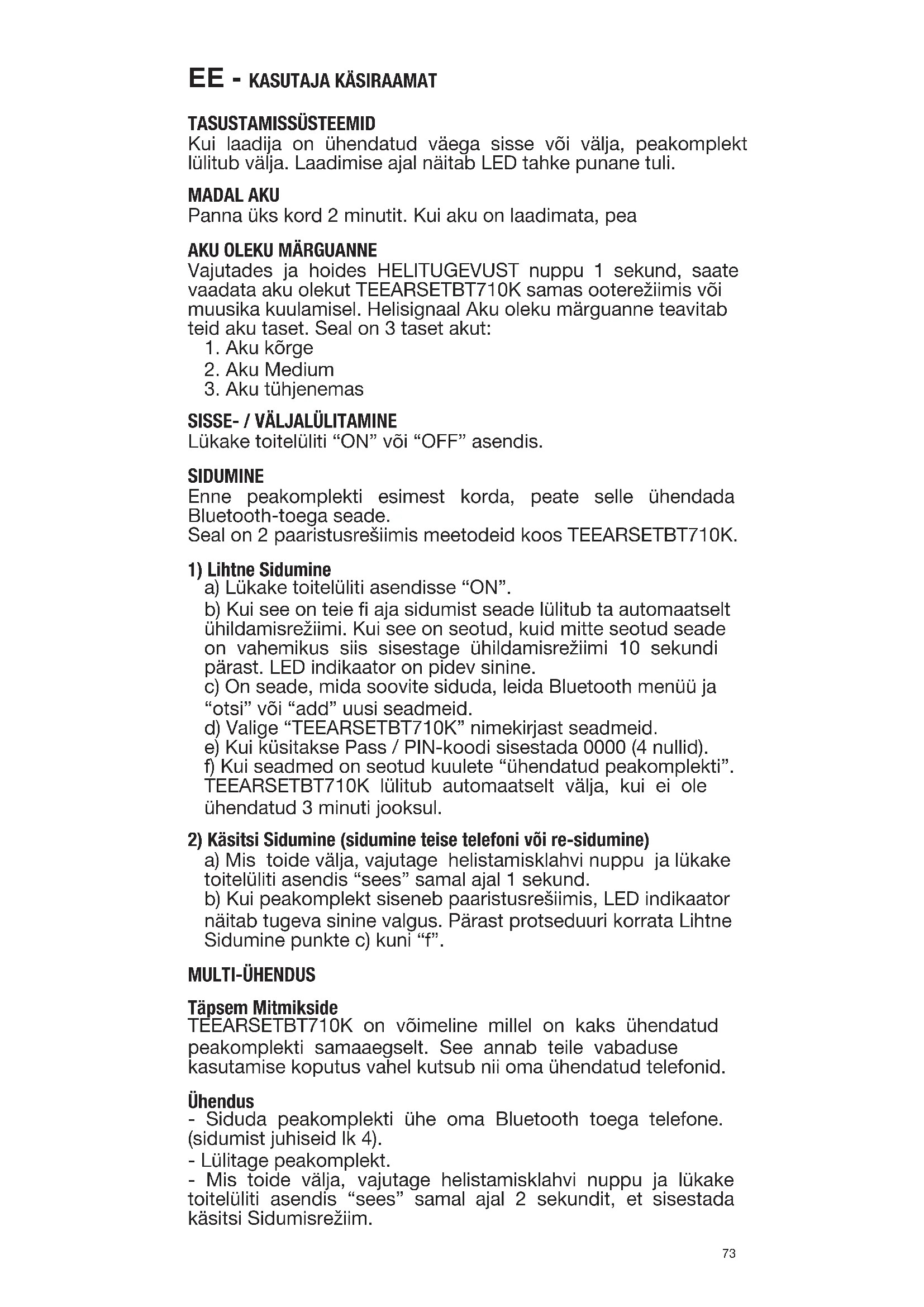 a) Lükake toitelüliti asendisse “ON”. b) Kui see on teie aja sidumist seade lülitub ta automaatselt ühildamisrežiimi. Kui see on seotud, kuid mitte seotud seade on vahemikus siis sisestage ühildamisrežiimi 10 sekundi pärast. LED indikaator on pidev sinine. c) On seade, mida soovite siduda, leida Bluetooth menüü ja “otsi” või “add” uusi seadmeid. d) Valige “TEEARSETBT710K” nimekirjast seadmeid. e) Kui küsitakse Pass / PIN-koodi sisestada 0000 (4 nullid). f) Kui seadmed on seotud kuulete “ühendatud peakomplekti”. TEEARSETBT710K lülitub automaatselt välja, kui ei ole ühendatud 3 minuti jooksul.