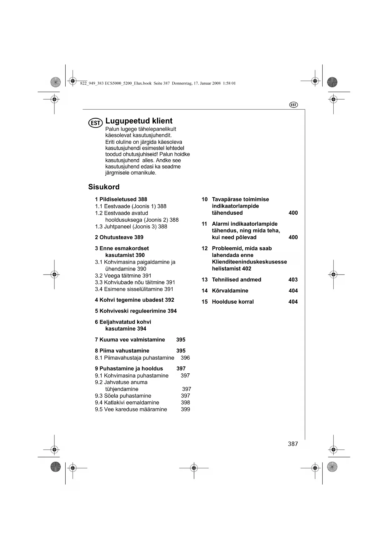 Lugupeetud klient Palun lugege tähelepanelikult käesolevat kasutusjuhendit.Eriti oluline on järgida käesoleva kasutusjuhendi esimestel lehtedel toodud ohutusjuhiseid! Palun hoidke kasutusjuhend alles. Andke see kasutusjuhend edasi ka seadme järgmisele omanikule. Sisukord 1 Pildiseletused 3881.1 Eestvaade (Joonis 1) 3881.2 Eestvaade avatud hooldusuksega (Joonis 2) 3881.3 Juhtpaneel (Joonis 3) 3882 Ohutusteave 3893 Enne esmakordset kasutamist 3903.1 Kohvimasina paigaldamine ja ühendamine 3903.2 Veega täitmine 3913.3 Kohviubade nõu täitmine 3913.4 Esimene sisselülitamine 3914 Kohvi tegemine ubadest 3925 Kohviveski reguleerimine 3946 Eeljahvatatud kohvi kasutamine 3947 Kuuma vee valmistamine 3958 Piima vahustamine 3958.1 Piimavahustaja puhastamine 3969 Puhastamine ja hooldus 3979.1 Kohvimasina puhastamine 3979.2 Jahvatuse anuma tühjendamine 3979.3 Sõela puhastamine 3979.4 Katlakivi eemaldamine 3989.5 Vee kareduse määramine 39910 Tavapärase toimimise indikaatorlampide tähendused 40011 Alarmi indikaatorlampide tähendus, ning mida teha, kui need põlevad 40012 Probleemid, mida saab lahendada enne Klienditeeninduskeskusesse helistamist 40213 Tehnilised andmed 40314 Kõrvaldamine 40415 Hoolduse korral 404822_949_383 ECS5000_5200_Elux.book Seite 387 Donnerstag, 17. Januar 2008 1:58 01