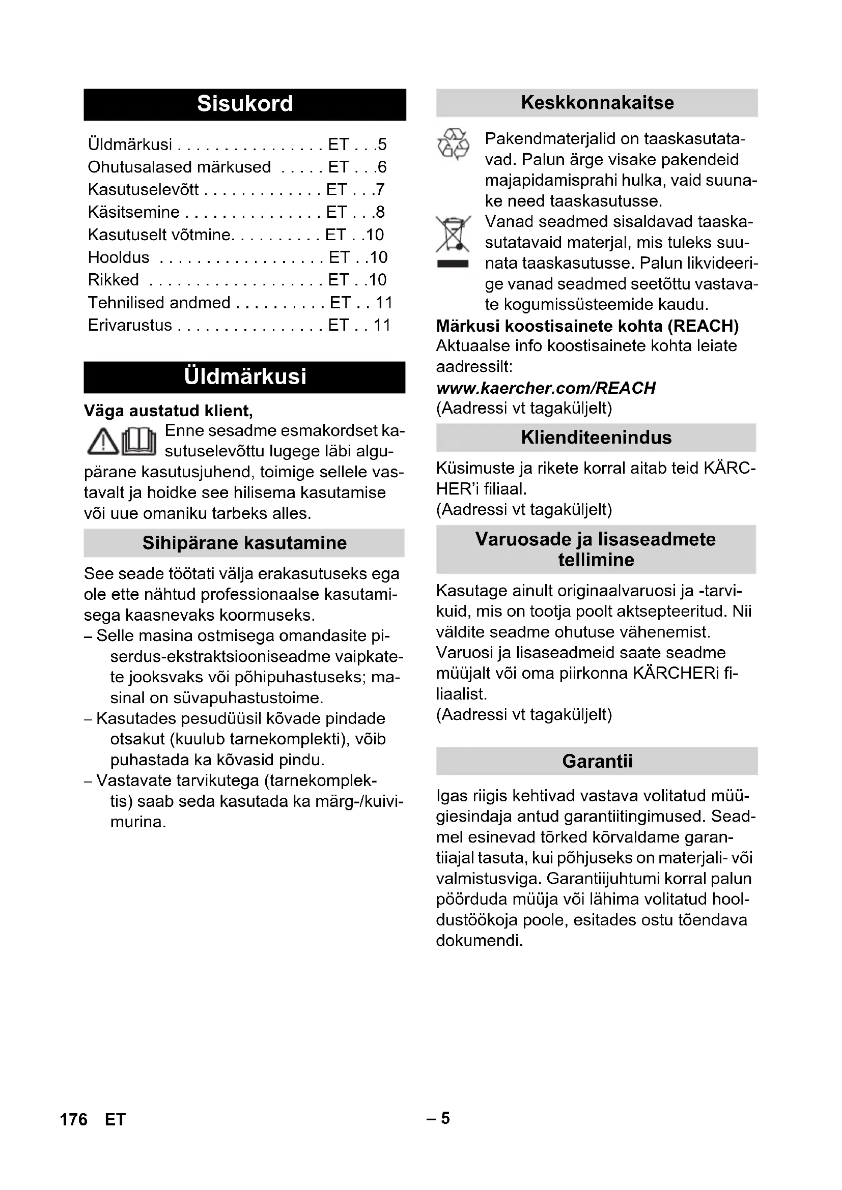 2.885-018.0 Препарат за почистване на килими RM 519 (бу- тилка от 1 л) Интернационално 6.295-771.0 Препарат за импрегни- ране на текстил Care Tex RM 762 (0,5 л бутилка) Интернационално 6.295-769.0 175BG– 5 Väga austatud klient, Enne sesadme esmakordset ka- sutuselevõttu lugege läbi algu- pärane kasutusjuhend, toimige sellele vas- tavalt ja hoidke see hilisema kasutamise või uue omaniku tarbeks alles. See seade töötati välja erakasutuseks ega ole ette nähtud professionaalse kasutami- sega kaasnevaks koormuseks. – Selle masina ostmisega omandasite pi- serdus-ekstraktsiooniseadme vaipkate- te jooksvaks või põhipuhastuseks; ma- sinal on süvapuhastustoime. – Kasutades pesudüüsil kõvade pindade otsakut (kuulub tarnekomplekti), võib puhastada ka kõvasid pindu. – Vastavate tarvikutega (tarnekomplek- tis) saab seda kasutada ka märg-/kuivi- murina. Pakendmaterjalid on taaskasutata- vad. Palun ärge visake pakendeid majapidamisprahi hulka, vaid suuna- ke need taaskasutusse. Vanad seadmed sisaldavad taaska- sutatavaid materjal, mis tuleks suu- nata taaskasutusse. Palun likvideeri- ge vanad seadmed seetõttu vastava- te kogumissüsteemide kaudu. Märkusi koostisainete kohta (REACH) Aktuaalse info koostisainete kohta leiate aadressilt: www.kaercher.com/REACH (Aadressi vt tagaküljelt) Küsimuste ja rikete korral aitab teid KÄRC- HER’i filiaal. (Aadressi vt tagaküljelt) Kasutage ainult originaalvaruosi ja -tarvi- kuid, mis on tootja poolt aktsepteeritud. Nii väldite seadme ohutuse vähenemist. Varuosi ja lisaseadmeid saate seadme müüjalt või oma piirkonna KÄRCHERi fi- liaalist. (Aadressi vt tagaküljelt) Igas riigis kehtivad vastava volitatud müü- giesindaja antud garantiitingimused. Sead- mel esinevad tõrked kõrvaldame garan- tiiajal tasuta, kui põhjuseks on materjali- või valmistusviga. Garantiijuhtumi korral palun pöörduda müüja või lähima volitatud hool- dustöökoja poole, esitades ostu tõendava dokumendi. Sisukord Üldmärkusi . . . . . . . . . . . . . . . . ET . . .5 Ohutusalased märkused . . . . . ET . . .6 Kasutuselevõtt . . . . . . . . . . . . . ET . . .7 Käsitsemine . . . . . . . . . . . . . . . ET . . .8 Kasutuselt võtmine. . . . . . . . . . ET . .10 Hooldus . . . . . . . . . . . . . . . . . . ET . .10 Rikked . . . . . . . . . . . . . . . . . . . ET . .10 Tehnilised andmed . . . . . . . . . . ET . . 11 Erivarustus . . . . . . . . . . . . . . . . ET . . 11 Üldmärkusi Sihipärane kasutamine Keskkonnakaitse Klienditeenindus Varuosade ja lisaseadmete tellimine Garantii 176 ET– 6 Lisaks käesolevas kasutusjuhendis toodud märkustele tuleb järgida ka seadusandja üldisi ohutusalaseid ja õnnetusjuhtumite vältimise eeskirju. Igasugune kasutusviis, mis ei ole kooskõ- las käesolevate juhistega, toob kaasa ga- rantii kustumise. – Seda seadet ei tohi kasutada piiratud füüsiliste, sensoorsete või vaimsete või- metega inimesed või kogemuste ja/või teadmisteta isikud; kui siis ainult nende ohutuse eest vastutava isiku järelevalve all või kui neid on õpetatud seadet ka- sutama ja nad on mõistnud sellest tule- nevaid ohtusid. – Lapsed ei tohi seadmega mängida. – Laste üle peab olema järelevalve taga- maks, et nad seadmega ei mängiks. – Puhastamist ja kasutajahooldust ei tohi teostada lapsed ilma järelevalveta. – Hoidke pakendikiled lastele kättesaa- matuna - lämbumisoht! – Lülitage masin pärast iga kasutamists ja enne iga puhastamist/hooldust välja. – Tuleoht. Ärge imege masinasse põle- vaid ega hõõguvaid esemeid. – Seade peab olema stabiilsel alusel. – Käitaja peab seadet kasutama sihipära- selt. Ta peab arvestama kohalike olu- dega ja jälgima seadmega töötades kol- mandaid isikuid, eriti lapsi. – Kontrollige enne kasutamist, kas sead- me ja tarvikute seisund vastab nõuete- le. Juhul kui seisund ei ole laitmatu, ei tohi seadet või tarvikut kasutada. – Ärge kunagi sukeldage seadet, kaablit ega pistikut vette või muudesse vedeli- kesse. – On keelatud kasutada seadet plahva- tusohustatud ruumides. Kui kasutate seadet ohualas, tuleb järgida vastavaid ohutusalaseid eeskirju. – Kaitske seadet äärmuslike ilmastikutin- gimuste, niiskuse ja kuumusallikate eest. – Kui seade peaks alla kukkuma, tuleb seda volitatud hooldustöökojas kontrol- lida, sest esineda võib sisemisi rikkeid, mis piiravad seadme kasutusohutust. – Ärge imege seadmesse mürgiseid ai- neid. – Ärge kunagi imege sellised materjale nagu kips, tsement jne., sest kokkupuu- tel veega võivad need kivistuda ja ohus- tada seadme tööd. – Töö käigus peab seade olema horison- taalses asendis. – Kasutage ainult tootja poolt soovitatud puhastusaineid ning järgige puhastu- saine tootjate kasutus- ja kõrvaldamis- nõudeid ning hoiatusi. 몇 Elektrilöögi oht – Ühendage seade vooluvõrku ainult nõuetekohaselt maandatud pistikutega. – Seadet tohib ühendada ainult vahelduv- voolutoitega. Pinge peab vastama seadme tüübisildil esitatud pingele. – Võrgupistikut ega pistikupesa ei tohi ku- nagi puutuda niiskete kätega. – Võrgupistikut pistikupesast välja tõm- mates ärge hoidke kinni ühenduskaab- list. – Enne igakordset kasutamist tuleb kont- rollida, et võrgupistikuga toitejuhe oleks kahjustusteta. Kahjustatud toitejuhe lasta viivitamatult volitatud hooldustöö- kojal/elektrikul välja vahetada. – Elektriõnnetuste vältimiseks soovitame kasutada ettelülitatud rikkevoolu-kait- selülitiga (max 30 mA rakendumise ni- mivoolutugevusega) pistikupesi. – Kasutage ainult veepritsmete vastu kaitstud pikenduskaablit, mille ristlõige on vähemalt 3x1 mm². – Võrgu- või pikenduskaabli konnektorite väljavahetamise korral peab olema ta- gatud kaitstus veepritsmete vastu ning mehhaaniline stabiilsus. – Enne seadme lahutamist vooluvõrgust, tuleb see alati esmalt pealülitist välja lü- litada. Ohut