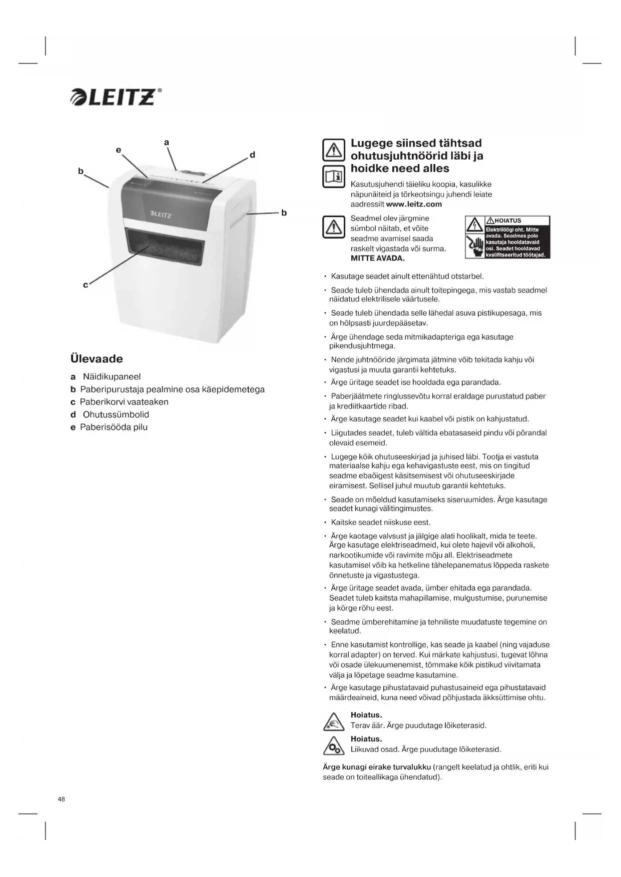 Lugege siinsed tähtsad ohutusjuhtnöörid läbi ja hoidke need alles Kasutusjuhendi täieliku koopia, kasulikke näpunäiteid ja tõrkeotsingu juhendi leiate aadressilt www.leitz.com Ülevaade a Näidikupaneel b Paberipurustaja pealmine osa käepidemetega c Paberikorvi vaateaken d Ohutussümbolid e Paberisööda pilu