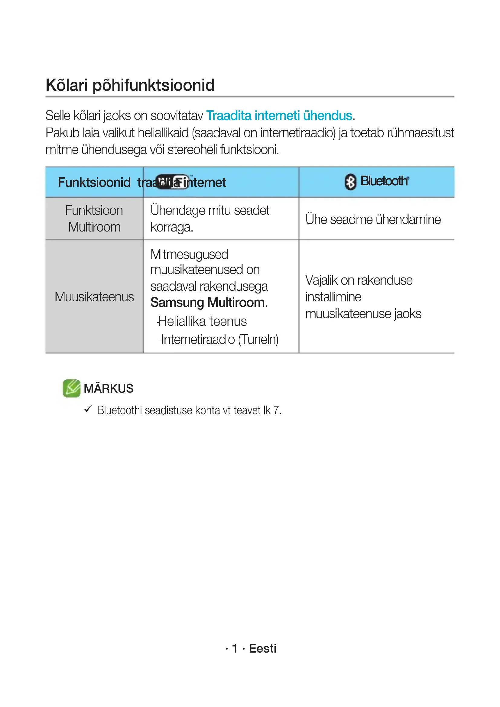 Informationen beim Fehlschlagen der Verbindungsherstellung finden Sie unter “Checkliste vor der Verbindungsherstellung” auf den Seiten 9 und 10. WAM3501-EN_15p-DEU-QSG_0901.indd 15 2016-09-01 4:49:38· 1 · Eesti Kõlari põhifunktsioonid Selle kõlari jaoks on soovitatav Traadita interneti ühendus. Pakub laia valikut heliallikaid (saadaval on internetiraadio) ja toetab rühmaesitust mitme ühendusega või stereoheli funktsiooni. Funktsioonid traadita internet Bluetooth Funktsioon Multiroom Ühendage mitu seadet korraga. Ühe seadme ühendamine Muusikateenus Mitmesugused muusikateenused on saadaval rakendusega Samsung Multiroom.