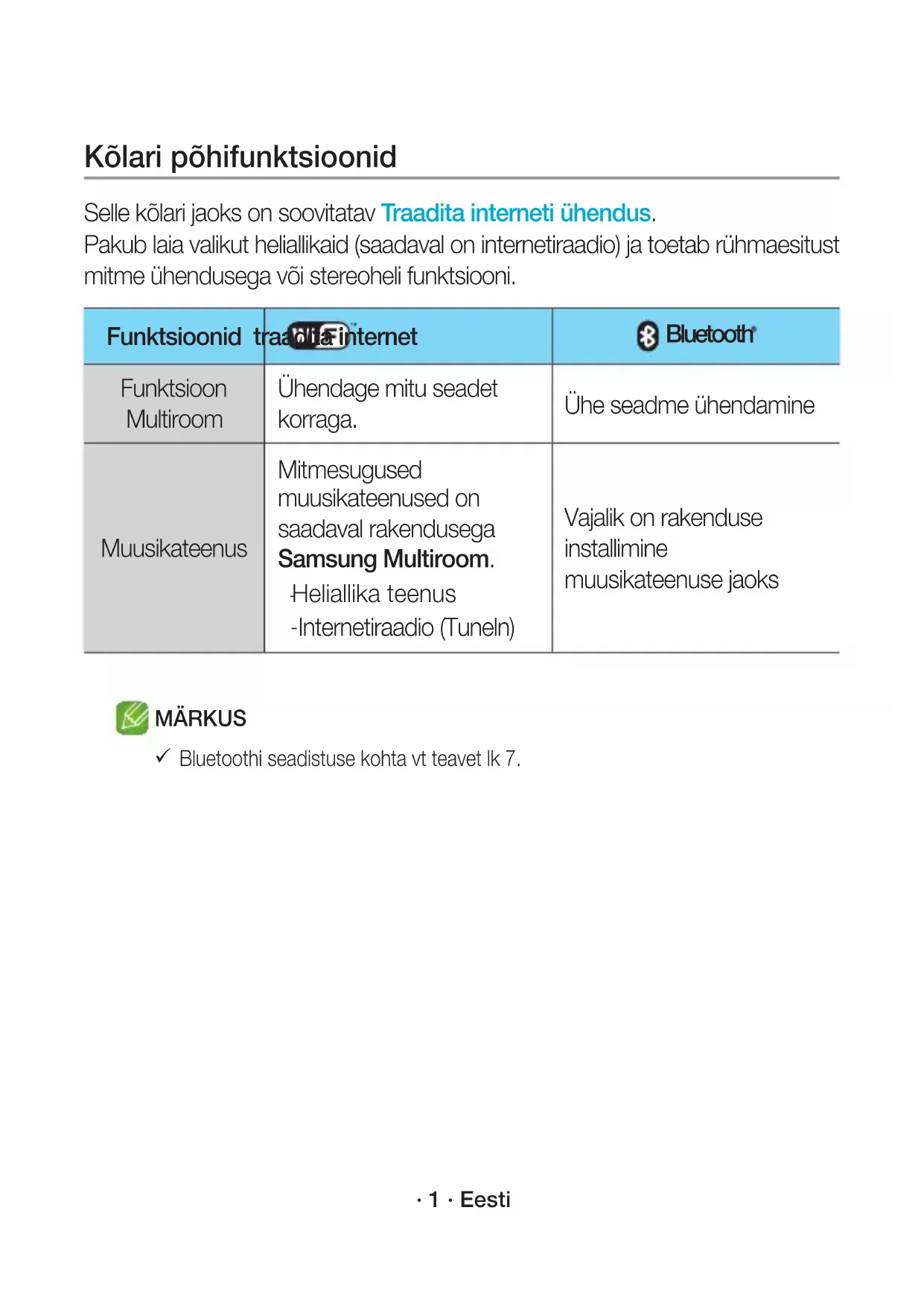 Informationen beim Fehlschlagen der Verbindungsherstellung finden Sie unter “Checkliste vor der Verbindungsherstellung” auf den Seiten 9 und 10. WAM1501-EN_15p-DEU-QSG_0901.indd 15 2016-09-01 4:58:03· 1 · Eesti Kõlari põhifunktsioonid Selle kõlari jaoks on soovitatav Traadita interneti ühendus. Pakub laia valikut heliallikaid (saadaval on internetiraadio) ja toetab rühmaesitust mitme ühendusega või stereoheli funktsiooni. Funktsioonid traadita internet Bluetooth Funktsioon Multiroom Ühendage mitu seadet korraga. Ühe seadme ühendamine Muusikateenus Mitmesugused muusikateenused on saadaval rakendusega Samsung Multiroom.