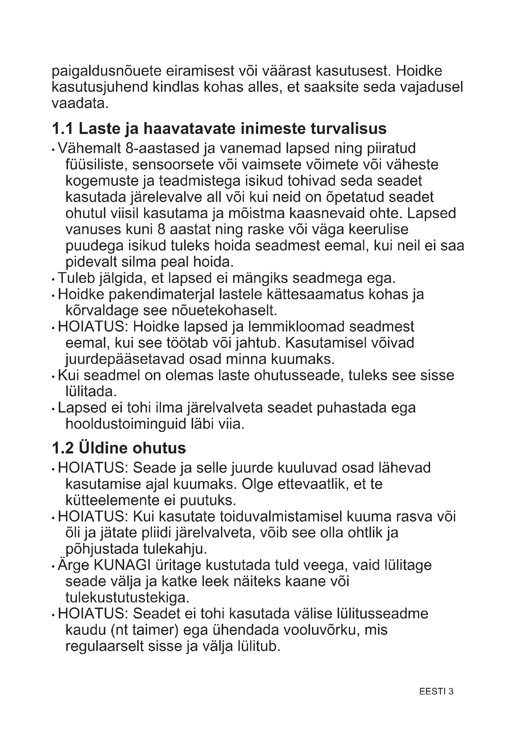 - Vähemalt 8-aastased ja vanemad lapsed ning piiratud füüsiliste, sensoorsete või vaimsete võimete või väheste kogemuste ja teadmistega isikud tohivad seda seadet kasutada järelevalve all või kui neid on õpetatud seadet ohutul viisil kasutama ja mõistma kaasnevaid ohte. Lapsed vanuses kuni 8 aastat ning raske või väga keerulise puudega isikud tuleks hoida seadmest eemal, kui neil ei saa pidevalt silma peal hoida.