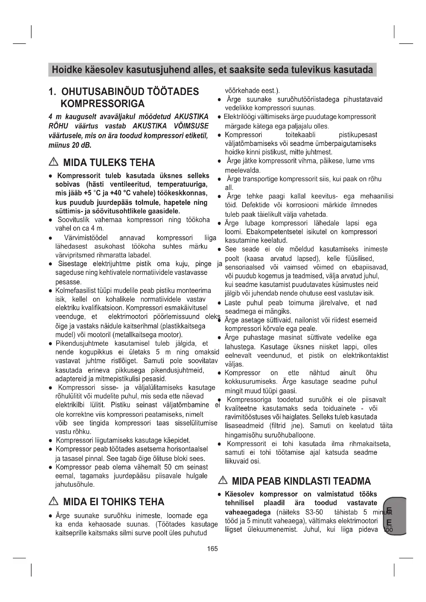 See seade ei ole mõeldud kasutamiseks inimeste poolt (kaasa arvatud lapsed), kelle füüsilised, sensoriaalsed või vaimsed võimed on ebapiisavad, võipuudubkogemusjateadmised,väljaarvatudjuhul, kuiseadmekasutamistpuudutavatesküsimustesneid jälgibvõijuhendabnendeohutuseeestvastutavisik. ● Laste puhul peab toimuma järelvalve, et nad seadmega ei mängiks. ● Ärgeasetagesüttivaid,nailonistvõiriidestesemeid kompressorikõrvaleegapeale. ● Ärge puhastage masinat süttivate vedelike ega lahustega. Kasutage üksnes niisket lappi, olles eelnevalt veendunud, et pistik on elektrikontaktist väljas. ● Kompressor on ette nähtud ainult õhu kokkusurumiseks. Ärge kasutage seadme puhul mingitmuudtüüpigaasi. ● Kompressoriga toodetud suruõhk ei ole piisavalt kvaliteetne kasutamaks seda toiduainete - või ravimitööstusesvõihaiglates.Sellekstulebkasutada lisaseadmeid (filtrid jne). Samuti on keelatud täita hingamisõhusuruõhuballoone. ● Kompressorit ei tohi kasutada ilma rihmakaitseta, samuti ei tohi töötamise ajal katsuda seadme liikuvaid osi.