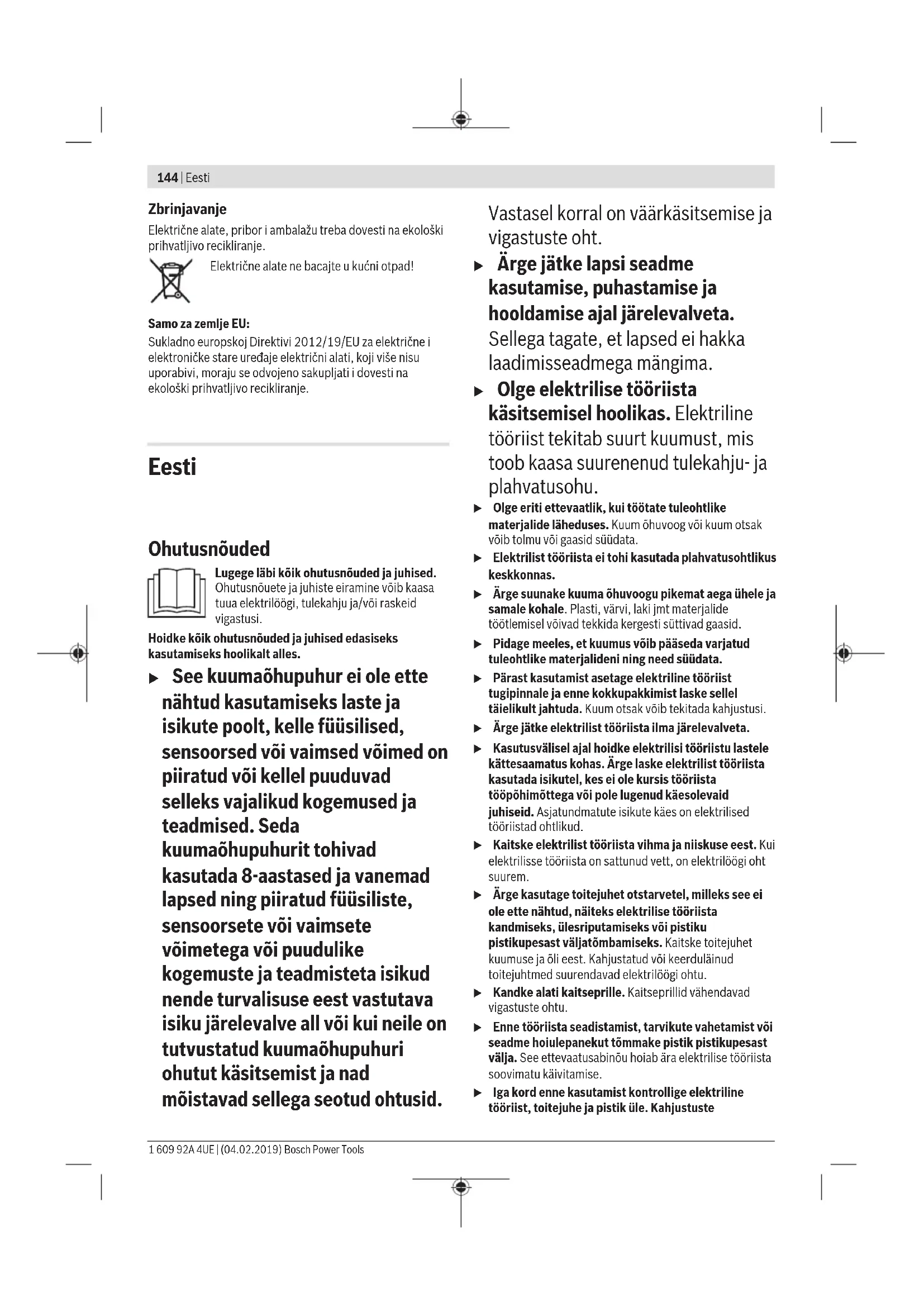 EL-vastavusdeklaratsioon Kinnitame ainuvastutajatena, et nimetatud tooted vastavad järgnevalt loetle- tud direktiivide ja määruste kõikidele asjaomastele nõuetele ja on kooskõlas 1 609 92A 4UE | (04.02.2019) Bosch Power ToolsIII Kuumaõhu- puhurid Tootenumber järgmiste normidega. Tehnilised dokumendid saadaval: *