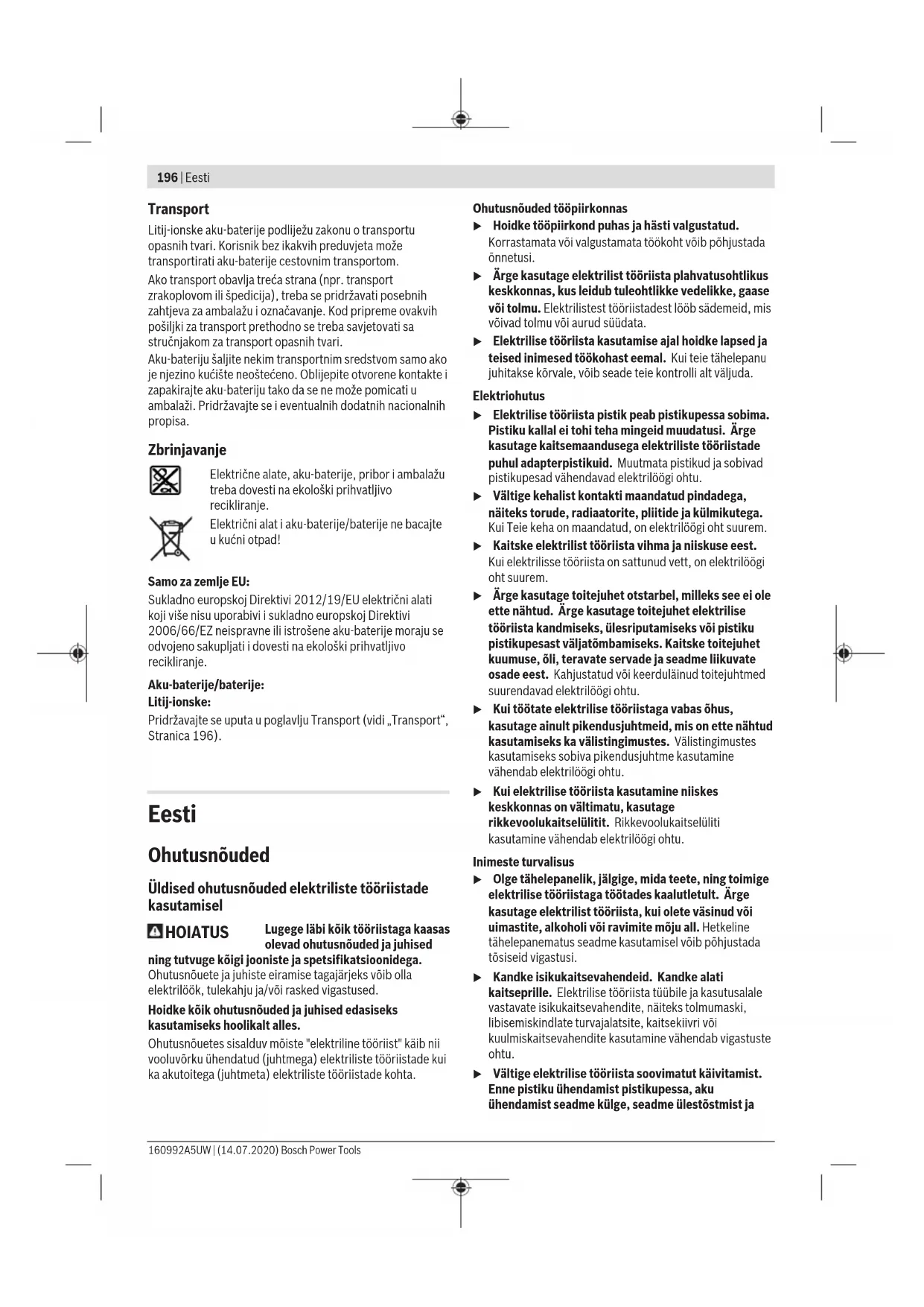 M6 2.71 3.61 4.52 4.8 5.42 6.02 7.22 8.13 9.7 13.6 16.2 M8 6.57 8.7 11 11.6 13.1 14.6 17.5 19.7 23 33 39 M10 13 17.5 22 23 26 29 35 39 47 65 78 M12 22.6 30 37.6 40 45 50 60 67 80 113 135 M14 36 48 60 65 72 79 95 107 130 180 215 M16 55 73 92 98 110 122 147 165 196 275 330 Savjeti Prije uvrtanja većih, duljih vijaka u tvrde materijale trebate s promjerom jezgre navoja prethodno bušiti na cca. 2/3 duljine vijka. Napomena: Pazite da metalni sitni dijelovi ne dospiju u električni alat. Nakon duljeg rada s manjim brojem okretaja, električni alat trebate ostaviti da u svrhu hlađenja radi cca. 3minute pri maks. broju okretaja u praznom hodu. Kopča remena za nošenje Pomoću kopče remena za nošenje (5) možete objesiti električni alat npr. na remen. U tom slučaju imate obje ruke slobodne i električni alat je u svakom trenutku pripravan za držanje. Napomene za optimalno rukovanje aku-baterijom Zaštitite aku-bateriju od vlage i vode. Aku-bateriju čuvajte samo u prostoriji u kojoj je raspon temperature od –20 °C do 50 °C. Npr. aku-bateriju ljeti na ostavljajte u automobilu. Bitno skraćenje vremena rada nakon punjenja pokazuje da je aku-baterija istrošena i da je treba zamijeniti. Pridržavajte se uputa za zbrinjavanje u otpad. Održavanje i servisiranje Održavanje i čišćenje u Očistite prihvat alata (1) i čahuru za blokadu (2) s vremena na vrijeme i lagano ih podmažite mašću 1 600 A00 2NE. u Prije svih radova na električnom alatu (npr. održavanje, zamjena alata, itd.), kao i kod njegovog transporta i spremanja, aku-bateriju treba izvaditi iz električnog alata. Kod nehotičnog aktiviranja prekidača za uključivanje/isključivanje postoji opasnost od ozljeda. u Električni alat i otvore za hlađenje održavajte čistima kako bi se moglo dobro i sigurno raditi. Servisna služba i savjeti o uporabi Naša servisna služba će odgovoriti na vaša pitanja o popravku i održavanju vašeg proizvoda, kao i o rezervnim dijelovima. Crteže u rastavljenom obliku i informacije o rezervnim dijelovima možete naći i na našoj adresi: www.bosch-pt.com Tim Bosch savjetnika o uporabi rado će odgovoriti na vaša pitanja o našim proizvodima i njihovom priboru. U slučaju upita ili naručivanja rezervnih dijelova, molimo vas obavezno navedite 10‑znamenkasti kataloški broj s tipske pločice proizvoda. Hrvatski Robert Bosch d.o.o PT/SHR-BSC Kneza Branimira 22 10040 Zagreb Tel.: +385 12 958 051 Fax: +385 12 958 050 E-Mail: RBKN-bsc@hr.bosch.com www.bosch.hr Ostale adrese servisa možete pronaći na: www.bosch-pt.com/serviceaddresses Bosch Power Tools 160992A5UW | (14.07.2020)196 | Eesti Transport Litij-ionske aku-baterije podliježu zakonu o transportu opasnih tvari. Korisnik bez ikakvih preduvjeta može transportirati aku-baterije cestovnim transportom. Ako transport obavlja treća strana (npr. transport zrakoplovom ili špedicija), treba se pridržavati posebnih zahtjeva za ambalažu i označavanje. Kod pripreme ovakvih pošiljki za transport prethodno se treba savjetovati sa stručnjakom za transport opasnih tvari. Aku-bateriju šaljite nekim transportnim sredstvom samo ako je njezino kućište neoštećeno. Oblijepite otvorene kontakte i zapakirajte aku-bateriju tako da se ne može pomicati u ambalaži. Pridržavajte se i eventualnih dodatnih nacionalnih propisa. Zbrinjavanje Električne alate, aku-baterije, pribor i ambalažu treba dovesti na ekološki prihvatljivo recikliranje. Električni alat i aku-baterije/baterije ne bacajte u kućni otpad! Samo za zemljeEU: Sukladno europskoj Direktivi 2012/19/EU električni alati koji više nisu uporabivi i sukladno europskoj Direktivi 2006/66/EZ neispravne ili istrošene aku-baterije moraju se odvojeno sakupljati i dovesti na ekološki prihvatljivo recikliranje. Aku-baterije/baterije: Litij-ionske: Pridržavajte se uputa u poglavlju Transport (vidi „Transport“, Stranica196). Eesti Ohutusnõuded Üldised ohutusnõuded elektriliste tööriistade kasutamisel HOIATUS Lugege läbi kõik tööriistaga kaasas olevad ohutusnõuded ja juhised ning tutvuge kõigi jooniste ja spetsifikatsioonidega. Ohutusnõuete ja juhiste eiramise tagajärjeks võib olla elektrilöök, tulekahju ja/või rasked vigastused. Hoidke kõik ohutusnõuded ja juhised edasiseks kasutamiseks hoolikalt alles. Ohutusnõuetes sisalduv mõiste "elektriline tööriist" käib nii vooluvõrku ühendatud (juhtmega) elektriliste tööriistade kui ka akutoitega (juhtmeta) elektriliste tööriistade kohta. Ohutusnõuded tööpiirkonnas u Hoidke tööpiirkond puhas ja hästi valgustatud. Korrastamata või valgustamata töökoht võib põhjustada õnnetusi. u Ärge kasutage elektrilist tööriista plahvatusohtlikus keskkonnas, kus leidub tuleohtlikke vedelikke, gaase või tolmu. Elektrilistest tööriistadest lööb sädemeid, mis võivad tolmu või aurud süüdata. u Elektrilise tööriista kasutamise ajal hoidke lapsed ja teised inimesed töökohast eemal. Kui teie tähelepanu juhitakse kõrvale, võib seade teie kontrolli alt väljuda. Elektriohutus u Elektrilise tööriista pistik peab pistikupessa sobima. Pistiku kallal ei tohi teha mingeid muudatusi. Ärge kasutage kaitsemaandusega elektriliste tööriistade puhul adapterpistikuid. Muutmata pistikud ja sobivad pistikupesad vähendavad elektrilöögi ohtu. u Vältige kehalist kontakti maandatud pindadega, näiteks torude, radiaatorite, pliitide ja külmikutega. Kui Teie keha on maandatud, on elektrilöögi oht suurem. u Kaitske elektrilist tööriista vihma ja niiskuse eest. Kuielektrilisse tööriista on sattunud vett, on elektrilöögi oht suurem. u Ärge kasutage toitejuhet otstarbel, milleks see ei ole ette nähtud. Ärge kasutage toitejuhet elektrilise tööriista kandmiseks, ülesriputamiseks või pistiku pistikupesast väljatõmbamiseks. Kaitske toitejuhet kuumuse, õli, teravate servade ja seadme liikuvate osade eest. Kahjustatud või keerduläinud toitejuhtmed suurendavad elektrilöögi ohtu. u Kui töötate elektrilise 