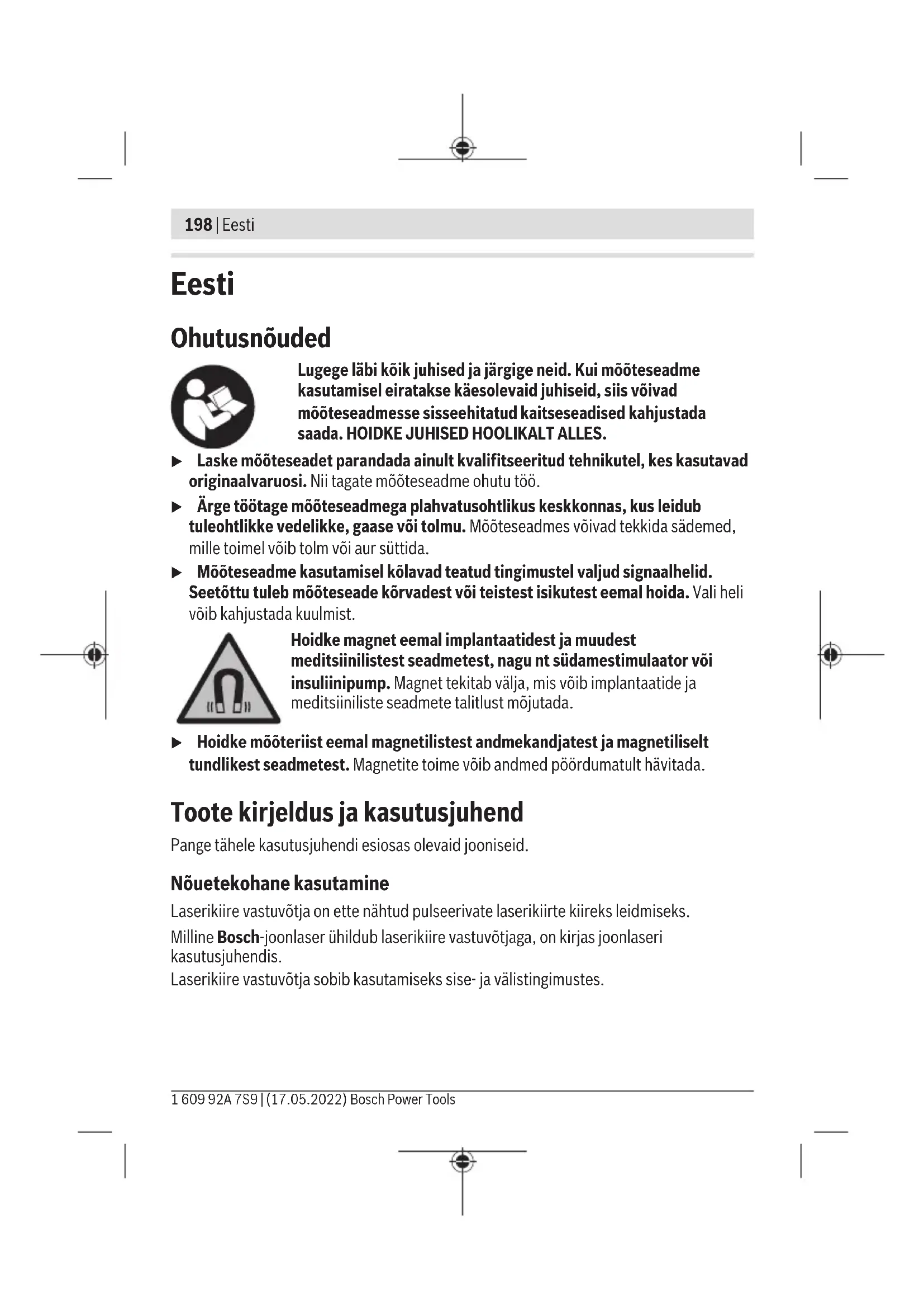 X: maksimaalne tööpiirkond laserikiire vastuvõtjaga kasutamisel vastavalt kasutatavaBosch- joonlaseri kasutusjuhendile C) olenevalt laservastuvõtja ja joonlaseri vahelisest kaugusest D) Esineb ainult mittejuhtiv määrdumine, mis võib aga ajutiselt kondensatsiooni tõttu juhtivaks muutuda. Laserikiire vastuvõtja täpseks identimiseks on tüübisildil seerianumber(13). Müraandmed Signaalheli A-korrigeeritud helirõhutase ühe meetri kaugusel on80dB(A). Ärge hoidke laserikiire vastuvõtjat otse vastu kõrva! Paigaldus Patareide paigaldamine/vahetamine Laserikiire vastuvõtjas on soovitatav kasutada leelismangaanpatareisid. 1 609 92A 7S9 | (17.05.2022) Bosch Power ToolsEesti | 201 Tõmmake patareipesa kaane fiksaator (15) väljapoole ja pöörake patareipesa kaas (14) lahti. Pange patareid sisse. Järgige sealjuures patareipesa siseküljel toodud kujutisele vastavat õiget polaarsust. Kui patareid hakkavad tühjaks saama, hakkab olekunäit(3) vilkuma. Laserikiire vastuvõtjat saab kasutada veel umbes 2h. Vahetage alati kõik patareid korraga. Kasutage ainult ühe tootja ja ühesuguse mahtuvusega patareisid. u Kui te laserikiire vastuvõtjat pikemat aega ei kasuta, võtke patareid välja. Patareid võivad pikemal laserikiire vastuvõtjas hoidmisel korrodeeruda ja iseeneslikult tühjeneda. Töötamine Kasutuselevõtt u Kaitske laserikiire vastuvõtjat niiskuse ja otsese päikesepaiste eest. u Ärge jätke laserikiire vastuvõtjat äärmuslike temperatuuride ega temperatuurikõikumiste kätte. Näiteks ärge jätke seda pikemat aega autosse. Suuremate temperatuurikõikumiste korral laske laserikiire vastuvõtjal enne kasutuselevõttu keskkonna temperatuuriga kohaneda. Äärmuslikel temperatuuridel ja temperatuurikõikumiste korral võib laserikiire vastuvõtja täpsus väheneda. Laserikiire vastuvõtja paigaldamine (vtjnA) Paigutage laserikiire vastuvõtja joonlaserist vähemalt5m kaugusele. Veenduge, et joonlaseril oleks aktiveeritud vastuvõtjarežiim. Valige töörežiim, kus tekitatakse kas ainult horisontaalne või ainult vertikaalne laseritasand. Suunis: ärge valige üheaegselt horisontaalse ja vertikaalse laseritasandiga tööviisi (ristjoonterežiimi), sest siis võivad esineda laserkiire kõrguse väärnäidud. Valige laserikiire vastuvõtjale selline koht, et laserikiir jõuaks vastuvõtuväljale(9). Suunake seade nii, et laserikiir läbiks vastuvõtuvälja põiki (nagu joonisel kujutatud). Sisse-/väljalülitamine u Laserikiire vastuvõtja sisselülitamisel kõlab vali signaalheli. Seepärast tuleb laserikiire vastuvõtjat sisselülitamisel kõrvadest ja teistest isikutest eemal hoida. Vali heli võib kuulmist kahjustada. Laserikiire vastuvõtja sisselülitamiseks vajutage sisse-/väljalülitusnuppu(2). Kõik LEDid süttivad korraks ja kõlab signaalheli. Laserikiire vastuvõtja sisselülitamise järel on alati seatud väike helitugevus ja vastuvõtutäpsus „täpne“. Bosch Power Tools 1 609 92A 7S9 | (17.05.2022)202 | Eesti Laserikiire vastuvõtja väljalülitamiseks vajutage uuesti sisse-/väljalülitusnuppu(2). Kõik LEDid süttivad enne väljalülitamist korraks ja kõlab kolm signaalheli. Olekunäit(3) kustub. Kui umbes 20min vältel ei vajutata laserikiire vastuvõtjal ühtegi nuppu ja vastuvõtuväli(9) ei võta 20min vältel laserikiirt vastu, lülitub laserikiire vastuvõtja patareide säästmiseks automaatselt välja. Keskjoone kuva seade valimine Vastuvõtutäpsuse seadmise nupuga(1) saate määrata, millise täpsusastmega kuvatakse laserikiire asukohta vastuvõtuväljal keskel asuvana: – vastuvõtutäpsus „täpne“ (keskjoone LED(7) vilgub), – vastuvõtutäpsus „ligikaudne“ (LED-suunanäidud „Laserikiir keskjoone kohal“(6) ja „Laserikiir keskjoone all“(8) vilguvad). Suunanäidud Laserikiire asukohta vastuvõtuväljal(9) näidatakse: – laserikiire vastuvõtja esi- ja tagaküljel LED-suunanäitudena „Laserikiir keskjoone kohal“(6), „Laserikiir keskjoone all“(8) või keskjoonena(7), – valikuliselt signaalheliga. Laserikiire vastuvõtja on liiga madalal: Kui laserikiir läbib vastuvõtuvälja(9) ülemist poolt, siis põlevad LED-suunanäidud „Laserikiir keskjoone kohal“(6). Sisselülitatud signaalheli korral kõlab kõrge sagedusega signaal. Liigutage laserikiire vastuvõtjat noole suunas ülespoole. Laserikiire vastuvõtja on liiga kõrgel: Kui laserikiir läbib vastuvõtuvälja(9) alumist poolt, siis põlevad LED-suunanäidud „Laserikiir keskjoone all“(8). Sisselülitatud signaalheli korral kõlab madala sagedusega signaal. Liigutage laserikiire vastuvõtjat noole suunas allapoole. Laserikiire vastuvõtja on keskel: Kui laserikiir läbib vastuvõtuvälja(9) keskmärgistuse(12) kõrgusel, siis põlevad keskjoone LEDid(7). Sisselülitatud signaalheli korral kostab pidev heli. Signaalheli laserkiire näitamiseks Laserkiire asukohta vastuvõtuväljal (9) saab näidata signaalheliga. Võite helitugevust muuta või signaalheli välja lülitada. Signaalheli vahetamiseks või väljalülitamiseks vajutage signaalheli nuppu(4). Väikese helitugevuse korral kõlab lühike signaalheli ja süttib keskjoone LED(7), suure helitugevuse korral kõlab lühike signaalheli ning süttivad LED-suunanäidud(6), (7) ja(8), väljalülitatud signaalheli korral LEDid ei sütti. 1 609 92A 7S9 | (17.05.2022) Bosch Power ToolsEesti | 203 Signaalheli seadest sõltumatult kõlab iga kord, kui vajutatakse mingit laserikiire vastuvõtja nuppu, kinnituseks väikese helitugevusega lühike heli. Tööjuhised Märgistamine Laserikiire vastuvõtja vasakul ja paremal pool oleval keskmärgistusel(12) saate tähistada laserikiire asukohta, kui see läbib vastuvõtuvälja(9) keskosa. Veenduge, et märgistamisel oleks laserikiire vastuvõtja joondatud täpselt vertikaalselt (horisontaalse laserikiire korral) või horisontaalselt (vertikaalse laserikiire korral), kuna vastasel juhul on märgistused laserikiire suhtes nihutatud. Magnetiga kinnitamine (vt jn B) Kui kin