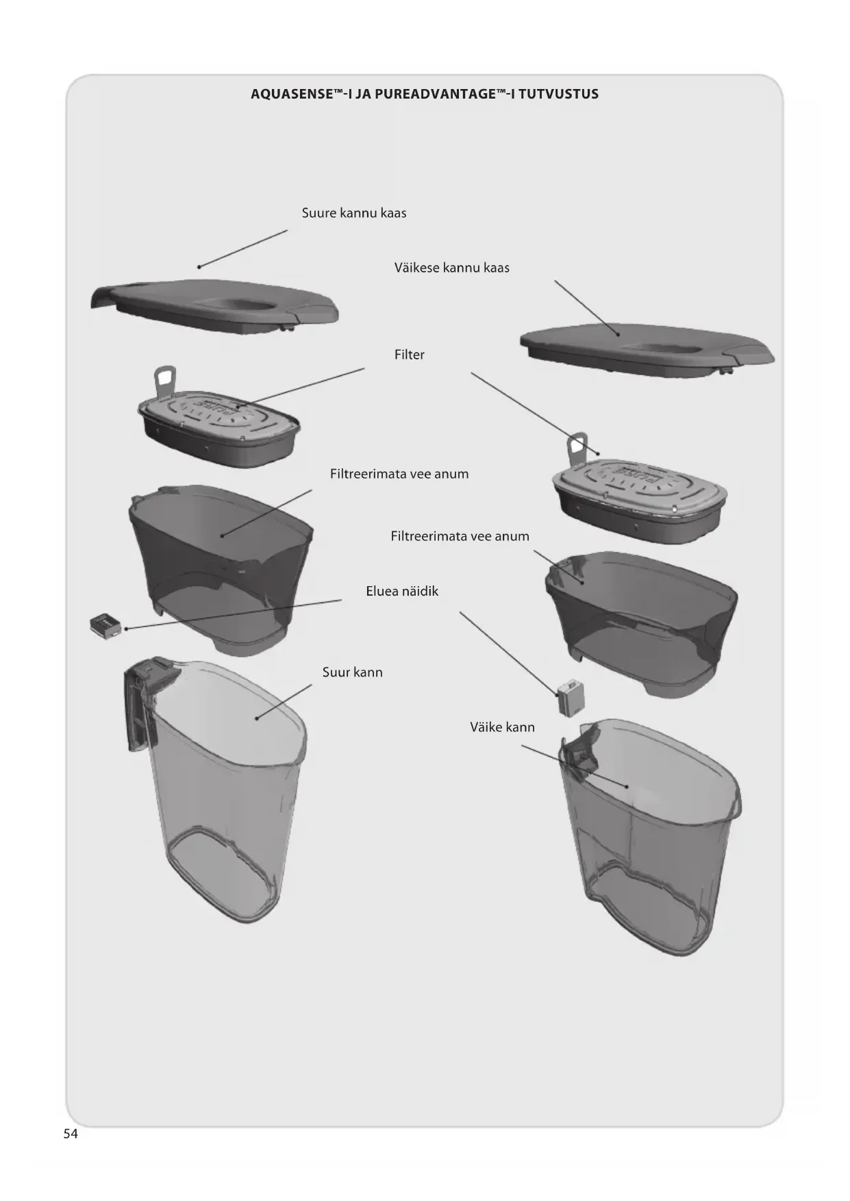 Suure kannu kaas Väikese kannu kaas Filter Filtreerimata vee anum Filtreerimata vee anum Eluea näidik Suur kann Väike kannMe täname, et olete valinud PUREADVANTAGE™-i filtertehnoloogiaga Electrolux AquaSense™-i