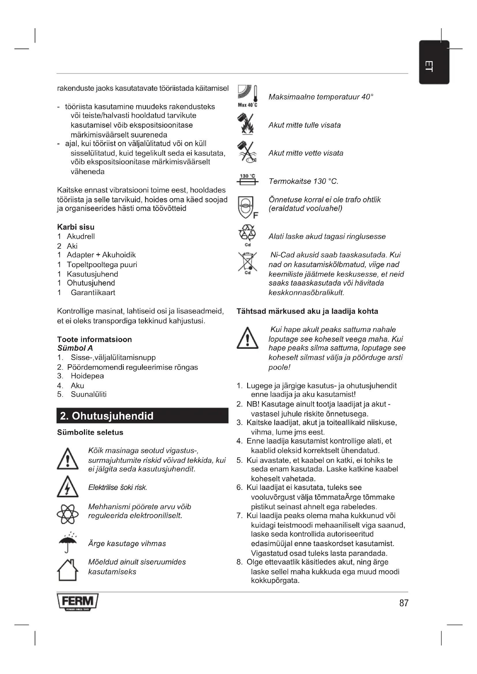 Sümbolite seletus Kõik masinaga seotud vigastus-, surmajuhtumite riskid võivad tekkida, kui ei jälgita seda kasutusjuhendit. Elektrilise šoki risk. Mehhanismi pöörete arvu võib reguleerida elektrooniliselt. Ärge kasutage vihmas Mõeldud ainult siseruumides kasutamiseks Maksimaalne temperatuur 40° Akut mitte tulle visata Akut mitte vette visata Termokaitse 130 °C. Õnnetuse korral ei ole trafo ohtlik (eraldatud vooluahel) Alati laske akud tagasi ringlusesse Ni-Cad akusid saab taaskasutada. Kui nad on kasutamiskõlbmatud, viige nad keemiliste jäätmete keskusesse, et neid saaks taaaskasutada või hävitada keskkonnasõbralikult. Tähtsad märkused aku ja laadija kohta Kui hape akult peaks sattuma nahale loputage see koheselt veega maha. Kui hape peaks silma sattuma, loputage see koheselt silmast välja ja pöörduge arsti poole!