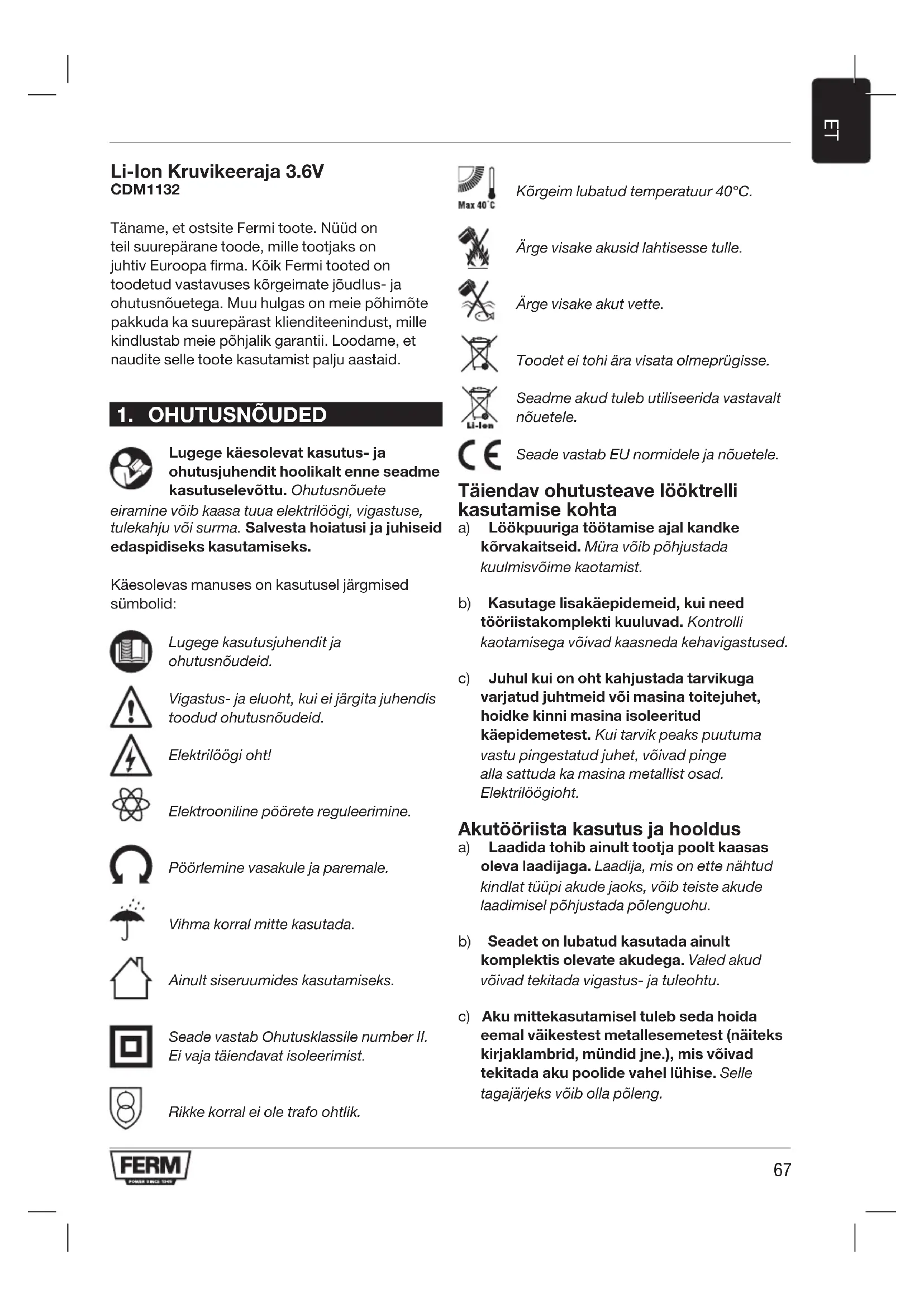 Li-Ion Kruvikeeraja 3.6V CDM1132 Täname, et ostsite Fermi toote. Nüüd on teil suurepärane toode, mille tootjaks on juhtiv Euroopa firma. Kõik Fermi tooted on toodetud vastavuses kõrgeimate jõudlus- ja ohutusnõuetega. Muu hulgas on meie põhimõte pakkuda ka suurepärast klienditeenindust, mille kindlustab meie põhjalik garantii. Loodame, et naudite selle toote kasutamist palju aastaid.