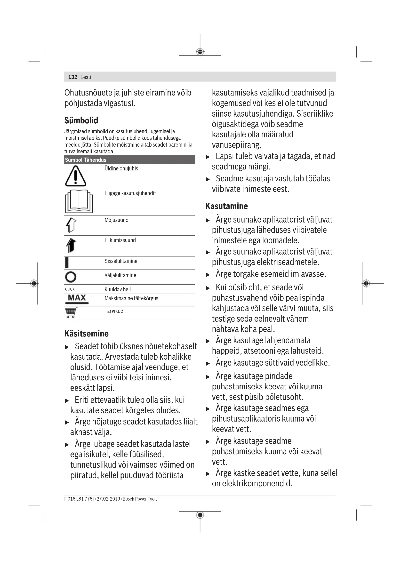 | Pihustusaplikaatori 276 mm pea paigaldamine | G | 161 |