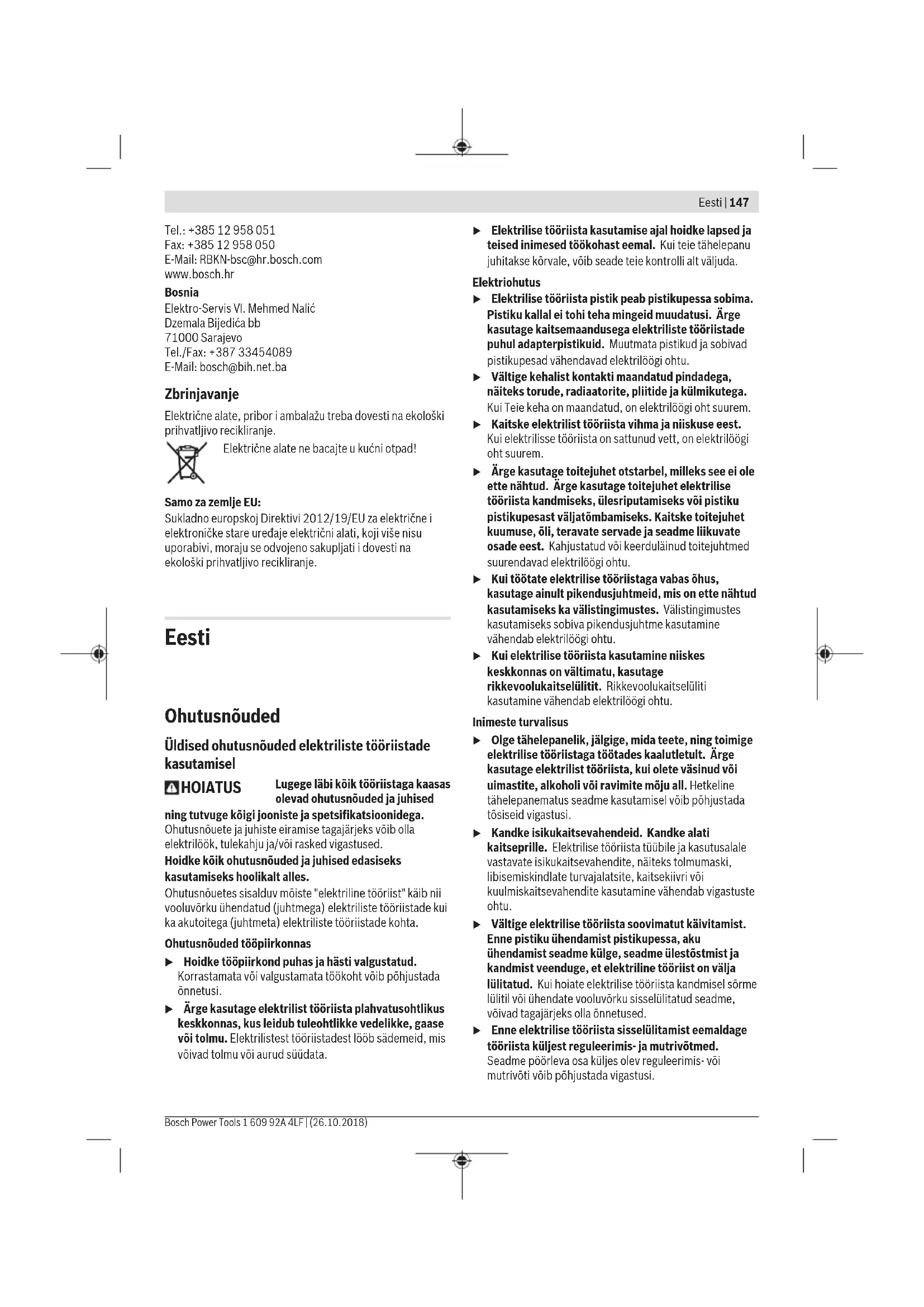 Paigaldage elektrilisele tööriistale paralleelpiirik (17) või nurkpiirik (21) kinnituskruviga (20) (valikuliselt ette või taha). Paigaldage elektrilisele tööriistale valtsi sügavuspiirik (24) kinnituskruviga (23) (valikuliselt ette või taha). Keerake lahti fikseerimismutter (19) ja seadke soovitud valtsi laius skaalaga (18). Keerake fikseerimismutter (19) jälle kinni. Seadke valtsi sügavuse piirikuga (24) soovitud valtsisügavus. Hööveldage mitu korda, kuni valtsi soovitud sügavus on saavutatud. Avaldage höövlile külgsurvet. Nurkpiirikuga faasimine Seadke valtside ja pindade faasimisel vajalik faasimisnurk nurgaseadega (22). Hooldus ja korrashoid Hooldus ja puhastus u Enne mistahes tööde teostamist elektrilise tööriista kallal tõmmake pistik pistikupesast välja. u Seadme laitmatu ja ohutu töö tagamiseks hoidke seade ja selle ventilatsiooniavad puhtad. Hoidke seisutald (25) vabalt liikuvana ja puhastage seda korrapäraselt. Süsiharjade tööressursi ammendumisel lülitub elektriline tööriist automaatselt välja. Hoolduseks tuleb elektriline tööriist saata klienditeenindusse, aadresse vaadake lõigust „Klienditeenindus ja rakendusnõustamine“. Tööohutuse tagamiseks tuleb toitejuhe lasta vajaduse korral välja vahetada Boschi elektriliste tööriistade volitatud parandustöökojas. Klienditeenindus ja kasutusalane nõustamine Müügiesindajad annavad vastused toodete paranduse ja hoolduse ning varuosadega seotud küsimustele. Joonised ja info varuosade kohta leiate ka veebisaidilt: www.bosch- pt.com Boschi nõustajad on meeleldi abiks, kui teil on küsimusi toodete ja lisatarvikute kohta. Päringute esitamisel ja varuosade tellimisel näidake kindlasti ära seadme andmesildil olev 10‑kohaline tootenumber. Eesti Vabariik Eesti | 151 Bosch Power Tools 1 609 92A 4LF | (26.10.2018)152 | Latviešu 1 609 92A 4LF | (26.10.2018) Bosch Power Tools Mercantile Group AS Boschi elektriliste käsitööriistade remont ja hooldus Pärnu mnt. 549 76401 Saue vald, Laagri Tel.: 6549 568 Faks: 679 1129 Kasutuskõlbmatuks muutunud seadmete käitlus Elektriseadmed, lisatarvikud ja pakendid tuleks keskkonnasäästlikult ringlusse võtta. Ärge visake kasutusressursi ammendanud elektrilisi tööriistu olmejäätmete hulka! Üksnes ELliikmesriikidele: Vastavalt Euroopa Parlamendi ja nõukogu direktiivile 2012/19/EL elektri- ja elektroonikaseadmete jäätmete kohta ning direktiivi ülevõtvatele riiklikele õigusaktidele tuleb kasutuskõlbmatuks muutunud elektrilised tööriistad eraldi kokku koguda ja keskkonnasäästlikult korduskasutada või ringlusse võtta. Latviešu Drošības noteikumi Vispārēji drošības noteikumi elektroinstrumentiem