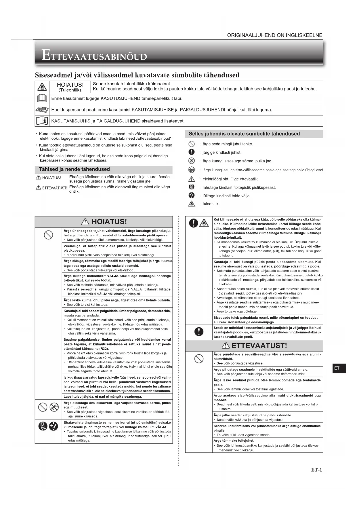- Kuna tootes on kasutusel pöörlevad osad ja osad, mis võivad põhjustada elektrilööki, lugege enne kasutamist kindlasti läbi need „Ettevaatusabinõud“.• Kuna toodud ettevaatusabinõud on ohutuse seisukohast olulised, peate neid kindlasti järgima.• Kui olete selle juhendi läbi lugenud, hoidke seda koos paigaldusjuhendiga käepärases kohas seadme läheduses. Tähised ja nende tähendused HOIATUS!Ebaõige käsitsemine võib olla väga ohtlik ja suure tõenäo-susega põhjustada surma, raske vigastuse jne. ETTEVAATUST!Ebaõige käsitsemine võib olenevalt tingimustest olla väga ohtlik. Selles juhendis olevate sümbolite tähendused : ärge seda mingil juhul tehke. : järgige kindlasti juhist. : ärge kunagi sisestage sõrme, pulka jne. ärge kunagi astuge sise-/välisseadme peale ega asetage neile ühtegi eset. : elektrilöögi oht. Olge ettevaatlik. : lahutage kindlasti toitepistik pistikupesast. : lülitage kindlasti toide välja. : tuleohtlik. HOIATUS! Ärge ühendage toitejuhet vahekontakti, ärge kasutage pikendusju-het ega ühendage mitut seadet ühte vahelduvvoolu pistikupessa.• See võib põhjustada ülekuumenemise, tulekahju või elektrilöögi.Veenduge, et toitepistik oleks puhas ja sisestage see kindlalt pistikupessa.• Määrdunud pistik võib põhjustada tulekahju või elektrilöögi.Ärge siduge, tõmmake ega modifi tseerige toitejuhet ja ärge kuumu-tage seda ega asetage sellele raskeid esemeid.• See võib põhjustada tulekahju või elektrilöögi.Ärge lülitage kaitselülitit VÄLJA/SISSE ega lahutage/ühendage toitepistikut, kui seade töötab.• See võib tekitada sädemeid, mis võivad põhjustada tulekahju.• Pärast siseseadme kaugjuhtimispuldiga VÄLJA lülitamist lülitage kindlasti kaitselüliti VÄLJA või lahutage toitepistik. Ärge laske külmal õhul pikka aega järjest otse oma kehale puhuda.• See võib tervist kahjustada.Kasutaja ei tohi seadet paigaldada, ümber paigutada, demonteerida, muuta ega parandada.• Kui kliimaseadet on valesti käsitsetud, võib see põhjustada tulekahju, elektrilöögi, vigastuse, veelekke jne. Pidage nõu edasimüüjaga.• Kui toitejuhe on kahjustatud, peab tootja või hoolduspersonal selle ohu vältimiseks välja vahetama.Seadme paigaldamise, ümber paigutamise või hooldamise korral peate tagama, et külmutusahelasse ei sattuks muud ainet peale ettenähtud külmaaine (R32).• Võõraine (nt õhk) olemasolu korral võib rõhk tõusta liiga kõrgeks ja põhjustada plahvatuse või vigastuse.• Ettenähtust erineva külmaaine kasutamine võib põhjustada süsteemis mehaanilise tõrke, talitlushäire või rikke. Halvimal juhul ei ole seetõttu võimalik tagada toote ohutust.Isikud (kaasa arvatud lapsed), kelle füüsilised, sensoorsed või vaim-sed võimed on piiratud või kellel puuduvad vastavad kogemused ja teadmised, ei tohi seadet kasutada muidu, kui nende turvalisuse eest vastutav isik ei ole neid eelnevalt juhendanud seadet kasutama.Lapsi tuleb jälgida, et nad ei mängiks seadmega. Ärge sisestage õhu sissevõtu- ega väljalaskeavasse sõrme, pulka ega muud eset.• See võib põhjustada vigastuse, sest sisemine ventilaator pöörleb töö ajal suure kiirusega. Ebatavaliste tingimuste esinemise korral (nt põlemislõhn) seisake kliimaseade ja lahutage toitepistik või lülitage kaitselüliti VÄLJA.• Tavatus seisundis kliimaseadme kasutamise jätkamine võib põhjustada talitlushäire, tulekahju või elektrilöögi. Konsulteerige sellisel juhul edasimüüjaga. Kui kliimaseade ei jahuta ega küta, võib selle põhjuseks olla külma-aine leke. Külmaaine lekke tuvastamise korral lülitage seade kohe välja, õhutage põhjalikult ruumi ja konsulteerige edasimüüjaga. Kui remondiga kaasneb seadme külmaainega täitmine, küsige üksikasju hooldustehnikult.• Kliimaseadmes kasutatav külmaaine ei ole kahjulik. Üldjuhul lekkeid ei esine. Kui aga külmaainet lekib ja see puutub kokku tule või kütte-kehaga (nt soojapuhur, õliradiaator, pliit), tekitab see kahjulikku gaasi ja tuleohu.Kasutaja ei tohi kunagi püüda pesta siseseadme sisemust. Kui seadme sisemust on vaja puhastada, pöörduge edasimüüja poole.• Sobimatu puhastusaine võib kahjustada seadme sees olevat plastma-terjali ja seeläbi põhjustada veelekke. Kui puhastusaine puutub kokku elektriosade või mootoriga, põhjustab see talitlushäire, suitsemise või tulekahju.• Seadet tuleb hoida ruumis, kus ei ole pidevalt töötavaid süüteallikaid (nt avatud leegid, töötav gaasipõleti või elektriradiaator).• Arvestage, et külmaaine ei pruugi sisaldada lõhnaainet.• Ärge kasutage seadme sulatamiseks ega puhastamiseks muid mee-todeid peale nende, mis on tootja poolt soovitatud.• Ärge torgake ega põletage.Siseseade tuleb paigaldada ruumi, mille põrandapind on toodust suurem. Konsulteerige edasimüüjaga.Seade on mõeldud kasutamiseks asjatundjatele ja väljaõppe läbinud kasutajatele poodides, kergtööstuses ja taludes ning kommertskasu-tuseks tavaisikute poolt. ETTEVAATUST! Ärge puudutage sise-/välisseadme õhu sissevõtuava ega alumii-niumribisid.• See võib põhjustada vigastuse.Ärge pihustage seadmele insektitsiide ega süttivaid aineid.• See võib põhjustada tulekahju või seadme deformeerumist.Ärge laske seadmel puhuda otse lemmikloomade ega toataimede peale.• See võib lemmikloomi või toataimi vigastada.Ärge asetage sise-/välisseadme alla muid elektriseadmeid ega mööblit.• Seadmest võib tilkuda vett, mis võib põhjustada kahjustuse või talit-lushäire.Ärge jätke seadet kahjustatud paigaldusstendile.• Seade võib kukkuda ja põhjustada vigastuse.Seadme kasutamiseks või puhastamiseks ärge astuge ebakindlale pingile.• Te võite kukkudes vigastada saada.Ärge tõmmake toitejuhet.• See võib juhtmesüdamikku kahjustada ja seeläbi põhjustada ülekuu-menemist või tulekahju. Siseseadmel ja/või välisseadmel kuvatavate sümbolite tähendused HOIATUS! (Tuleohtlik)Seade kasutab tuleohtlik