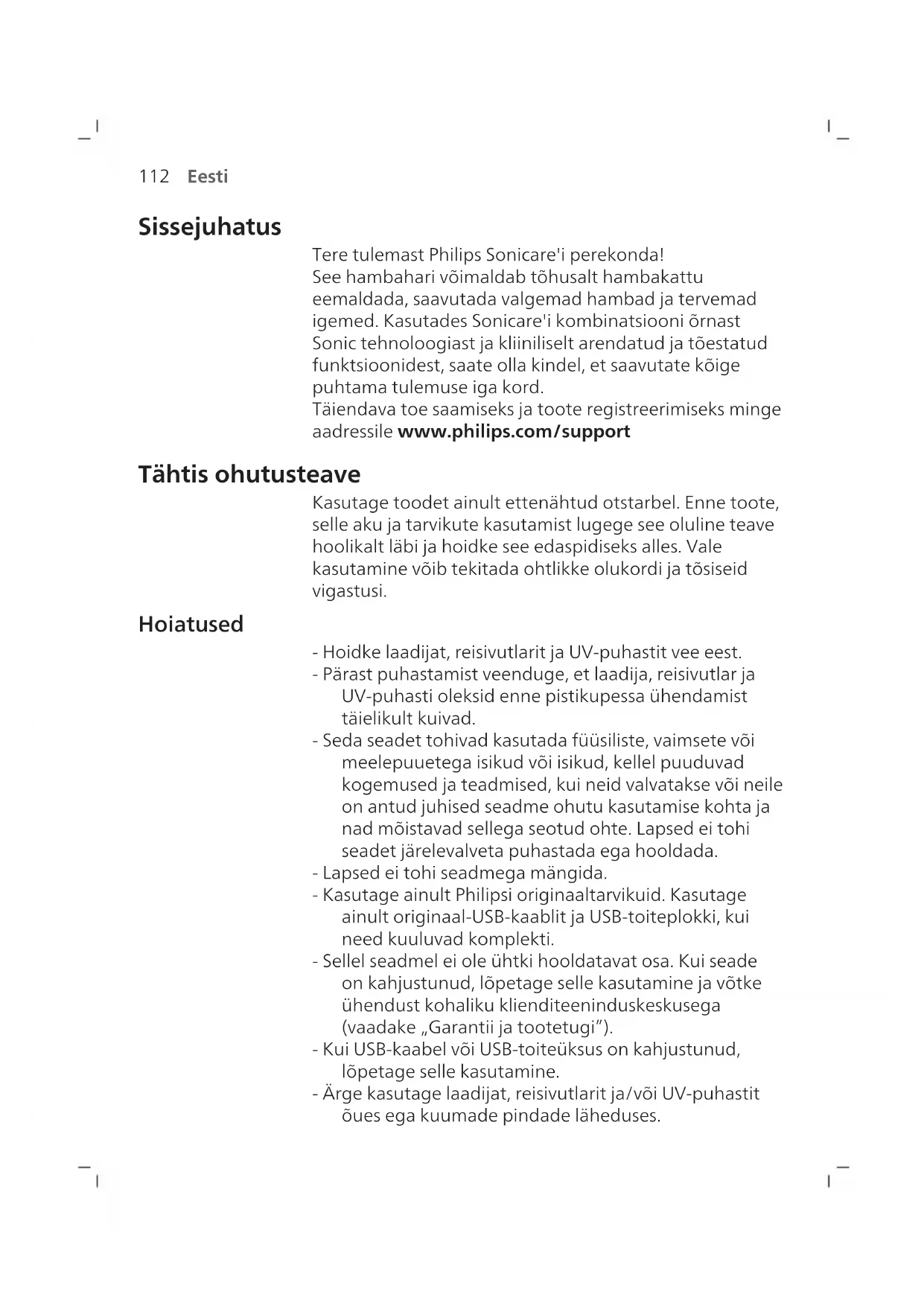 Eesti Sissejuhatus Tere tulemast Philips Sonicare'i perekonda! See hambahari võimaldab tõhusalt hambakattu eemaldada, saavutada valgemad hambad ja tervemad igemed. Kasutades Sonicare'i kombinatsiooni õrnast Sonic tehnoloogiast ja kliiniliselt arendatud ja tõestatud funktsioonidest, saate olla kindel, et saavutate kõige puhtama tulemuse iga kord. Täiendava toe saamiseks ja toote registreerimiseks minge aadressile www.philips.com/support Tähtis ohutusteave Kasutage toodet ainult ettenähtud otstarbel. Enne toote, selle aku ja tarvikute kasutamist lugege see oluline teave hoolikalt läbi ja hoidke see edaspidiseks alles. Vale kasutamine võib tekitada ohtlikke olukordi ja tõsiseid vigastusi. Hoiatused - Hoidke laadijat, reisivutlarit ja UV-puhastit vee eest. - Pärast puhastamist veenduge, et laadija, reisivutlar ja UV-puhasti oleksid enne pistikupessa ühendamist täielikult kuivad. - Seda seadet tohivad kasutada füüsiliste, vaimsete või meelepuuetega isikud või isikud, kellel puuduvad kogemused ja teadmised, kui neid valvatakse või neile on antud juhised seadme ohutu kasutamise kohta ja nad mõistavad sellega seotud ohte. Lapsed ei tohi seadet järelevalveta puhastada ega hooldada. - Lapsed ei tohi seadmega mängida. - Kasutage ainult Philipsi originaaltarvikuid. Kasutage ainult originaal-USB-kaablit ja USB-toiteplokki, kui need kuuluvad komplekti. - Sellel seadmel ei ole ühtki hooldatavat osa. Kui seade on kahjustunud, lõpetage selle kasutamine ja võtke ühendust kohaliku klienditeeninduskeskusega (vaadake „Garantii ja tootetugi”). - Kui USB-kaabel või USB-toiteüksus on kahjustunud, lõpetage selle kasutamine. - Ärge kasutage laadijat, reisivutlarit ja/või UV-puhastit õues ega kuumade pindade läheduses.113 Eesti - Ärge peske toote osasid nõudepesumasinas. - See seade on ette nähtud vaid hammaste, igemete ja keele puhastamiseks. - Hoidke UV-puhastit alati lastele kättesaamatus kohas. - Lõpetage UV-puhasti kasutamine, kui UV märgutuli jääb põlema sel ajal, kui UV-puhasti on avatud. UV- kiirgus võib olla kahjulik inimese silmadele ja nahale. - Kasutage puhastit ainult koos paigaldatud kaitsekattega. - Ärge puudutage UV-puhasti UV-lampi, kui see on kuum. - Lõpetage harjapea kasutamine, kui selle harjased on muljutud või paindunud. Vahetage harjapead iga 3 kuu tagant (kulumisjälgede korral varem). - Vältige kokkupuudet eeterlike õlide või kookosõliga. Kokkupuute tagajärjel võivad harjased paigalt nihkuda. - Seadme kasutamise maksimaalne kõrgus merepinnast on 4500m. MEDITSIINILISED HOIATUSED - Lõpetage seadme kasutamine ja pidage nõu hambaarsti/arstiga, kui pärast kasutamist esineb liigset veritsemist, kui veritsemine jätkub pärast 1. kasutusnädalat või kui tunnete ebamugavust või valu. - Kui teil on olnud viimase 2 kuu jooksul suuõõne või igemete operatsioon, pidage enne seadme kasutamist nõu hambaarstiga. - Kui kasutate südamestimulaatorit või muud implantaatseadet, võtke enne hambaharja kasutamist ühendust arsti või implantaadi tootjaga. - Kui teil on meditsiinilisi küsimusi, võtke enne seadme kasutamist ühendust oma arstiga. - See seade on personaalne hügieeniseade ega ole mõeldud üldiseks kasutamiseks hambaravikabinetis või -asutuses. Aku ohutusjuhised - See seade sisaldab patareisid, mida saavad eemaldada ainult asjatundjad.114 Eesti - Kasutage toodet ainult ettenähtud otstarbel. Enne toote, selle patareide ja tarvikute kasutamist lugege see teave hoolikalt läbi ja hoidke edaspidiseks kasutamiseks alles. Vale kasutamine võib tekitada ohtlikke olukordi ja tõsiseid vigastusi. Kaasasolevad tarvikud võivad erinevatel toodetel olla erinevad. - Kasutage ainult Philipsi originaaltarvikuid. Kasutage ainult eemaldatavat toiteplokki TCBxxxx (sisendnimiandmed: 100–240V~; 50/60Hz; 1,5W), HX6100 (sisendnimiandmed: 100–240V~; 50/60Hz; 1,4W), HX6110 (sisendnimiandmed: 100–240V~; 50/60Hz; 1,5W), HX6160 (sisendnimiandmed: 100–240V~; 50/60Hz; 6W), WAAxxxx (sisendnimiandmed: 100–240V~; 50/60Hz; 3,5W). - Hoidke toode ja akud eemal tulest ja ärge jätke neid otsese päikesevalguse või kõrge temperatuuri kätte. - Kui toode läheb ebatavaliselt kuumaks või eritab ebatavalist lõhna, muudab värvi või kui laadimine võtab tavapärasest kauem aega, lõpetage toote kasutamine ja laadimine ning võtke ühendust Philipsiga. - Ärge pange tooteid ja nende akusid mikrolaineahju või induktsioonpliitidele. - Akude kuumenemise või mürgiste või ohtlike ainete vabanemise vältimiseks ärge toodet ega akusid avage, muutke, augustage, kahjustage ega võtke osadeks lahti. Ärge akusid lühistage, üle laadige ega laadige pööratud polaarsusega. - See seade sisaldab akusid, mida ei saa vahetada. Kui patarei kasutuskestus hakkab lõppema, tuleb seade nõuetekohaselt kasutuselt kõrvaldada, vt jaotist Ringlussevõtt. - Kahjustunud või lekkivate akude korral vältige nende kokkupuudet naha või silmadega. Kui see peaks juhtuma, siis loputage viivitamata rohke veega ja pöörduge arsti poole. - Patareide käsitsemisel veenduge, et teie käed, toode ja patareid oleksid kuivad. - Laadige ja kasutage toodet temperatuuril vahemikus 0°C ja 40°C.115 Eesti - Juhusliku lühisesse sattumise vältimiseks pärast akude eemaldamist ärge laske akuklemmidel kokku puutuda metallobjektidega (nt mündid, juuksenõelad, sõrmused). Ärge mähkige patareisid alumiiniumfooliumisse. Enne äraviskamist katke patareide klemmid teibiga või pange patareid kilekotti. - See seade sisaldab laetavat liitiumioonakut. TULEB NÕUDEID JÄRGIDES RINGLUSSE VÕTTA VÕI KASUTUSEST KÕRVALDADA. Säilitamis- ja transportimistingimused Temperatuur –10 kuni +60°C. Elektromagnetväljad (EMF) Käesolev Philips seade on vastavuses kõigi elektromagnetvälja mõju alla sattumist käsitlevate standardite ja määrustega. Raadiosideseadmete direktiiv Philips kinnitab käesolevaga, et raadiosagedusliku seadmega (Bluetooth, NFC) elektrilised hambaharjad on vastavuses direkti