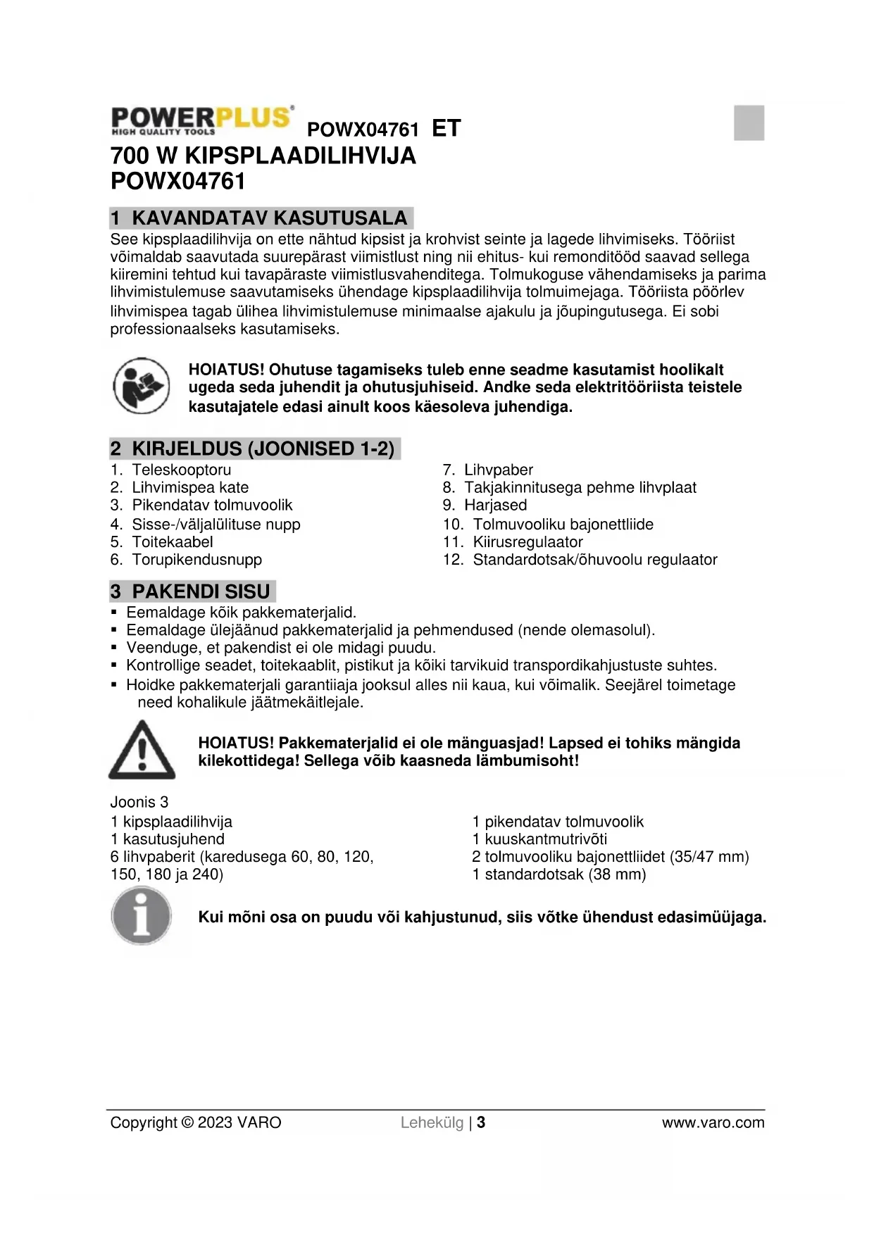 - Hoidke alati kindlat jalgealust ja tasakaalu. Ärge hinnake end üle. Kasutage nõuetekohaseid tellinguid.POWX04761 ET Copyright © 2023 VARO Lehekülg | 6 www.varo.com
