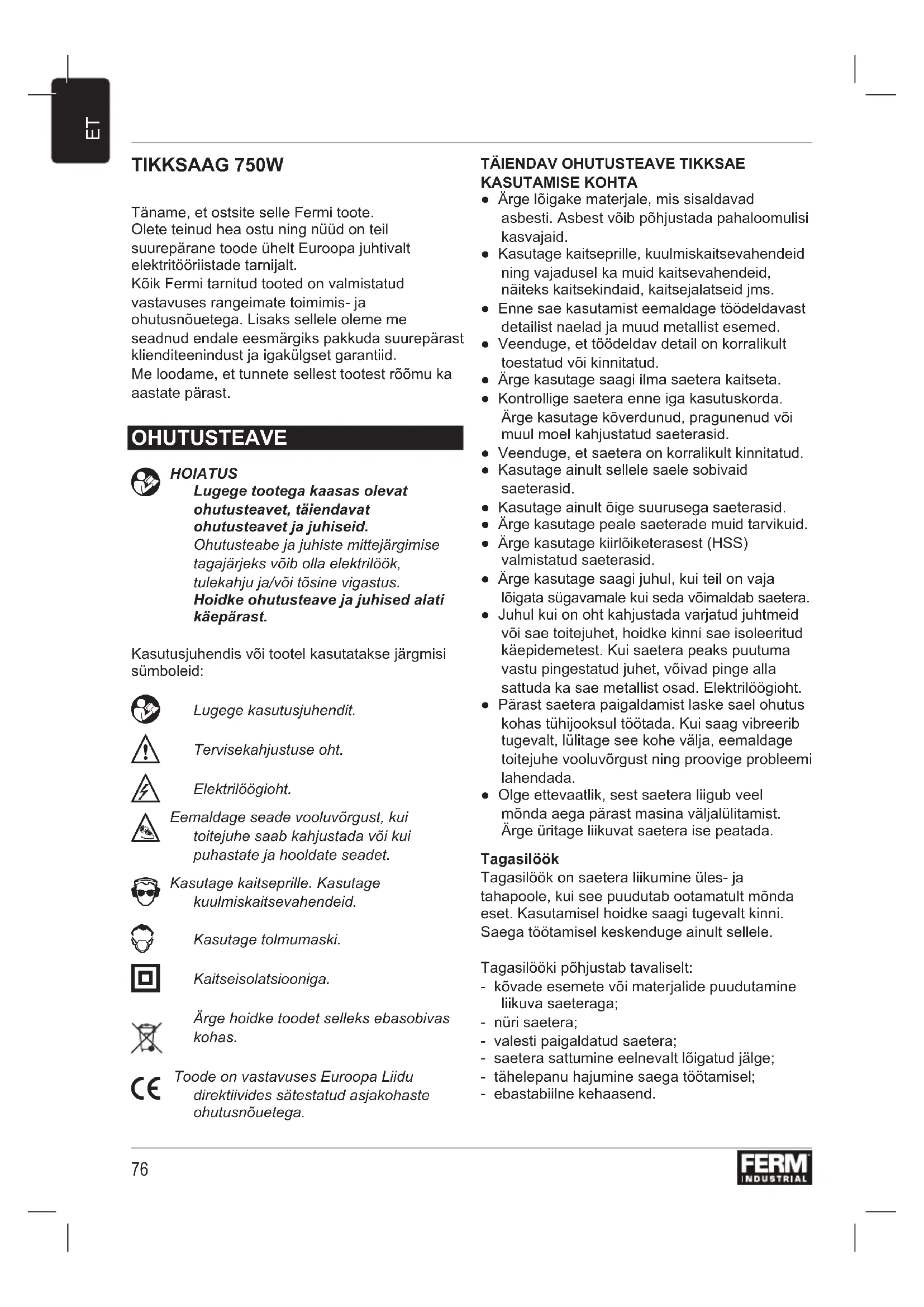 TIKKSAAG 750W Täname, et ostsite selle Fermi toote. Olete teinud hea ostu ning nüüd on teil suurepärane toode ühelt Euroopa juhtivalt elektritööriistade tarnijalt. Kõik Fermi tarnitud tooted on valmistatud vastavuses rangeimate toimimis- ja ohutusnõuetega. Lisaks sellele oleme me seadnud endale eesmärgiks pakkuda suurepärast klienditeenindust ja igakülgset garantiid. Me loodame, et tunnete sellest tootest rõõmu ka aastate pärast. OHUTUSTEAVE