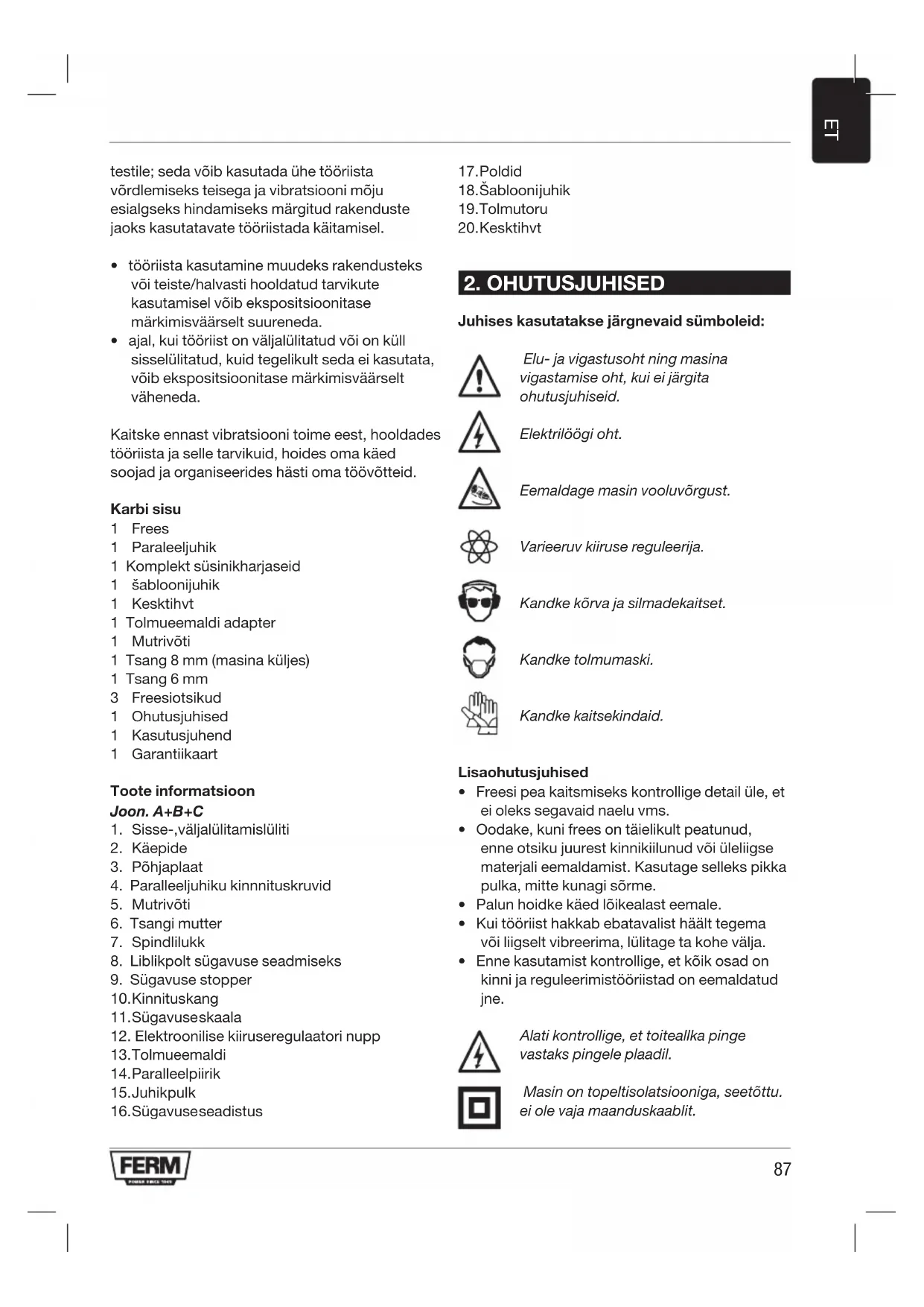 - ajal, kui tööriist on väljalülitatud või on küll sisselülitatud, kuid tegelikult seda ei kasutata, võib ekspositsioonitase märkimisväärselt väheneda. Kaitske ennast vibratsiooni toime eest, hooldades tööriista ja selle tarvikuid, hoides oma käed soojad ja organiseerides hästi oma töövõtteid. Karbi sisu 1 Frees 1 Paraleeljuhik 1 Komplekt süsinikharjaseid 1 šabloonijuhik 1 Kesktihvt 1 Tolmueemaldi adapter 1 Mutrivõti 1 Tsang 8 mm (masina küljes) 1 Tsang 6 mm 3 Freesiotsikud 1 Ohutusjuhised 1 Kasutusjuhend 1 Garantiikaart Toote informatsioon Joon. A+B+C