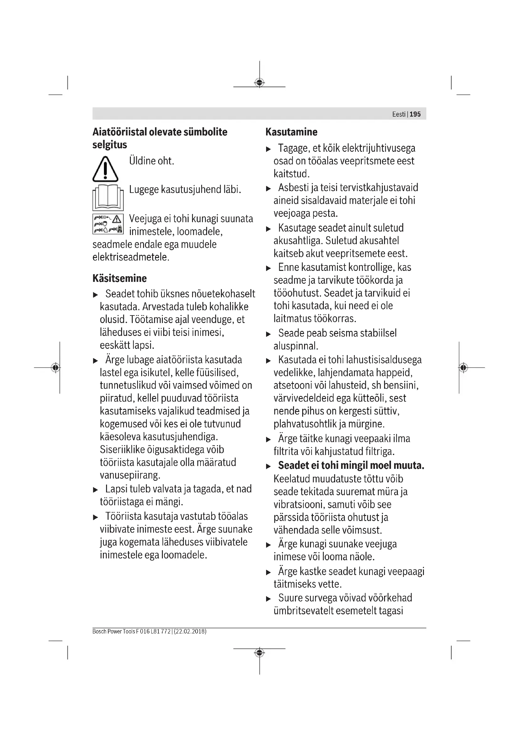 Seadetei tohi mingil moel muuta. Keelatud muudatuste tottu voib seade tekitada suuremat mura ja vibratsiooni, samuti voib see parrssida tooriista ohutust ja vahendada selle voimsust.
