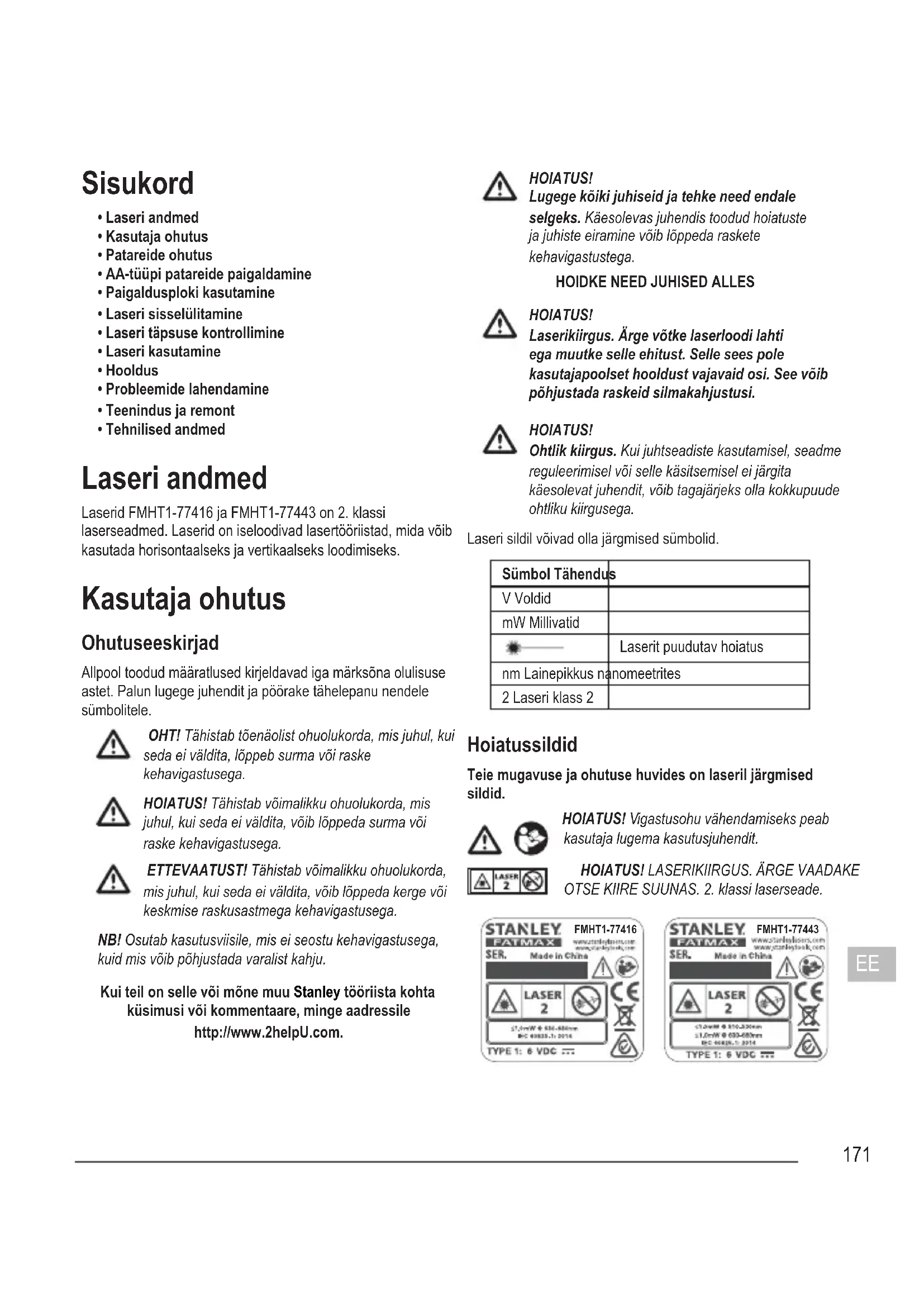 - Tehnilised andmed Laseri andmed Laserid FMHT1-77416 ja FMHT1-77443 on 2. klassi laserseadmed. Laserid on iseloodivad lasertööriistad, mida võib kasutada horisontaalseks ja vertikaalseks loodimiseks. Kasutaja ohutus Ohutuseeskirjad Allpool toodud määratlused kirjeldavad iga märksõna olulisuse astet. Palun lugege juhendit ja pöörake tähelepanu nendele sümbolitele. OHT! Tähistab tõenäolist ohuolukorda, mis juhul, kui seda ei väldita, lõppeb surma või raske kehavigastusega. HOIATUS! Tähistab võimalikku ohuolukorda, mis juhul, kui seda ei väldita, võib lõppeda surma või raske kehavigastusega. ETTEVAATUST! Tähistab võimalikku ohuolukorda, mis juhul, kui seda ei väldita, võib lõppeda kerge või keskmise raskusastmega kehavigastusega. NB! Osutab kasutusviisile, mis ei seostu kehavigastusega, kuid mis võib põhjustada varalist kahju. Kui teil on selle või mõne muu Stanley tööriista kohta küsimusi või kommentaare, minge aadressile http://www.2helpU.com. HOIATUS! Lugege kõiki juhiseid ja tehke need endale selgeks. Käesolevas juhendis toodud hoiatuste ja juhiste eiramine võib lõppeda raskete kehavigastustega.