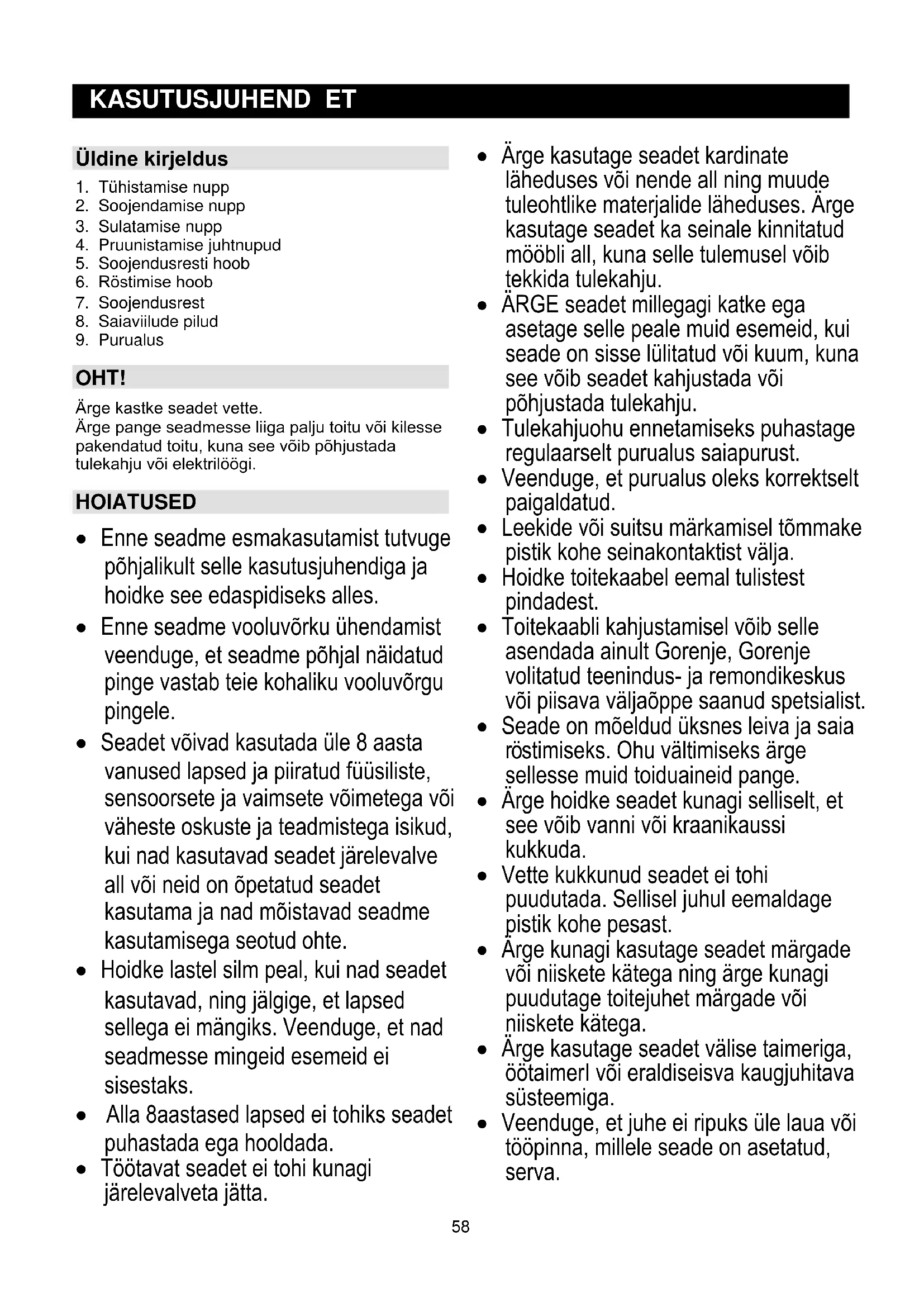 OHT! Ärge kastke seadet vette. Ärge pange seadmesse liiga palju toitu või kilesse pakendatud toitu, kuna see võib põhjustada tulekahju või elektrilöögi. HOIATUSED