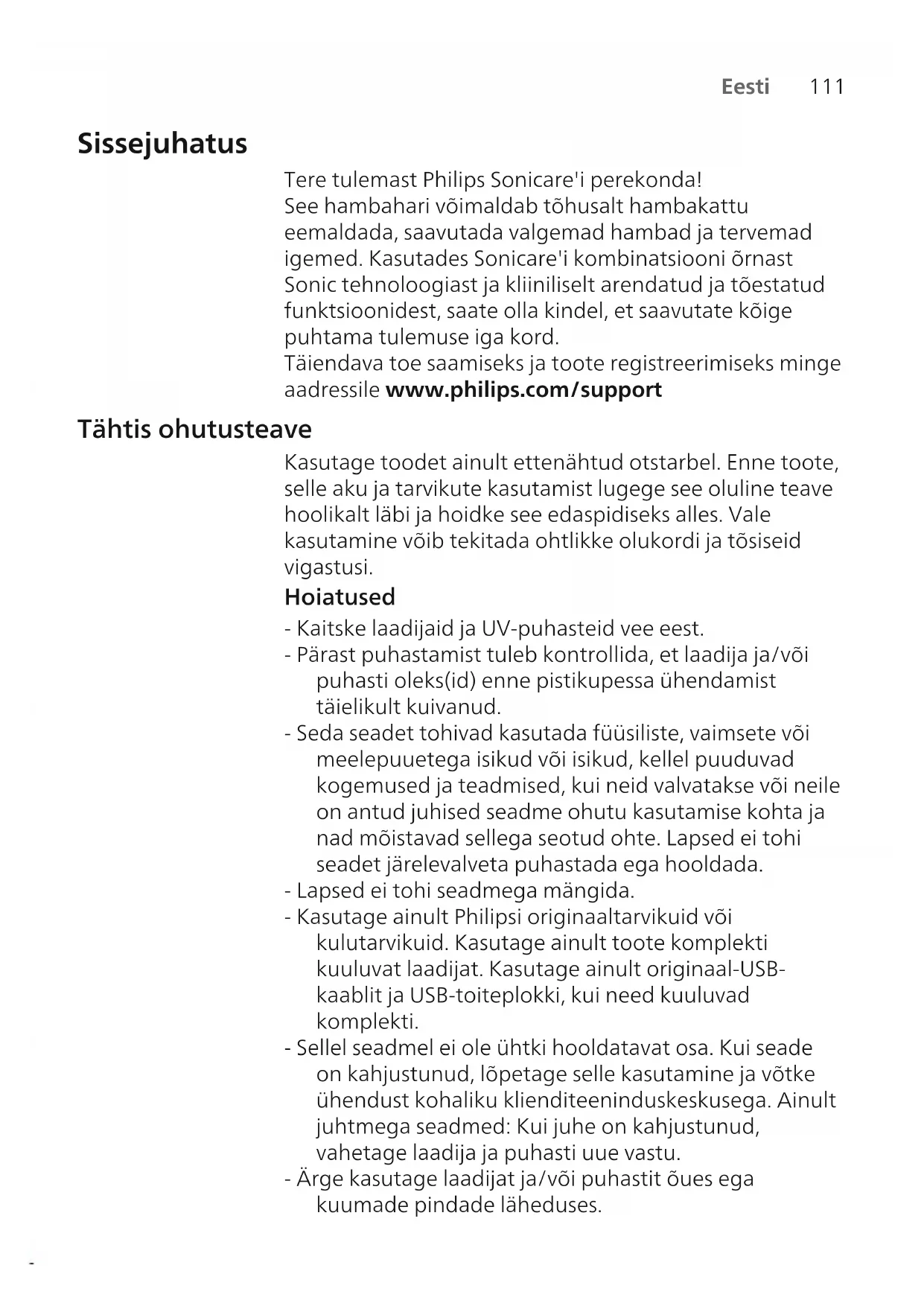 Eesti Sissejuhatus Tere tulemast Philips Sonicare'i perekonda! See hambahari võimaldab tõhusalt hambakattu eemaldada, saavutada valgemad hambad ja tervemad igemed. Kasutades Sonicare'i kombinatsiooni õrnast Sonic tehnoloogiast ja kliiniliselt arendatud ja tõestatud funktsioonidest, saate olla kindel, et saavutate kõige puhtama tulemuse iga kord. Täiendava toe saamiseks ja toote registreerimiseks minge aadressile www.philips.com/support Tähtis ohutusteave Kasutage toodet ainult ettenähtud otstarbel. Enne toote, selle aku ja tarvikute kasutamist lugege see oluline teave hoolikalt läbi ja hoidke see edaspidiseks alles. Vale kasutamine võib tekitada ohtlikke olukordi ja tõsiseid vigastusi. Hoiatused - Kaitske laadijaid ja UV-puhasteid vee eest. - Pärast puhastamist tuleb kontrollida, et laadija ja/või puhasti oleks(id) enne pistikupessa ühendamist täielikult kuivanud. - Seda seadet tohivad kasutada füüsiliste, vaimsete või meelepuuetega isikud või isikud, kellel puuduvad kogemused ja teadmised, kui neid valvatakse või neile on antud juhised seadme ohutu kasutamise kohta ja nad mõistavad sellega seotud ohte. Lapsed ei tohi seadet järelevalveta puhastada ega hooldada. - Lapsed ei tohi seadmega mängida. - Kasutage ainult Philipsi originaaltarvikuid või kulutarvikuid. Kasutage ainult toote komplekti kuuluvat laadijat. Kasutage ainult originaal-USB- kaablit ja USB-toiteplokki, kui need kuuluvad komplekti. - Sellel seadmel ei ole ühtki hooldatavat osa. Kui seade on kahjustunud, lõpetage selle kasutamine ja võtke ühendust kohaliku klienditeeninduskeskusega. Ainult juhtmega seadmed: Kui juhe on kahjustunud, vahetage laadija ja puhasti uue vastu. - Ärge kasutage laadijat ja/või puhastit õues ega kuumade pindade läheduses.112 Eesti - Ärge peske toote osasid nõudepesumasinas. - See seade on ette nähtud vaid hammaste, igemete ja keele puhastamiseks. - Hoidke puhasti alati lastele kättesaamatus kohas. - Lõpetage puhasti kasutamine, kui UV-lamp jääb põlema sel ajal, kui luuk on avatud. UV-kiirgus võib olla kahjulik inimese silmadele ja nahale. - Kasutage puhastit ainult koos paigaldatud kaitsekattega. - Ärge puudutage UV-puhasti UV-lampi, kui see on kuum. - Lõpetage harjapea kasutamine, kui selle harjased on muljutud või paindunud. Vahetage harjapead iga 3 kuu tagant (kulumisjälgede korral varem). - Vältige kokkupuudet eeterlike õlide või kookosõliga. Kokkupuute tagajärjel võivad harjased paigalt nihkuda. - Lõpetage seadme kasutamine ja pidage nõu hambaarsti/arstiga, kui pärast kasutamist esineb liigset veritsemist, kui veritsemine jätkub pärast 1. kasutusnädalat või kui tunnete ebamugavust või valu. - Kui teil on olnud viimase 2 kuu jooksul suuõõne või igemete operatsioon, pidage enne seadme kasutamist nõu hambaarstiga. - Kui kasutate südamestimulaatorit või muud implantaatseadet, võtke enne hambaharja kasutamist ühendust arsti või implantaadi tootjaga. - Kui teil on meditsiinilisi küsimusi, võtke enne seadme kasutamist ühendust oma arstiga. - See seade on personaalne hügieeniseade ega ole mõeldud üldiseks kasutamiseks hambaravikabinetis või -asutuses. Aku ohutusjuhised - See seade sisaldab patareisid, mida saavad eemaldada ainult asjatundjad. - Kasutage toodet ainult ettenähtud otstarbel. Enne toote, selle patareide ja tarvikute kasutamist lugege see teave hoolikalt läbi ja hoidke edaspidiseks kasutamiseks alles. Vale kasutamine võib tekitada ohtlikke olukordi ja tõsiseid vigastusi. Kaasasolevad tarvikud võivad erinevatel toodetel olla erinevad.113 Eesti - Kasutage ainult Philipsi originaaltarvikuid. Kasutage ainult eemaldatavat toiteplokki TCBxxxx, HX6100, HX6110, HX6160 või WAAxxxx. - Hoidke toode ja akud eemal tulest ja ärge jätke neid otsese päikesevalguse või kõrge temperatuuri kätte. - Kui toode läheb ebatavaliselt kuumaks või eritab ebatavalist lõhna, muudab värvi või kui laadimine võtab tavapärasest kauem aega, lõpetage toote kasutamine ja laadimine ning võtke ühendust Philipsiga. - Ärge pange tooteid ja nende akusid mikrolaineahju või induktsioonpliitidele. - Akude kuumenemise või mürgiste või ohtlike ainete vabanemise vältimiseks ärge toodet ega akusid avage, muutke, augustage, kahjustage ega võtke osadeks lahti. Ärge akusid lühistage, üle laadige ega laadige pööratud polaarsusega. - See seade sisaldab akusid, mida ei saa vahetada. Kui patarei kasutuskestus hakkab lõppema, tuleb seade nõuetekohaselt kasutuselt kõrvaldada, vt jaotist Ringlussevõtt. - Kahjustunud või lekkivate akude korral vältige nende kokkupuudet naha või silmadega. Kui see peaks juhtuma, siis loputage viivitamata rohke veega ja pöörduge arsti poole. - Patareide käsitsemisel veenduge, et teie käed, toode ja patareid oleksid kuivad. - Juhusliku lühisesse sattumise vältimiseks pärast akude eemaldamist ärge laske akuklemmidel kokku puutuda metallobjektidega (nt mündid, juuksenõelad, sõrmused). Ärge mähkige patareisid alumiiniumfooliumisse. Enne äraviskamist katke patareide klemmid teibiga või pange patareid kilekotti. - Laadige, kasutage ja hoidke toodet temperatuuril 0°C kuni 40°C. Säilitamis- ja transportimistingimused Temperatuur –10 kuni +60°C.114 Eesti Elektromagnetväljad (EMF) Käesolev Philips seade on vastavuses kõigi elektromagnetvälja mõju alla sattumist käsitlevate standardite ja määrustega. Raadiosideseadmete direktiiv Philips kinnitab käesolevaga, et raadiosagedusliku seadmega (Bluetooth, NFC) elektrilised hambaharjad on vastavuses direktiiviga 2014/53/EL. - Bluetoothi raadiosageduslik liides töötab toodetes, kus seda kasutatakse, sagedusel 2,4GHz. - Bluetooth-seadme maksimaalne väljundvõimsus on 3 dBm. - NFC raadiosageduslik liides töötab toodetes, kus seda kasutatakse, sagedusel 13,56MHz. - Seadme maksimaalne edastatav raadiosageduslik võimsus on 30,16dBm. ELi vastavusdeklaratsiooni täistekst on saadaval järgmise aadressil: www.philips.com/support Märkus. Funkts