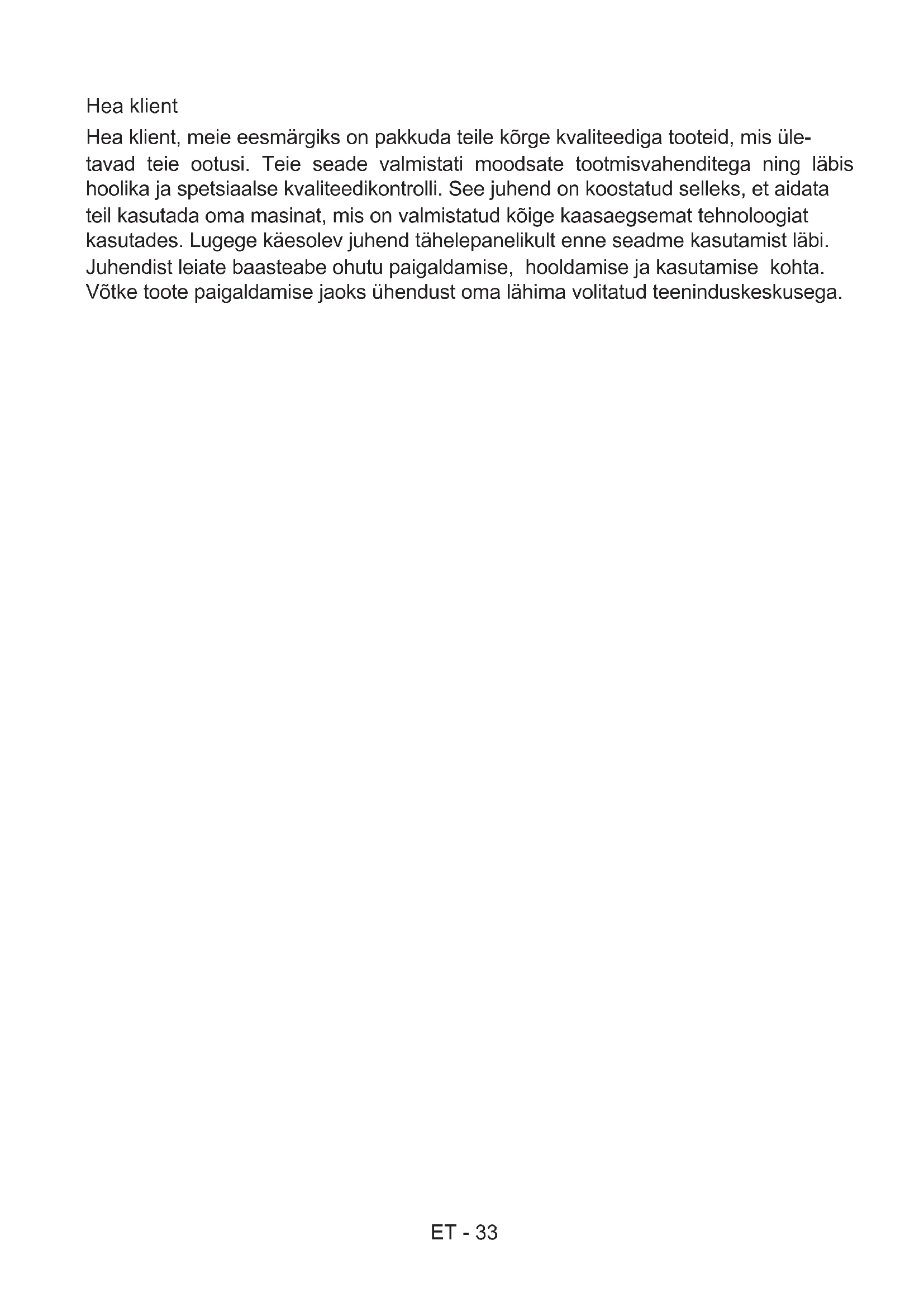 - Hooldust ja remonti võivad teos- tada ainult volitatud hooldustehni- kud. Mittevolitatud tehnikute teos- tatud paigaldus- ja remonditööd võivad teid ohtu seada. Seadme tehniliste andmete ükskõik milline muutmine on ohtlik.