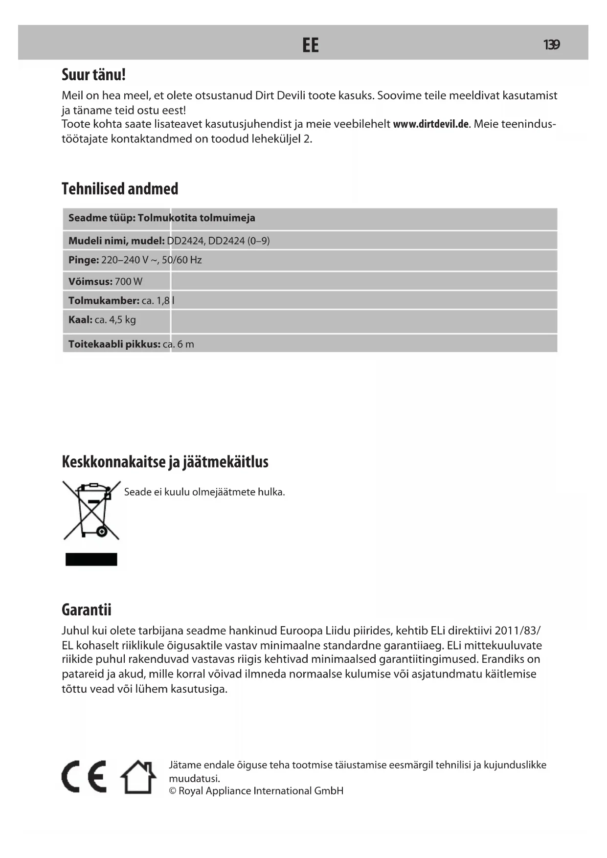 Garantii Juhul kui olete tarbijana seadme hankinud Euroopa Liidu piirides, kehtib ELi direktiivi 2011/83/ EL kohaselt riiklikule õigusaktile vastav minimaalne standardne garantiiaeg. ELi mittekuuluvate riikide puhul rakenduvad vastavas riigis kehtivad minimaalsed garantiitingimused. Erandiks on patareid ja akud, mille korral võivad ilmneda normaalse kulumise või asjatundmatu käitlemise tõttu vead või lühem kasutusiga. Jätame endale õiguse teha tootmise täiustamise eesmärgil tehnilisi ja kujunduslikke muudatusi. © Royal Appliance International GmbH Suur tänu! Meil on hea meel, et olete otsustanud Dirt Devili toote kasuks. Soovime teile meeldivat kasutamist ja täname teid ostu eest! Toote kohta saate lisateavet kasutusjuhendist ja meie veebilehelt www.dirtdevil.de. Meie teenindus- töötajate kontaktandmed on toodud leheküljel2. Tehnilised andmed Seadme tüüp: Tolmukotita tolmuimeja Mudeli nimi, mudel: DD2424, DD2424 (0–9) Pinge: 220–240 V ~, 50/60 Hz Võimsus: 700 W Tolmukamber: ca. 1,8 l Kaal: ca. 4,5 kg Toitekaabli pikkus: ca. 6 m