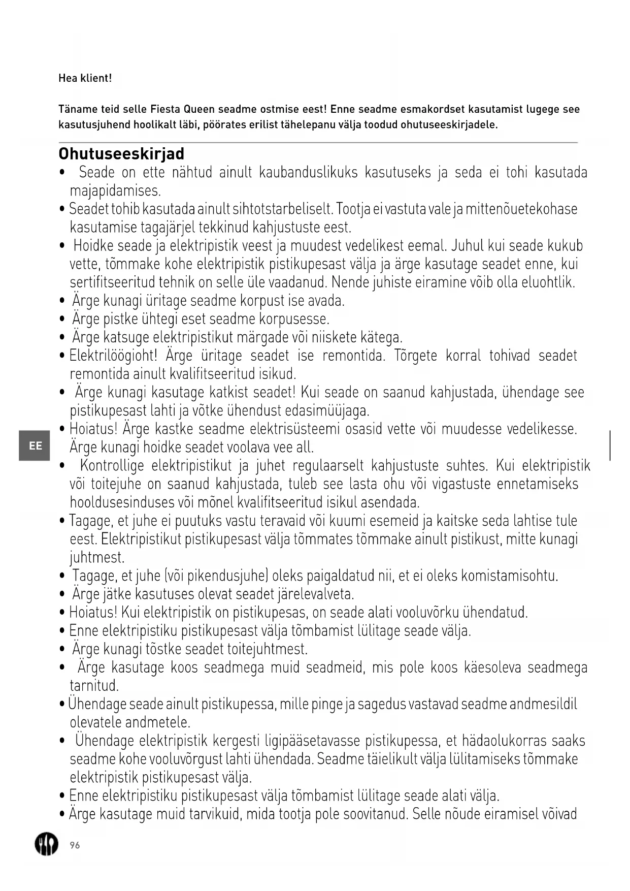 Hea klient! Täname teid selle Fiesta Queen seadme ostmise eest! Enne seadme esmakordset kasutamist lugege see kasutusjuhend hoolikalt läbi, pöörates erilist tähelepanu välja toodud ohutuseeskirjadele. Ohutuseeskirjad