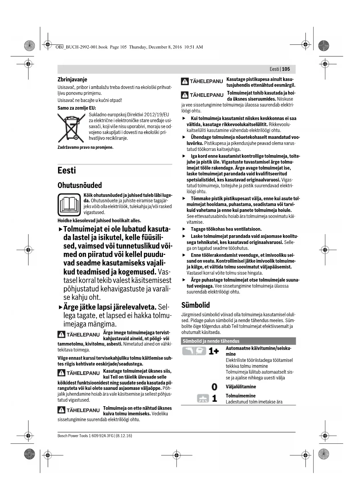 Servisiranje i savjetovanje o primjeni Ovlašteni servis će odgovoriti na vaša pitanja o popravcima i održavanju vašeg proizvoda te o rezervnim dijelovima. Pove- ćane crteže i informacije o rezervnim dijelovima možete naći na adresi: www.bosch-pt.com Bosch tim za savjetovanje o primjeni rado će vam pomoći od- govorom na pitanja o našim proizvodima i priboru. Za slučaj povratnih upita ili naručivanja rezervnih dijelova, molimo vas neizostavno navedite 10-znamenkasti kataloški broj sa tipske pločice proizvoda. Hrvatski Robert Bosch d.o.o Kneza Branimira 22 10040 Zagreb Tel.: (01) 2958051 Fax: (01) 2958050 –Za isključivanje usisavača prekidač za bira- nje načina rada 2 namjestite na simbol »Is- ključivanje«. –Za puštanje u rad Start/stop auto- matike usisavača prekidač za biranje načina rada 2 namjestite na simbol »Start/stop automatika«. –Za isključivanje usisavača prekidač za bira- nje načina rada 2 namjestite na simbol »Is- ključivanje«. OBJ_BUCH-2992-001.book Page 104 Thursday, December 8, 2016 10:51 AMEesti | 105Bosch Power Tools 1 609 92A 3FG | (8.12.16) Zbrinjavanje Usisavač, pribor i ambalažu treba dovesti na ekološki prihvat-ljivu ponovnu primjenu.Usisavač ne bacajte u kućni otpad!Samo za zemlje EU:Sukladno europskoj Direktivi 2012/19/EU za električne i elektroničke stare uređaje usi-savači, koji više nisu uporabivi, moraju se od-vojeno sakupljati i dovesti na ekološki pri-hvatljivo recikliranje.Zadržavamo pravo na promjene. Eesti Ohutusnõuded Kõik ohutusnõuded ja juhised tuleb läbi luge-da. Ohutusnõuete ja juhiste eiramise tagajär-jeks võib olla elektrilöök, tulekahju ja/või rasked vigastused.Hoidke käesolevad juhised hoolikalt alles. Tolmuimejat ei ole lubatud kasuta- da lastel ja isikutel, kelle füüsili- sed, vaimsed või tunnetuslikud või- med on piiratud või kellel puudu- vad seadme kasutamiseks vajali- kud teadmised ja kogemused. Vas- tasel korral tekib valest käsitsemisest põhjustatud kehavigastuste ja varali- se kahju oht. Ärge jätke lapsi järelevalveta. Sel- lega tagate, et lapsed ei hakka tolmu- imejaga mängima. Ärge imege tolmuimejaga tervist-kahjustavaid aineid, nt pöögi- või tammetolmu, kivitolmu, asbesti. Nimetatud ained on vähki-tekitava toimega.Viige ennast kurssi tervisekahjuliku tolmu käitlemise suh-tes riigis kehtivate eeskirjade/seadustega.Kasutage tolmuimejat üksnes siis, kui Teil on täielik ülevaade selle kõikidest funktsioonidest ning suudate seda kasutada pii-ranguteta või kui olete saanud asjaomase väljaõppe. Põh-jalik juhendamine hoiab ära vale käsitsemise ja sellest põhjus-tatud vigastused.Tolmuimeja on ette nähtud üksnes kuiva tolmu imemiseks. Vedeliku sissetungimine suurendab elektrilöögi ohtu.Kasutage pistikupesa ainult kasu-tusjuhendis ettenähtud eesmärgil.Tolmuimejat tohib kasutada ja hoi-da üksnes siseruumides. Niiskuse ja vee sissetungimine tolmuimeja ülaossa suurendab elektri-löögi ohtu. Kui tolmuimeja kasutamist niiskes keskkonnas ei saa vältida, kasutage rikkevoolukaitselülitit. Rikkevoolu-kaitselüliti kasutamine vähendab elektrilöögi ohtu. Ühendage tolmuimeja nõuetekohaselt maandatud voo-luvõrku. Pistikupesa ja pikendusjuhe peavad olema varus-tatud töökorras kaitsejuhiga. Iga kord enne kasutamist kontrollige tolmuimeja, toite-juhe ja pistik üle. Vigastuste tuvastamisel ärge tolmu-imejat tööle rakendage. Ärge avage tolmuimejat ise, laske tolmuimejat parandada vaid kvalifitseeritud spetsialistidel, kes kasutavad originaalvaruosi. Vigas-tatud tolmuimeja, toitejuhe ja pistik suurendavad elektri-löögi ohtu. Tõmmake pistik pistikupesast välja, enne kui asute tol-muimejat hooldama, puhastama, seadistama või tarvi-kuid vahetama ja enne kui panete tolmuimeja hoiule. See ettevaatusabinõu hoiab ära tolmuimeja soovimatu käi-vitamise. Tagage töökohas hea ventilatsioon. Laske tolmuimejat parandada vaid asjaomase koolitu-sega tehnikutel, kes kasutavad originaalvaruosi. Selle-ga on tagatud seadme tööohutus. Enne töölerakendamist veenduge, et imivooliku sei-sund on veatu. Kontrollimisel jätke imivoolik tolmuime-ja külge, et vältida tolmu soovimatut väljapääsemist. Vastasel korral võite tolmu sisse hingata. Ärge puhastage tolmuimejat otse tolmuimejale suuna-tud veejoaga. Vee sissetungimine tolmuimeja ülaossa suurendab elektrilöögi ohtu. Sümbolid Järgmised sümbolid võivad olla tolmuimeja kasutamisel oluli-sed. Pidage palun sümbolid ja nende tähendus meeles. Süm-bolite õige tõlgendus aitab Teil tolmuimejat efektiivsemalt ja ohutumalt käsitseda. TÄHELEPANU TÄHELEPANU TÄHELEPANU Sümbolid ja nende tähendusAutomaatne käivitumine/seisku- mine Elektriliste tööriistadega töötamisel tekkiva tolmu imemineTolmuimeja lülitub automaatselt sis-se ja ajalise nihkega uuesti väljaVäljalülitamineTolmuimemineLadestunud tolm imetakse ära TÄHELEPANU TÄHELEPANU OBJ_BUCH-2992-001.book Page 105 Thursday, December 8, 2016 10:51 AM106 | Eesti 1 609 92A 3FG | (8.12.16) Bosch Power Tools Seadme ja selle funktsioonide kirjel- dus Nõuetekohane kasutamine Tolmuimeja on ette nähtud terviseohutute kuivade ainete imemiseks ning see sobib eeskätt elektriliste tööriistade pu- hastamiseks tolmust ja laastudest. Tolmuimeja on ette nähtud üksnes eraviisiliseks kasutami- seks ega sobi tööstuslikuks kasutamiseks. Kasutage tolmuimejat üksnes siis, kui Teil on täielik ülevaade selle kõikidest funktsioonidest ning suudate seda kasutada piiranguteta või kui olete saanud asjaomase väljaõppe. Seadme osad Tolmuimeja osade numeratsiooni aluseks on jooniste lehekül- jel toodud numbrid. 1 Imivooliku hoidik 2 Töörežiimilüliti 3 Toitejuhtme hoidik 4 Elektrilise tööriista ühenduspesa 5 Kandekäepide 6 Vuugiotsaku/põrandaotsaku hoidik 7 Voolikuliitmik 8 Tolmukambri vabastusnupp 9 Tolmukamber 10 Imivoolik 11 Kõverdatud otsak* 12 Tolmueemaldusadapter 13 Piluotsak 14 Põrandaotsak 15 Survenupp 16 Ühendusäärik 17 Tolmumahuti k