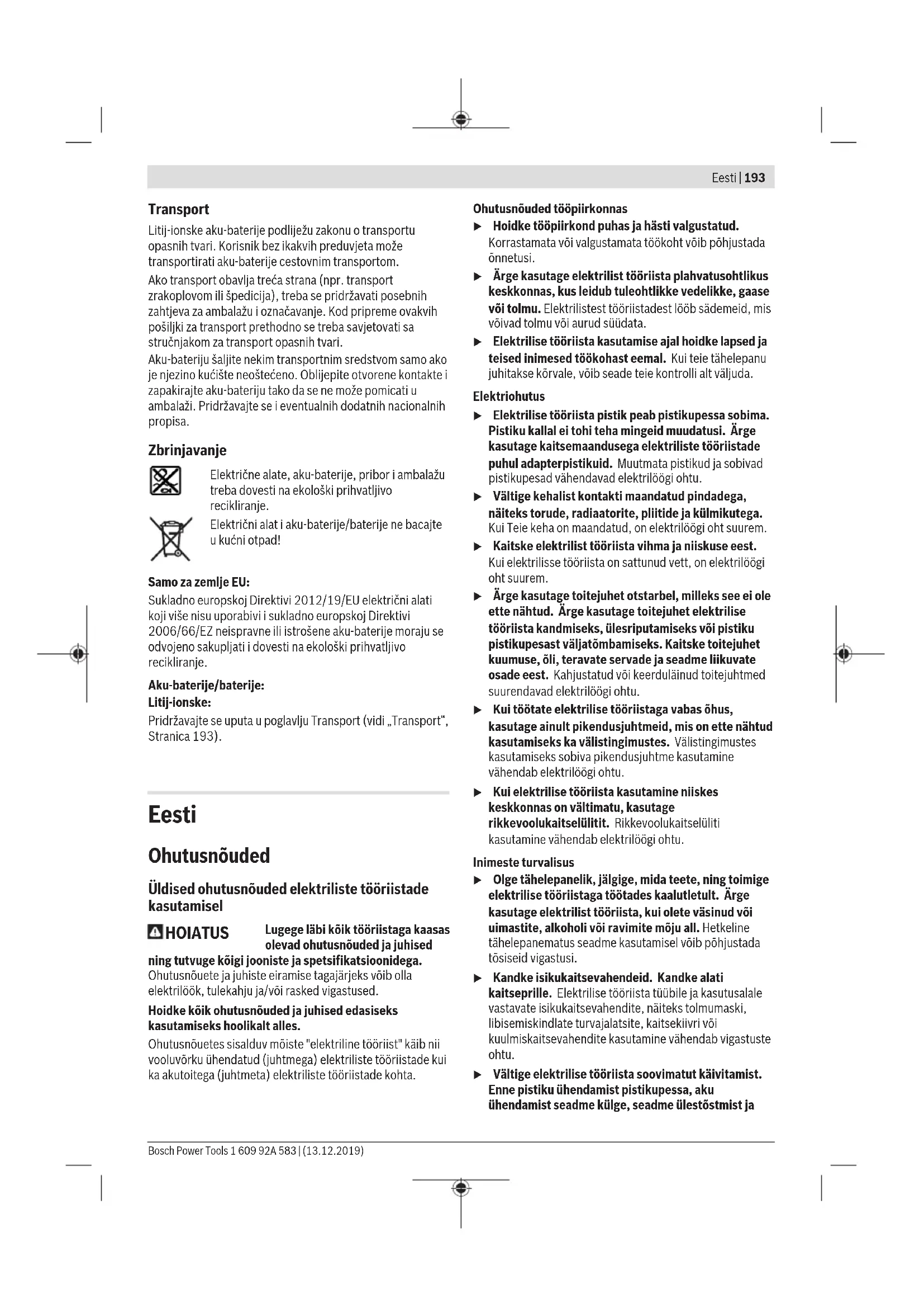 Područje većeg broja okretaja; za rad s malim promjerom bušenja. u Prekidač za biranje brzina uvijek pomaknite do graničnika. Električni alat bi se inače mogao oštetiti. Inercijska kočnica Pri otpuštanju prekidača za uključivanje/isključivanje (11) stezna glava se zakoči i na taj način se sprječava zaustavljanje radnog alata. Pri uvrtanju vijaka otpustite prekidač za uključivanje/ isključivanje (11) tek kada je vijak uvrnut u ravnini s izratkom. Glava vijka u tom slučaju neće prodirati u izradak. Zaštita od preopterećenja ovisna o temperaturi Kod namjenske uporabe se električni alat ne može preopteretiti. Kod prevelikog opterećenja ili napuštanja područja dopuštene radne temperature smanjit će se broj okretaja. Električni alat radi ponovno s punim brojem okretaja tek nakon postizanja dopuštene radne temperature. Automatska blokada vretena (Auto-Lock) Ako prekidač za uključivanje/isključivanje (11) nije pritisnut, blokira se bušno vreteno, a time i prihvat alata (1). To omogućava uvrtanje vijaka i kod ispražnjene aku-baterije (7) odnosno korištenje električnog alata kao izvijača. Upute za rad u Električni alat stavite na maticu/vijak samo u isključenom stanju. Rotirajući radni alati mogu kliznuti. Nakon duljeg rada s manjim brojem okretaja, električni alat trebate ostaviti da u svrhu hlađenja radi cca. 3minute pri maks. broju okretaja u praznom hodu. Za bušenje pločica preklopku stavite na simbol „Bušenje“. Nakon bušenja pločice preklopku stavite na simbol „Udarno bušenje“ i radite s udarcem. Kod rada u betonu, kamenu i zidovima koristite svrdlo za tvrdi metal. Kod bušenja u metal koristite samo besprijekorna, naoštrena HSS svrdla (HSS=brzorezni čelik). Odgovarajuću kvalitetu jamči program Bosch pribora. Prije uvrtanja većih, duljih vijaka u tvrde materijale trebate s promjerom jezgre navoja prethodno bušiti na cca. 2/3 duljine vijka. Za vađenje bita odvijača ili univerzalnog držača ne smijete koristiti pomagala. Držač bita (vidjeti sliku D1) U magnetski držač bita možete utaknuti bitove izvijača radi spremanja. Kopča remena za nošenje (vidjeti sliku D2) Pomoću kopče remena za nošenje (6) možete objesiti električni alat npr. na remen. U tom slučaju imate obje ruke slobodne i električni alat je u svakom trenutku spreman za držanje. Održavanje i servisiranje Održavanje i čišćenje u Prije svih radova na električnom alatu (npr. održavanje, zamjena alata, itd.), kao i kod njegovog transporta i spremanja, aku-bateriju treba izvaditi iz električnog alata. Kod nehotičnog aktiviranja prekidača za uključivanje/isključivanje postoji opasnost od ozljeda. u Električni alat i otvore za hlađenje održavajte čistima kako bi se moglo dobro i sigurno raditi. Servisna služba i savjeti o uporabi Naša servisna služba će odgovoriti na vaša pitanja o popravku i održavanju vašeg proizvoda, kao i o rezervnim dijelovima. Crteže u rastavljenom obliku i informacije o rezervnim dijelovima možete naći i na našoj adresi: www.bosch-pt.com Tim Bosch savjetnika o uporabi rado će odgovoriti na vaša pitanja o našim proizvodima i njihovom priboru. U slučaju upita ili naručivanja rezervnih dijelova, molimo vas obavezno navedite 10‑znamenkasti kataloški broj s tipske pločice proizvoda. Hrvatski Robert Bosch d.o.o PT/SHR-BSC Kneza Branimira 22 10040 Zagreb Tel.: +385 12 958 051 Fax: +385 12 958 050 E-Mail: RBKN-bsc@hr.bosch.com www.bosch.hr Bosnia Elektro-Servis Vl. Mehmed Nalić Dzemala Bijedića bb 71000 Sarajevo Tel./Fax: +387 33454089 E-Mail: bosch@bih.net.ba 1 609 92A 583 | (13.12.2019) Bosch Power ToolsEesti | 193 Transport Litij-ionske aku-baterije podliježu zakonu o transportu opasnih tvari. Korisnik bez ikakvih preduvjeta može transportirati aku-baterije cestovnim transportom. Ako transport obavlja treća strana (npr. transport zrakoplovom ili špedicija), treba se pridržavati posebnih zahtjeva za ambalažu i označavanje. Kod pripreme ovakvih pošiljki za transport prethodno se treba savjetovati sa stručnjakom za transport opasnih tvari. Aku-bateriju šaljite nekim transportnim sredstvom samo ako je njezino kućište neoštećeno. Oblijepite otvorene kontakte i zapakirajte aku-bateriju tako da se ne može pomicati u ambalaži. Pridržavajte se i eventualnih dodatnih nacionalnih propisa. Zbrinjavanje Električne alate, aku-baterije, pribor i ambalažu treba dovesti na ekološki prihvatljivo recikliranje. Električni alat i aku-baterije/baterije ne bacajte u kućni otpad! Samo za zemljeEU: Sukladno europskoj Direktivi 2012/19/EU električni alati koji više nisu uporabivi i sukladno europskoj Direktivi 2006/66/EZ neispravne ili istrošene aku-baterije moraju se odvojeno sakupljati i dovesti na ekološki prihvatljivo recikliranje. Aku-baterije/baterije: Litij-ionske: Pridržavajte se uputa u poglavlju Transport (vidi „Transport“, Stranica193). Eesti Ohutusnõuded Üldised ohutusnõuded elektriliste tööriistade kasutamisel HOIATUS Lugege läbi kõik tööriistaga kaasas olevad ohutusnõuded ja juhised ning tutvuge kõigi jooniste ja spetsifikatsioonidega. Ohutusnõuete ja juhiste eiramise tagajärjeks võib olla elektrilöök, tulekahju ja/või rasked vigastused. Hoidke kõik ohutusnõuded ja juhised edasiseks kasutamiseks hoolikalt alles. Ohutusnõuetes sisalduv mõiste "elektriline tööriist" käib nii vooluvõrku ühendatud (juhtmega) elektriliste tööriistade kui ka akutoitega (juhtmeta) elektriliste tööriistade kohta. Ohutusnõuded tööpiirkonnas u Hoidke tööpiirkond puhas ja hästi valgustatud. Korrastamata või valgustamata töökoht võib põhjustada õnnetusi. u Ärge kasutage elektrilist tööriista plahvatusohtlikus keskkonnas, kus leidub tuleohtlikke vedelikke, gaase või tolmu. Elektrilistest tööriistadest lööb sädemeid, mis võivad tolmu või aurud süüdata. u Elektrilise tööriista kasutamise ajal hoidke lapsed ja teised inimesed töökohast eemal. Kui teie tähel