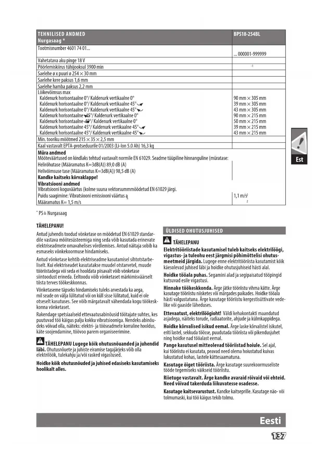 Saelehe ø x puuri ø 254 × 30 mm Saelehe kere paksus 1,6 mm Saelehe hamba paksus 2,2 mm Lõikevõimsus max Kaldenurk horisontaalne 0°/ Kaldenurk vertikaalne 0° Kaldenurk horisontaalne 0°/ Kaldenurk vertikaalne 45° Kaldenurk horisontaalne 0°/ Kaldenurk vertikaalne 45° Kaldenurk horisontaalne 45°/ Kaldenurk vertikaalne 0° Kaldenurk horisontaalne 45°/ Kaldenurk vertikaalne 0° Kaldenurk horisontaalne 45°/ Kaldenurk vertikaalne 45° Kaldenurk horisontaalne 45°/ Kaldenurk vertikaalne 45° 90 mm × 305 mm 39 mm × 305 mm 43 mm × 305 mm 90 mm × 215 mm 50 mm × 215 mm 39 mm × 215 mm 43 mm × 215 mm Min. tooriku mõõtmed 215 × 35 × 2,5 mm Kaal vastavalt EPTA-protseduurile 01/2003 (Li-Ion 5.0 Ah) 16,3 kg Müra andmed Mõõteväärtused on kindlaks tehtud vastavalt normile EN 61029. Seadme tüüpiline hinnanguline (müratase: Helirõhutase (Määramatus K=3dB(A)) 89,0 dB (A) Helivõimsuse tase (Määramatus K=3dB(A)) 98,5 dB (A) Kandke kaitseks kõrvaklappe! Vibratsiooni andmed Vibratsiooni koguväärtus (kolme suuna vektorsummmõõdetud EN 61029 järgi. Puidu saagimine: Vibratsiooni emissiooni väärtus a