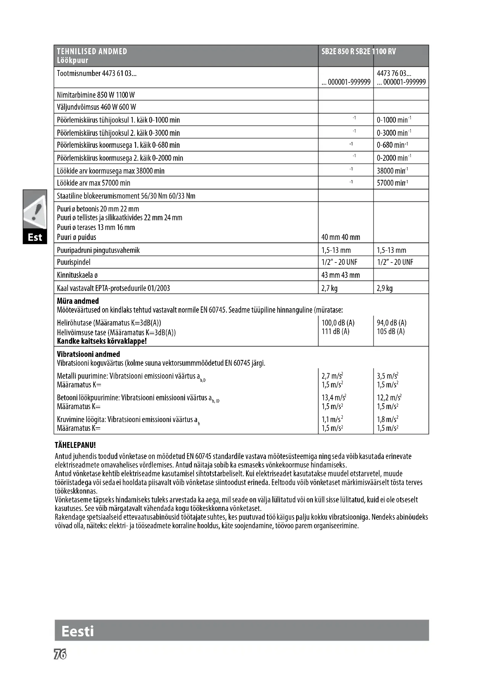 Staatiline blokeerumismoment 56/30 Nm 60/33 Nm Puuri ø betoonis 20 mm 22 mm Puuri ø tellistes ja silikaatkivides 22 mm 24 mm Puuri ø terases 13 mm 16 mm Puuri ø puidus 40 mm 40 mm Puuripadruni pingutusvahemik 1,5-13 mm 1,5-13 mm Puurispindel 1/2” - 20 UNF 1/2” - 20 UNF Kinnituskaela ø 43 mm 43 mm Kaal vastavalt EPTA-protseduurile 01/2003 2,7 kg 2,9 kg Müra andmed Mõõteväärtused on kindlaks tehtud vastavalt normile EN 60745. Seadme tüüpiline hinnanguline (müratase: Helirõhutase (Määramatus K=3dB(A)) Helivõimsuse tase (Määramatus K=3dB(A)) Kandke kaitseks kõrvaklappe! 100,0 dB (A) 111 dB (A) 94,0 dB (A) 105 dB (A) Vibratsiooni andmed Vibratsiooni koguväärtus (kolme suuna vektorsummmõõdetud EN 60745 järgi. Metalli puurimine: Vibratsiooni emissiooni väärtus a h,D Määramatus K= 2,7 m/s