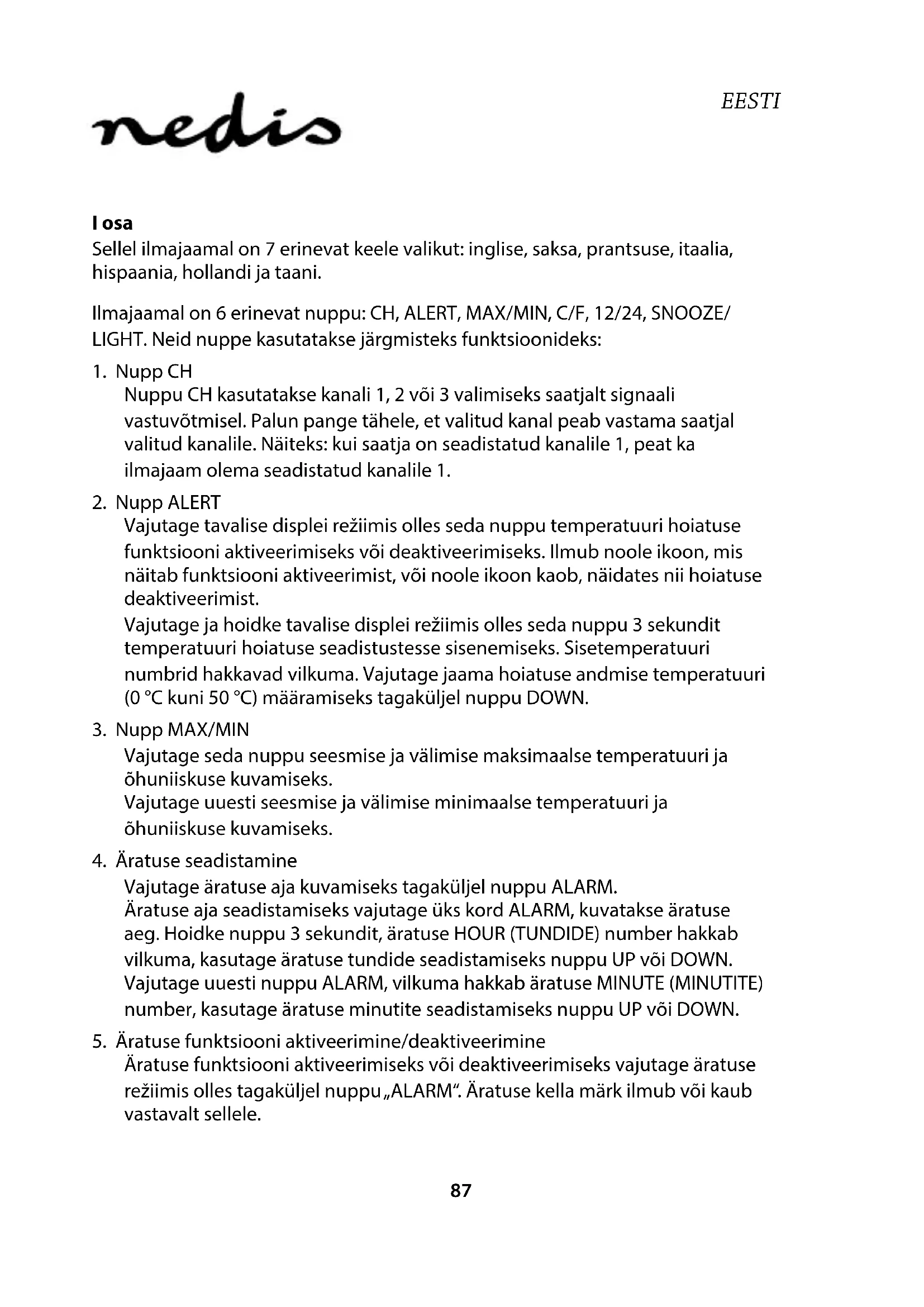I osa Sellel ilmajaamal on 7 erinevat keele valikut: inglise, saksa, prantsuse, itaalia, hispaania, hollandi ja taani. Ilmajaamal on 6 erinevat nuppu: CH, ALERT, MAX/MIN, C/F, 12/24, SNOOZE/ LIGHT. Neid nuppe kasutatakse järgmisteks funktsioonideks: