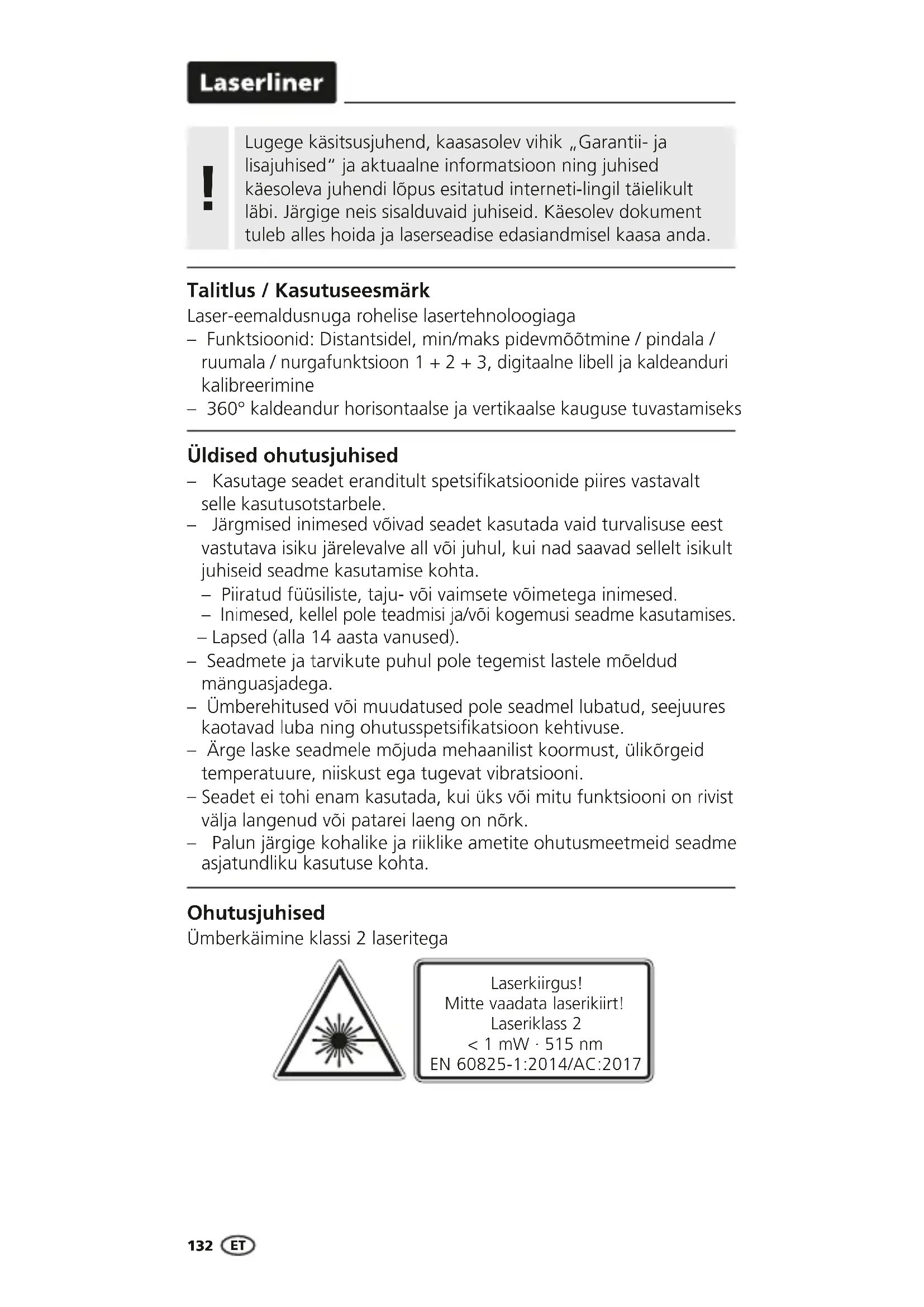 Roheline lasertehnoloogia DLD teostuses lasermooduleid iseloomustab joone kõrge kvaliteet, puhas, selge ja seetõttu hästi nähtav joonepilt. Varasemate põlvkondadega võrreldes on need temperatuuristabiilsemad ja energiatõhusamad. Peale selle on inimsilma tundlikkus kõrgem rohelise laseri kui näiteks punase laseri lainepiirkonnas. Seetõttu paistab roheline laserdiood punasega võrreldes palju heledam. Rohelised laserid – spetsiaalselt DLD teostus – pakuvad seega laserjoone nähtavusega seonduvalt ebasoodsates tingimustes arvukaid eeliseid. U 6 korda eredam kui tüüpiline 630 - 660 nm laser – Mõõteseade vastab elektromagnetilise ühilduvuse eeskirjadele ja piirväärtustele vastavalt EMC-määrusele 2014/30/EL. – Järgida tuleb kohalikke käituspiiranguid, näiteks haiglates, lennujaamades, tanklates või südamerütmuritega inimeste läheduses. Valitseb ohtliku mõjutamise või häirimise võimalus elektrooniliste seadmete poolt ja kaudu. – Mõõtetäpsust võivad mõjutada kasutamine suure pinge või tugevate elektromagnetiliste vahelduvväljade läheduses. Ohutusjuhised Elektromagnetilise kiirgusega ümber käimine – Tähelepanu: Ärge vaadake otsesesse või peegelduvasse kiirde. – Ärge suunake laserkiirt inimeste peale. – Kui klassi 2 laserkiirgus satub silma, siis tuleb silmad teadlikult sulgeda ja pea kohe kiire eest ära liigutada. – Manipulatsioonid (muudatused) on laserseadisel keelatud. – Ärge vaadelge laserkiirt ega reektsioone kunagi optiliste seadmetega (luup, mikroskoop, pikksilm, ...). ET134