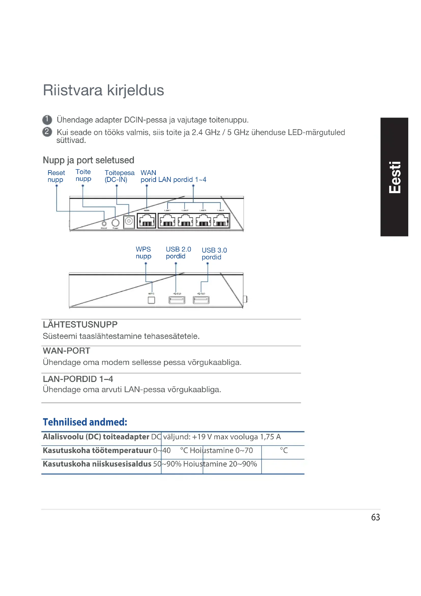 Kui seade on tööks valmis, siis toite ja 2.4 GHz / 5 GHz ühenduse LED-märgutuled süttivad. Riistvara kirjeldus Nupp ja port seletused LÄHTESTUSNUPP Süsteemi taaslähtestamine tehasesätetele. WAN-PORT Ühendage oma modem sellesse pessa võrgukaabliga. LAN-PORDID 1–4 Ühendage oma arvuti LAN-pessa võrgukaabliga. WPS nupp Toite nupp Toitepesa (DC-IN) WAN porid LAN pordid 1~4Reset nupp USB 2.0 pordidUSB 3.0 pordid Alalisvoolu (DC) toiteadapter DC väljund: +19 V max vooluga 1,75 A Kasutuskoha töötemperatuur 0~40