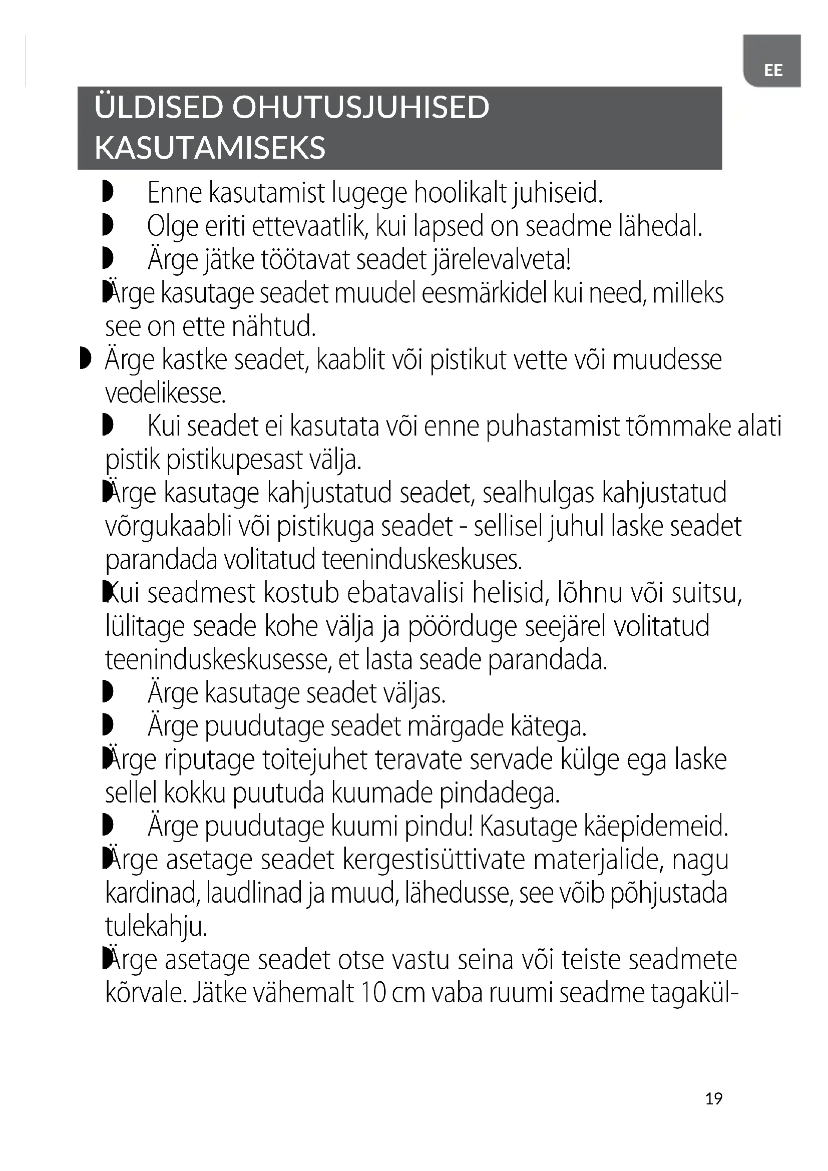 ÜLDISED OHUTUSJUHISED KASUTAMISEKS Enne kasutamist lugege hoolikalt juhiseid. Olge eriti ettevaatlik, kui lapsed on seadme lähedal. Ärge jätke töötavat seadet järelevalveta!