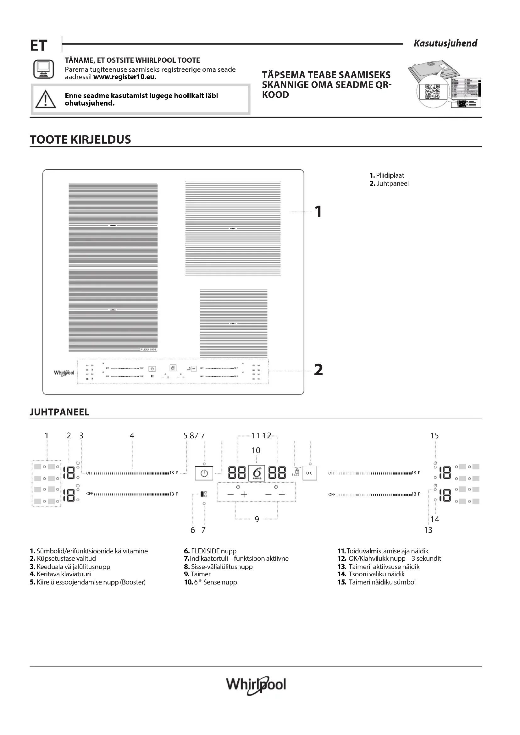 - Ewentualnie można, skontaktować się naszą obsługą posprzedażową (patrz numer telefonu w książeczce gwarancyjnej). W przypadku kontaktu z naszą obsługą posprzedażową, prosimy podać kody z tabliczki znamionowej produktu. ®/TM/ © 2025 Whirlpool. Wyprodukowano na licencji.Enne seadme kasutamist lugege need ohutusjuhised läbi. Hoidke need hilisemaks kasutuseks käepärast. Nendes juhistes ja seadmel endal on toodud olulised hoiatused, mida tuleb alati järgida. Tootja ei vastuta selle eest, kui ohutusjuhiseid ei järgita, seadet kasutatakse valesti või määratakse sellele sobimatu seadistus. HOIATUS! Kui pliidiplaat on pragunenud, ei tohi seadet kasutada, sest tekib elektrilöögioht. HOIATUS! Süttimisoht: ärge hoidke toiduvalmistamise pindadel esemeid. TÄHELEPANU! Küpsetamist tuleb jälgida. Lühidat küpsetamist tuleb jälgida pidevalt. HOIATUS! Rasva või õliga toidu küpsemine pliidil ilma järelevalveta võib olla ohtlik, sest tekib tuleoht. ÄRGE KUNAGI püüdke kustutada tuld veega, selle asemel lülitage seade välja ja seejärel katke leegid näiteks kaane või tuletekiga. Ärge kasutage pliidiplaati töö- või abipinnana. Hoidke riided ja muud tuleohtlikud materjalid seadmest eemal, kuni kõik selle osad on täielikult maha jahtunud, vastasel juhul võib tekkida tuleoht. Pliidiplaadile ei tohi asetada metallist esemeid, nagu noad, kahvlid, lusikad ja kaaned, kuna need võivad kuumeneda. Väikelapsed (vanuses 0-3aastat) tuleb seadmest eemal hoida. Lapsed (vanuses 3-8 aastat) tuleb seadmest eemal hoida, kui nende järele ei valvata. Lapsed alates 8 eluaastast ja isikud, kes on piiratud füüsiliste, sensoorsete või vaimsete võimetega või ilma kogemuste või teadmisteta, võivad seadet kasutada ainult siis, kui nende tegevust jälgitakse või neid on seadme ohutuks kasutamiseks juhendatud ja nad mõistavad sellega seotud ohtusid. Jälgige, et lapsed seadmega ei mängiks. Lapsed ei tohi seadet ilma järelevalveta puhastada ega hooldada. Lülitage plaadielement peale kasutamist välja ja ärge lootke ainult panniandurile. HOIATUS! Seade ja selle ligipääsetavad osad muutuvad kasutamisel kuumaks. Vältige kütteelementide puudutamist. Nooremad kui 8 aastased lapsed tuleb seadmest eemal hoida, kui nende tegevust pidevalt ei jälgita. Toitu ei tohi enne või pärast valmistamist jätta toote peale ega sisse kauemaks kui üheks tunniks. LUBATUD KASUTUS TÄHELEPANU! Seade ei ole mõeldud kasutamiseks välise lülitusseadmega, nagu taimer, ega eraldi kaugjuhtimissüsteemiga. Seade on ette nähtud kasutamiseks kodumajapidamises ja teistes sarnastes kohtades, nagu: kaupluste, kontorite ja teiste töökeskkondade töötajate köögipiirkondades; talumajapidamistes; klientide poolt hotellides, motellides, hommikusöögiga majutusasutustes ja teistes majutusettevõtetes. Muud kasutusviisid (nt ruumide kütmine) pole lubatud. Seade ei ole mõeldud professionaalseks kasutuseks. Ärge kasutage seadet välitingimustes. HOIATUS! Induktsioonpliit võib teha heli, kui midagi on jäetud juhtpaneelile. Lülitage pliidiplaat välja nupust SISSE/VÄLJA. PAIGALDAMINE Seadet tuleb käsitseda ja paigaldada kahe või enama inimesega, vastasel juhul tekib vigastuste oht. Lahtipakkimisel ja paigaldamisel kandke kaitsekindaid, sest tekib lõikeoht. Paigaldustööd, sh vee- (vajaduse korral) ja elektriühenduse loomine ning parandustööd, peab tegema vastava väljaõppega tehnik. Ärge parandage ega asendage seadme osi, kui seda kasutusjuhendis otseselt ei soovitata. Hoidke lapsed paigalduspiirkonnast eemal. Veenduge pärast seadme lahtipakkimist, et see ei ole transportimisel kahjustada saanud. Probleemide korral võtke ühendust edasimüüja või lähima teeninduskeskusega. Pärast paigalduse lõppu tuleb jäätmed (kile, vahtplast jms) panna hoiule lastele kättesaamatusse kohta, sest vastasel juhul tekib lämbumisoht. Enne paigaldamistöid tuleb seade vooluvõrgust lahti ühendada, sest tekib elektrilöögioht. Jälgige paigaldamise ajal, et seade ei kahjustaks toitejuhet, vastasel juhul tekib tule- või elektrilöögioht. Aktiveerige seade alles siis, kui paigaldamine on lõpetatud. Kapi mõõtulõikamine peab toimuma enne seadme paikapanekut, eemaldada tuleb ka puidutükid ja saepuru. Kui seadet ei paigaldata ahju kohale, peab selle alla vastavasse ruumi panema eraldusplaadi (ei ole komplektis).